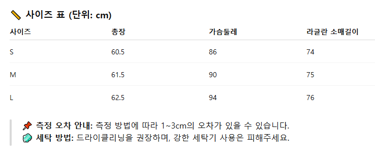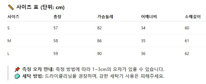 위의 사이즈 가이드는 참고용이며, 측정 방법에 따라 오차가 있을 수 있습니다.