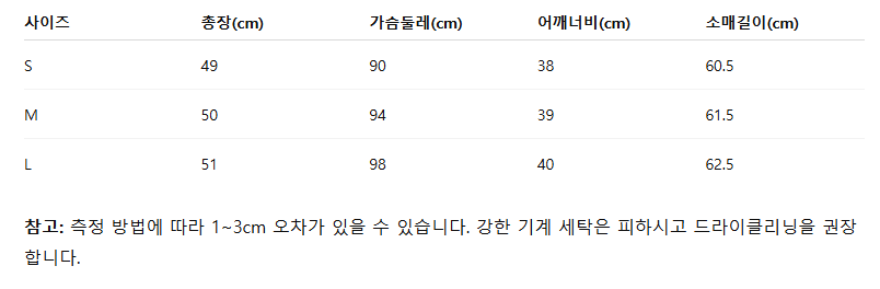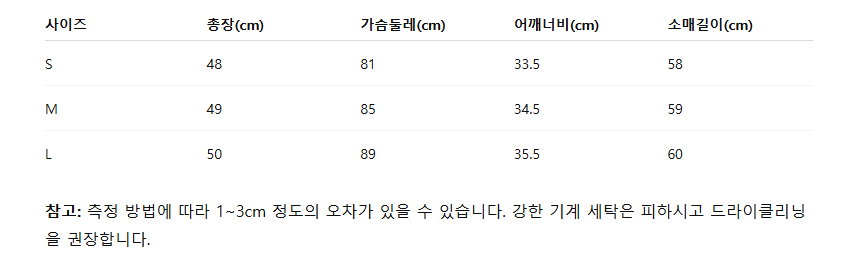 위의 사이즈 가이드는 참고용이며, 측정 방법에 따라 오차가 있을 수 있습니다.