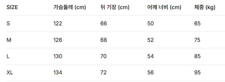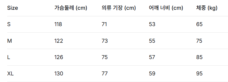 S 사이즈: 어깨 45cm, 가슴 102cm, 소매 62cm, 총장 73cm