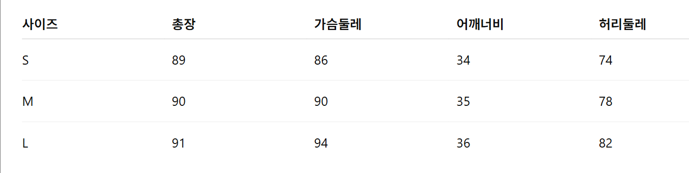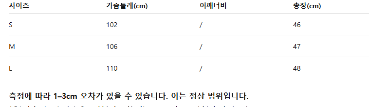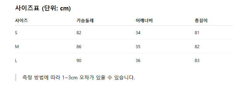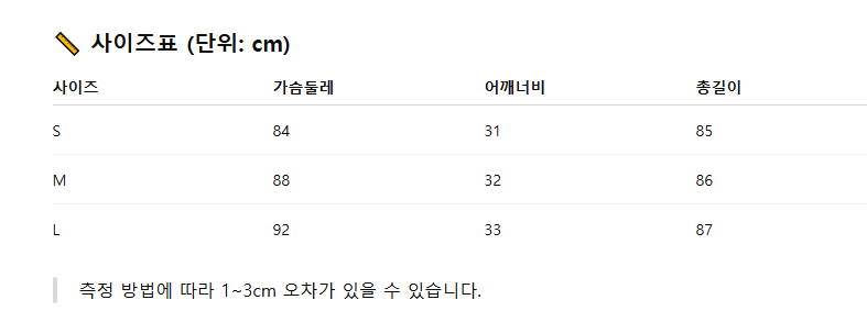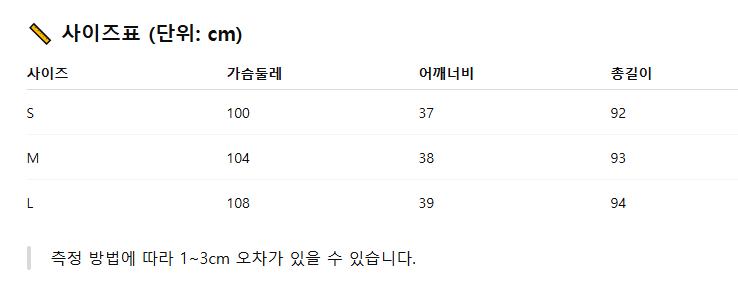 위의 사이즈 가이드는 참고용이며, 측정 방법에 따라 오차가 있을 수 있습니다.