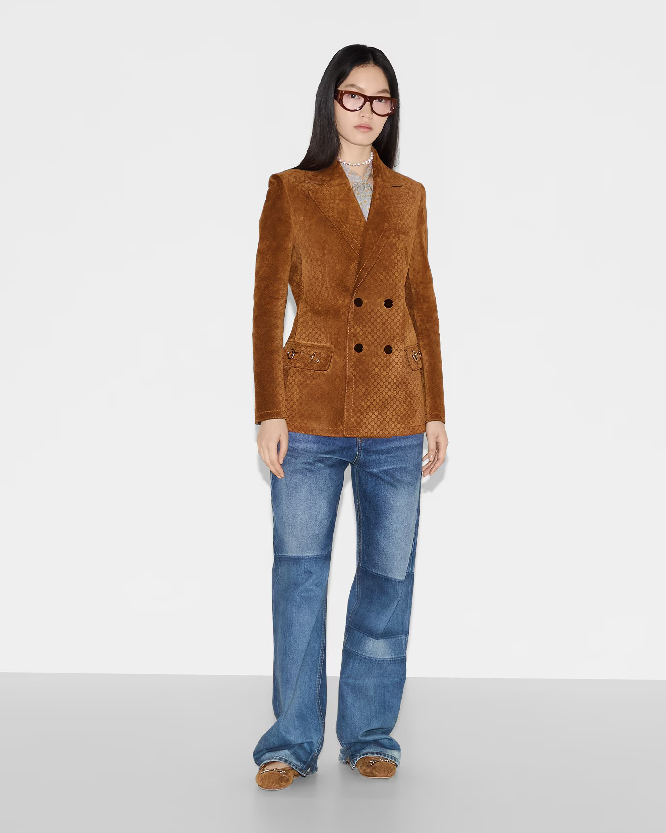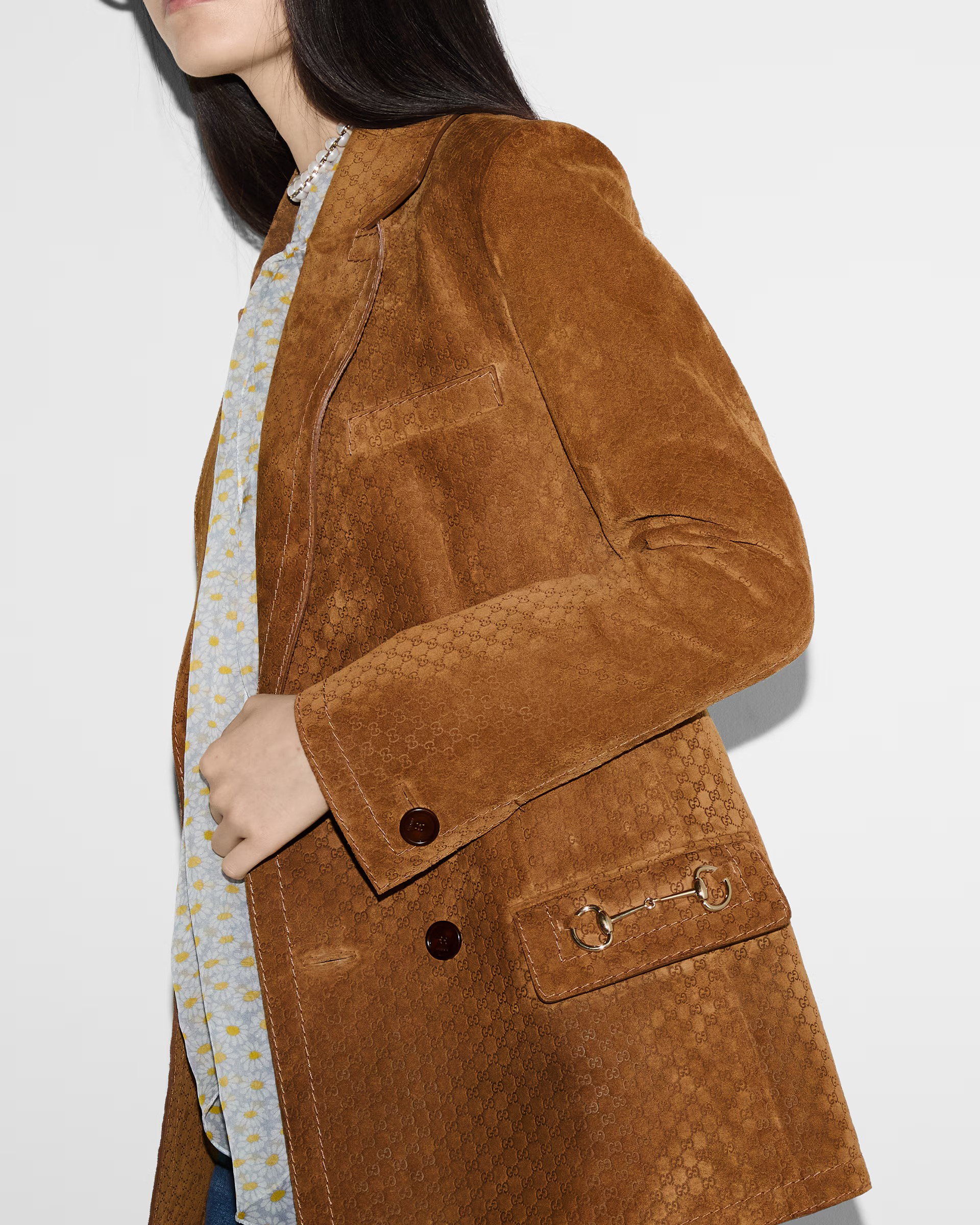 더블브레스티드 버튼과 플랩 포켓, 메탈 홀스빗 디테일이 구조적이고 클래식한 실루엣을 강조하며, 자연스러운 윤광이 도는 스웨이드 질감이 우아한 깊이를 더한다. 클래식함과 현대적인 세련미를 모두 지닌, 구찌 특유의 감성이 담긴 하이엔드 아우터다.
