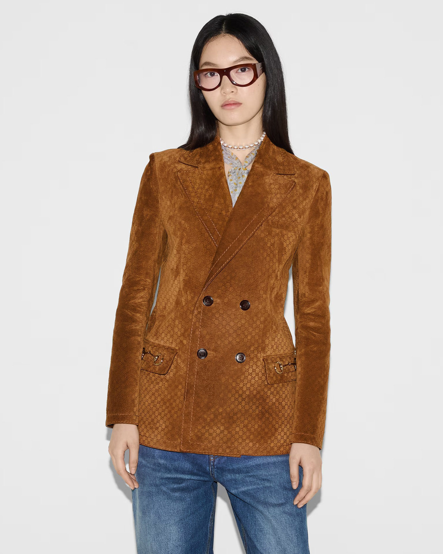 디테일: GG 모노그램 엠보싱 패턴, 더블브레스티드 버튼 클로징, 플랩 포켓, 메탈 홀스빗 장식
