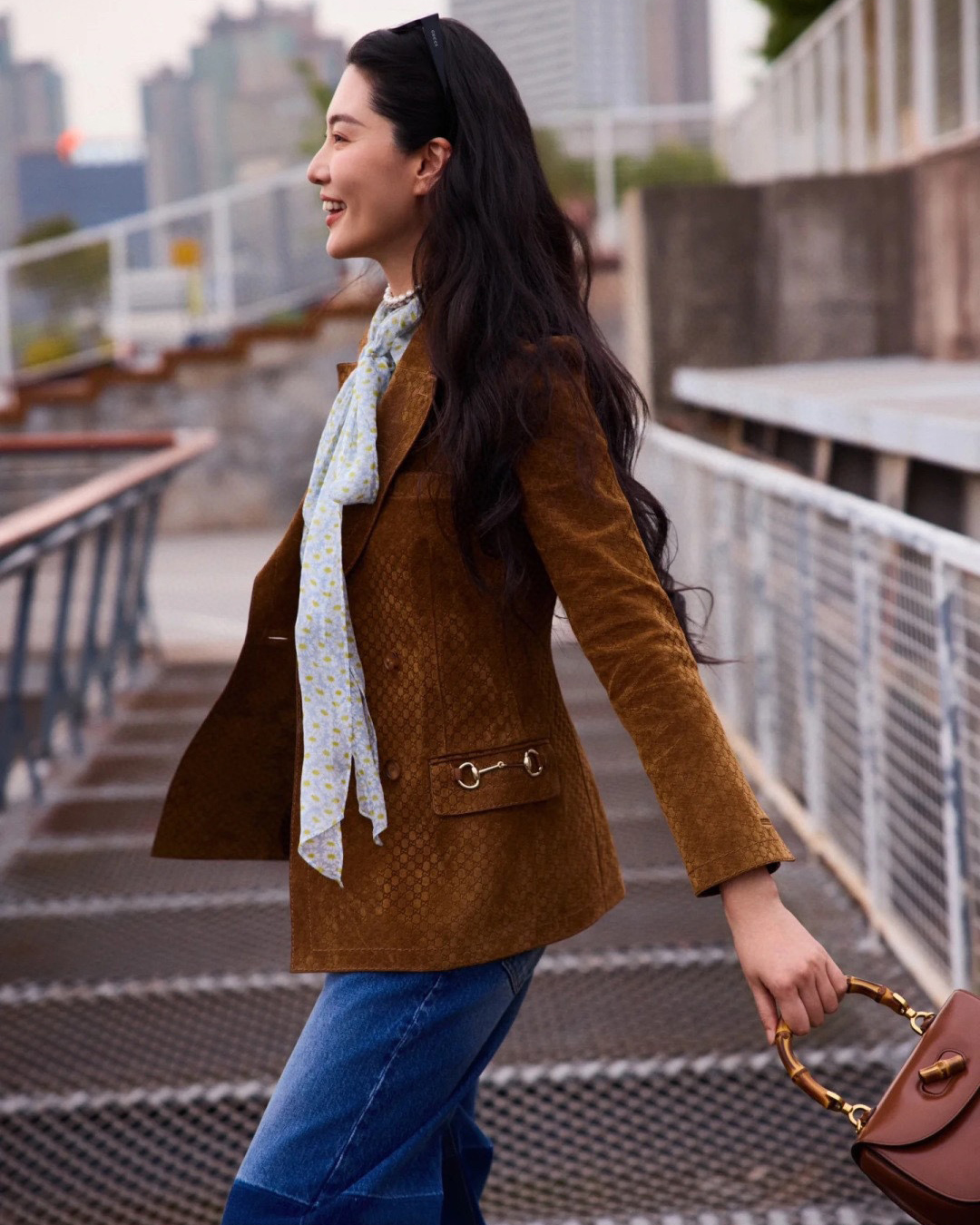 Gucci 2025 크루즈 아우터웨어 컬렉션의 여성용 스웨이드 재킷. 브랜드의 상징인 GG 모노그램이 정교하게 각인된 천연 스웨이드 소재로 제작되었으며, 깊고 따뜻한 브라운 컬러가 고급스러운 빈티지 감성을 완성한다.