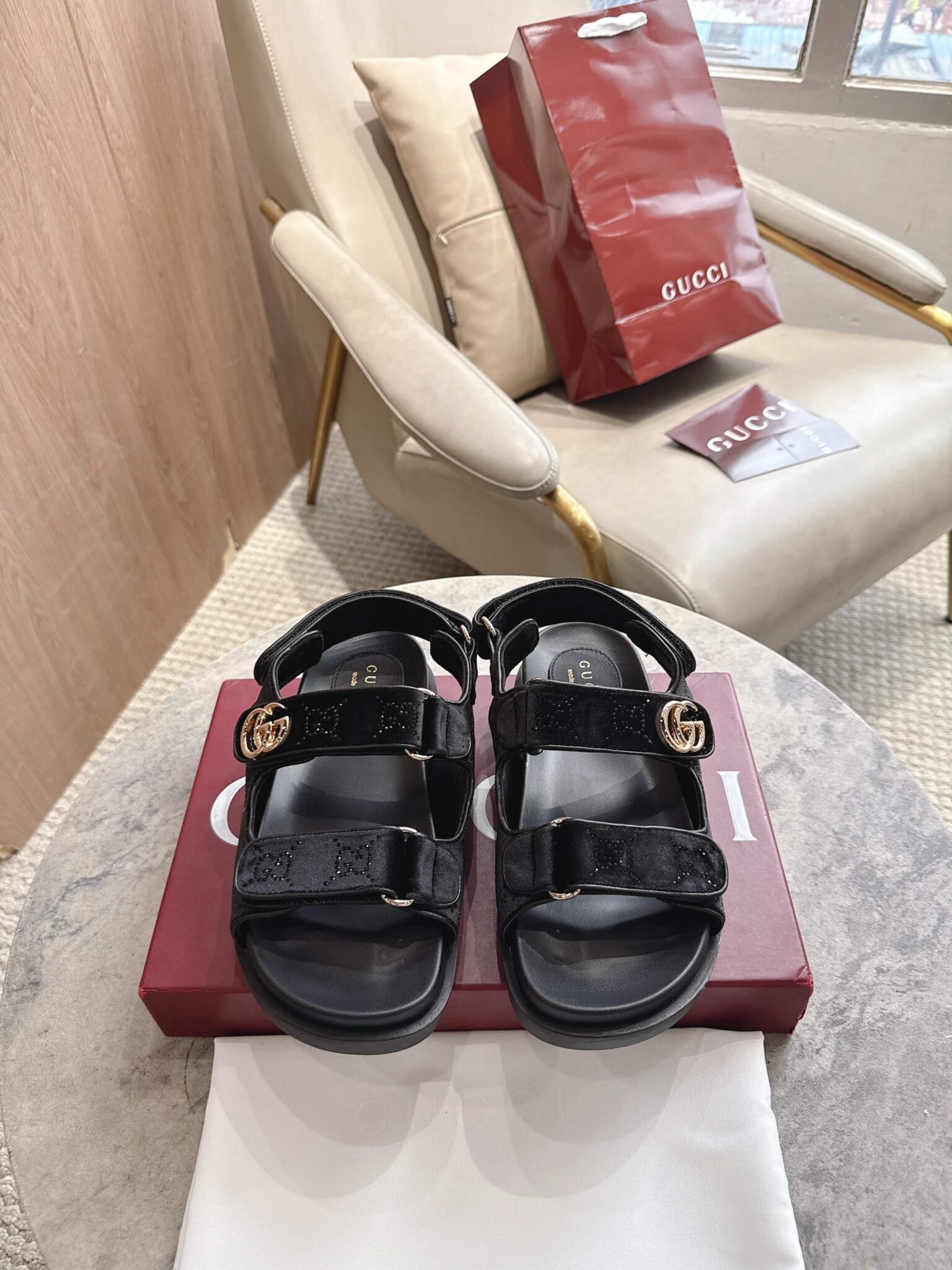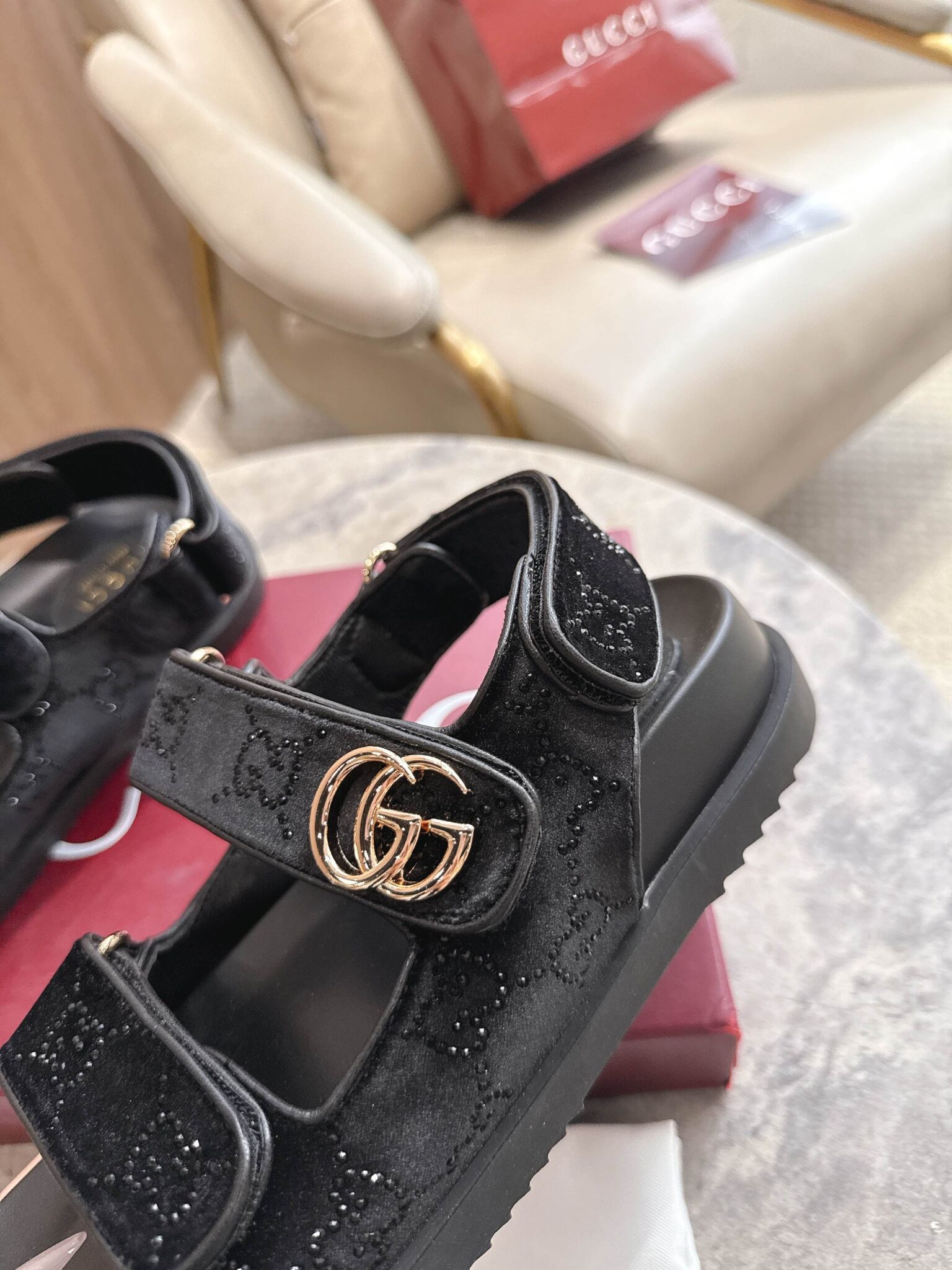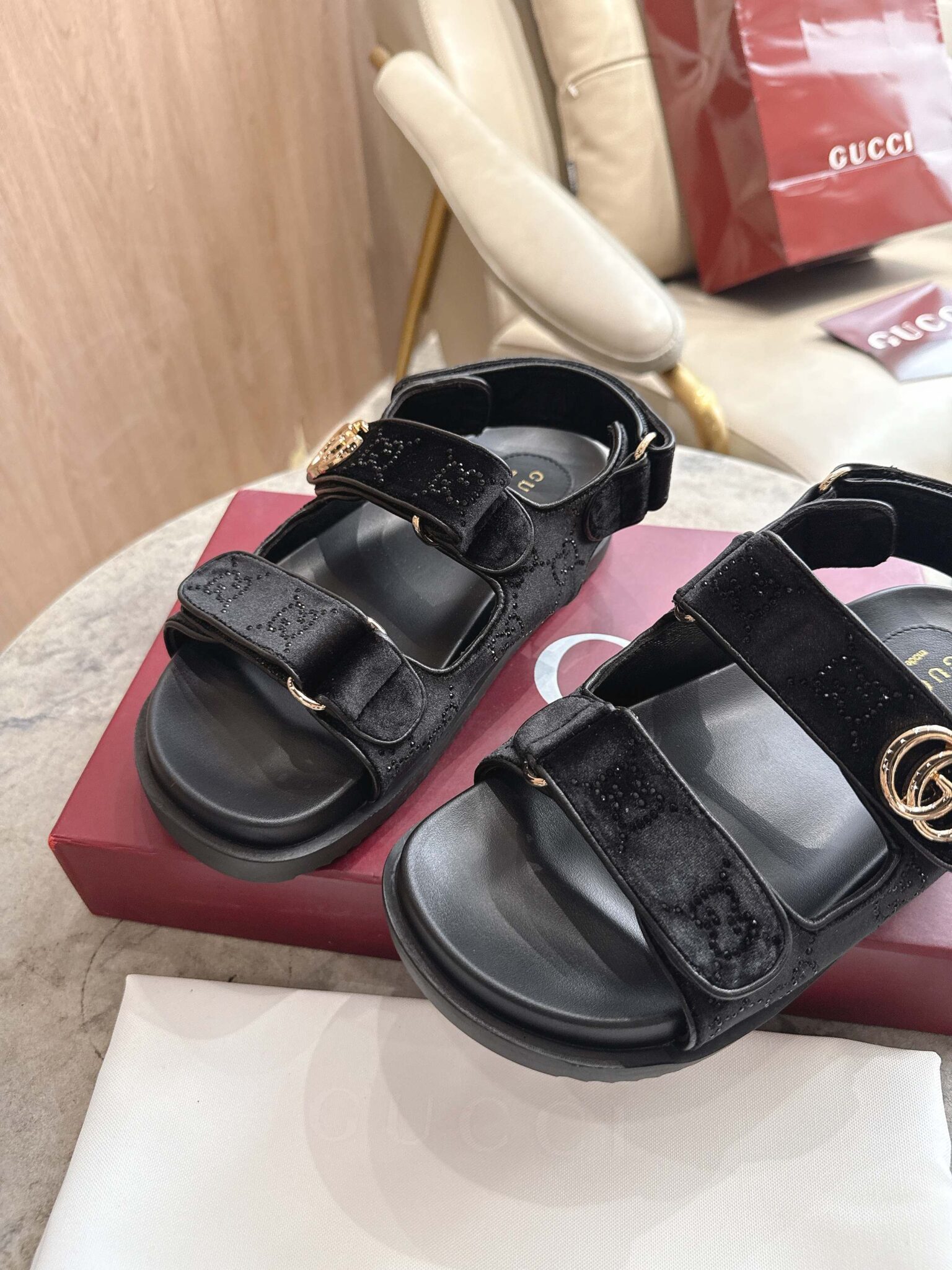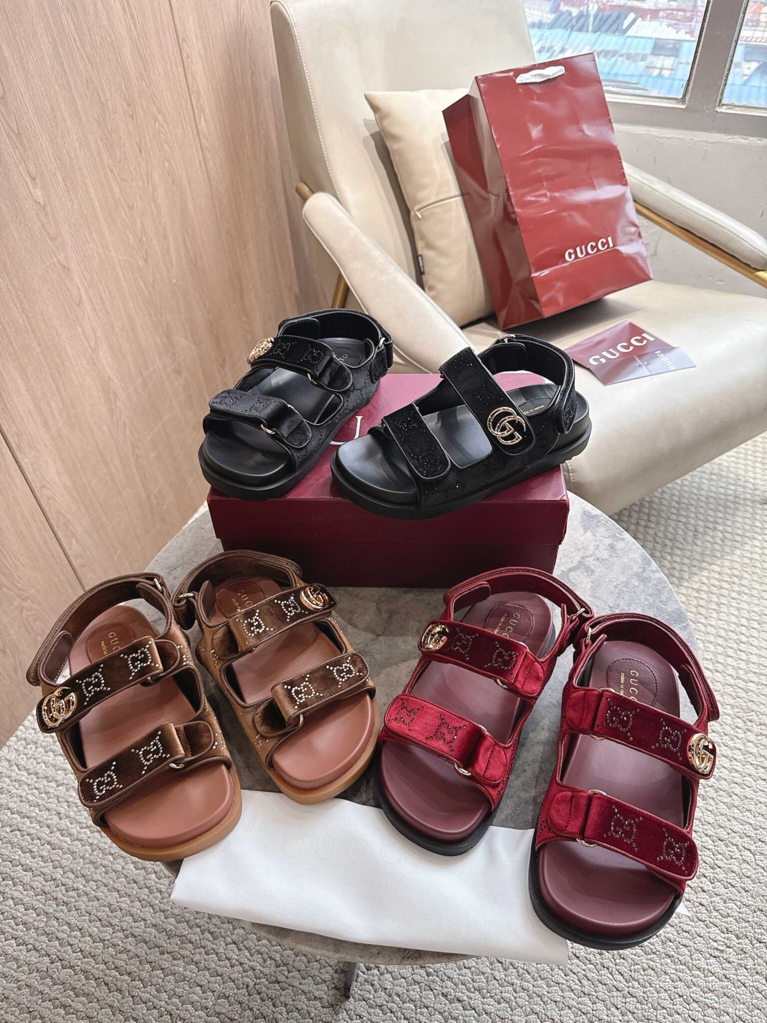 디자인: GG 크리스탈 벨벳 스트랩 샌들 (더블 G 로고 하드웨어 디테일, 조절 가능한 백 스트랩과 벨벳 소재의 조화가 고급스러운 컴포트 샌들)