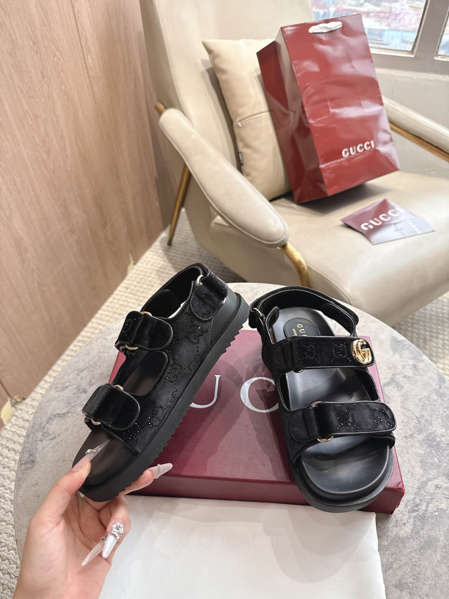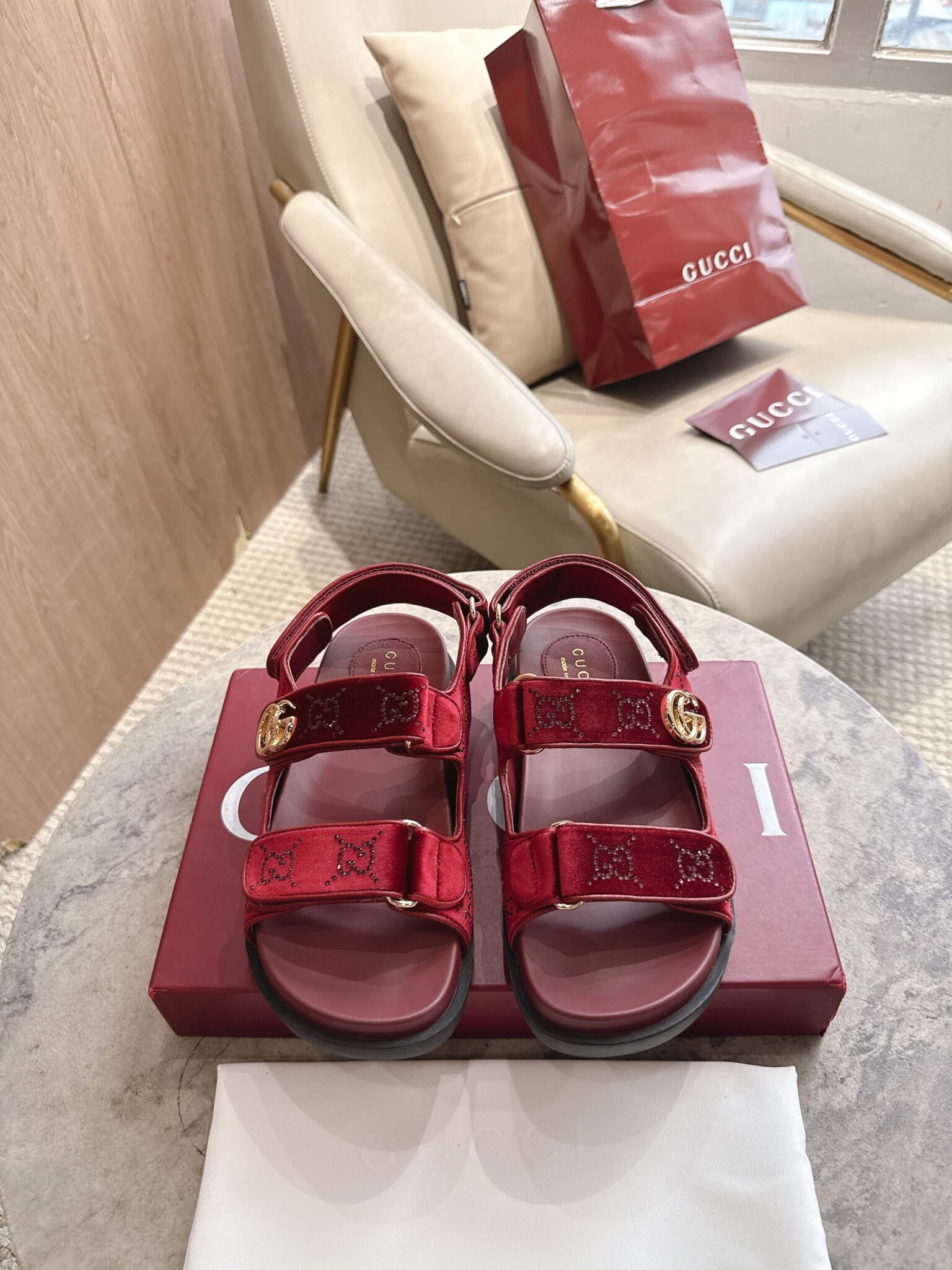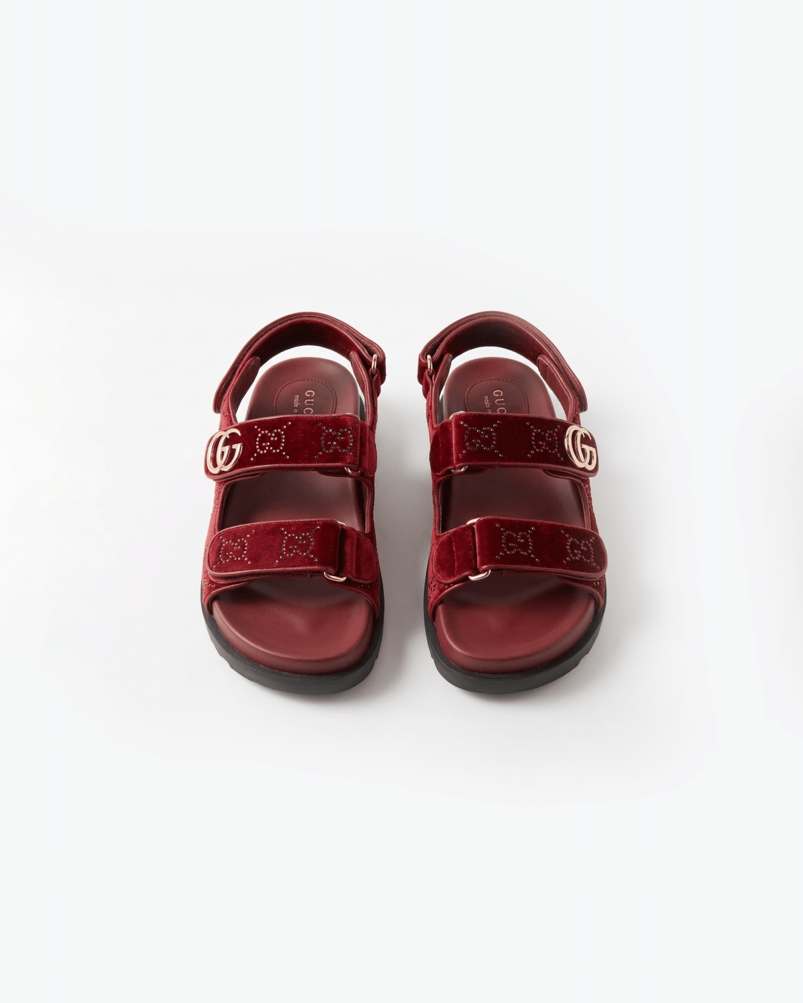 디자인: GG 크리스탈 벨벳 스트랩 샌들 (더블 G 로고 하드웨어 디테일, 조절 가능한 백 스트랩과 벨벳 소재의 조화가 고급스러운 컴포트 샌들)