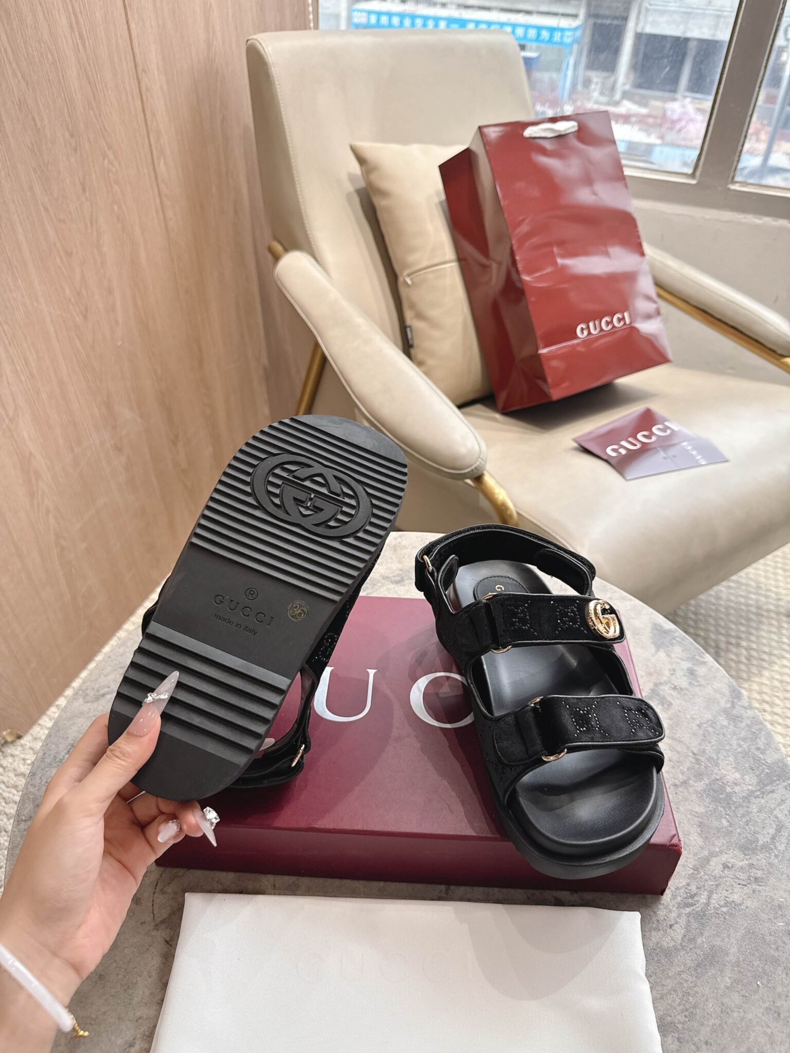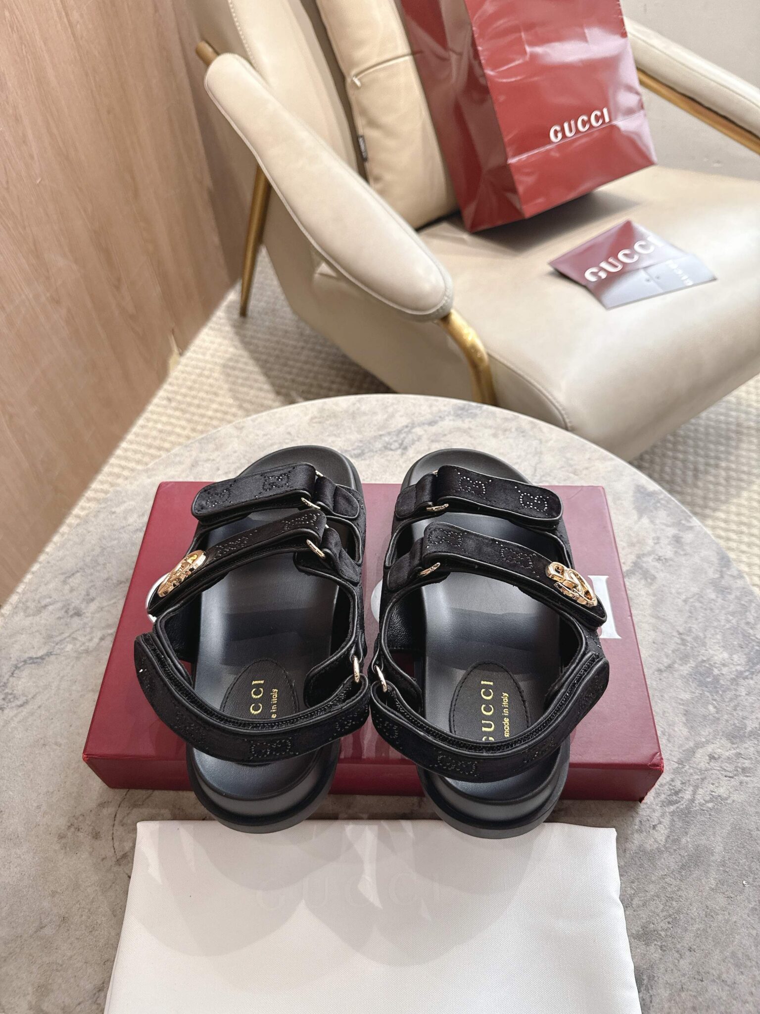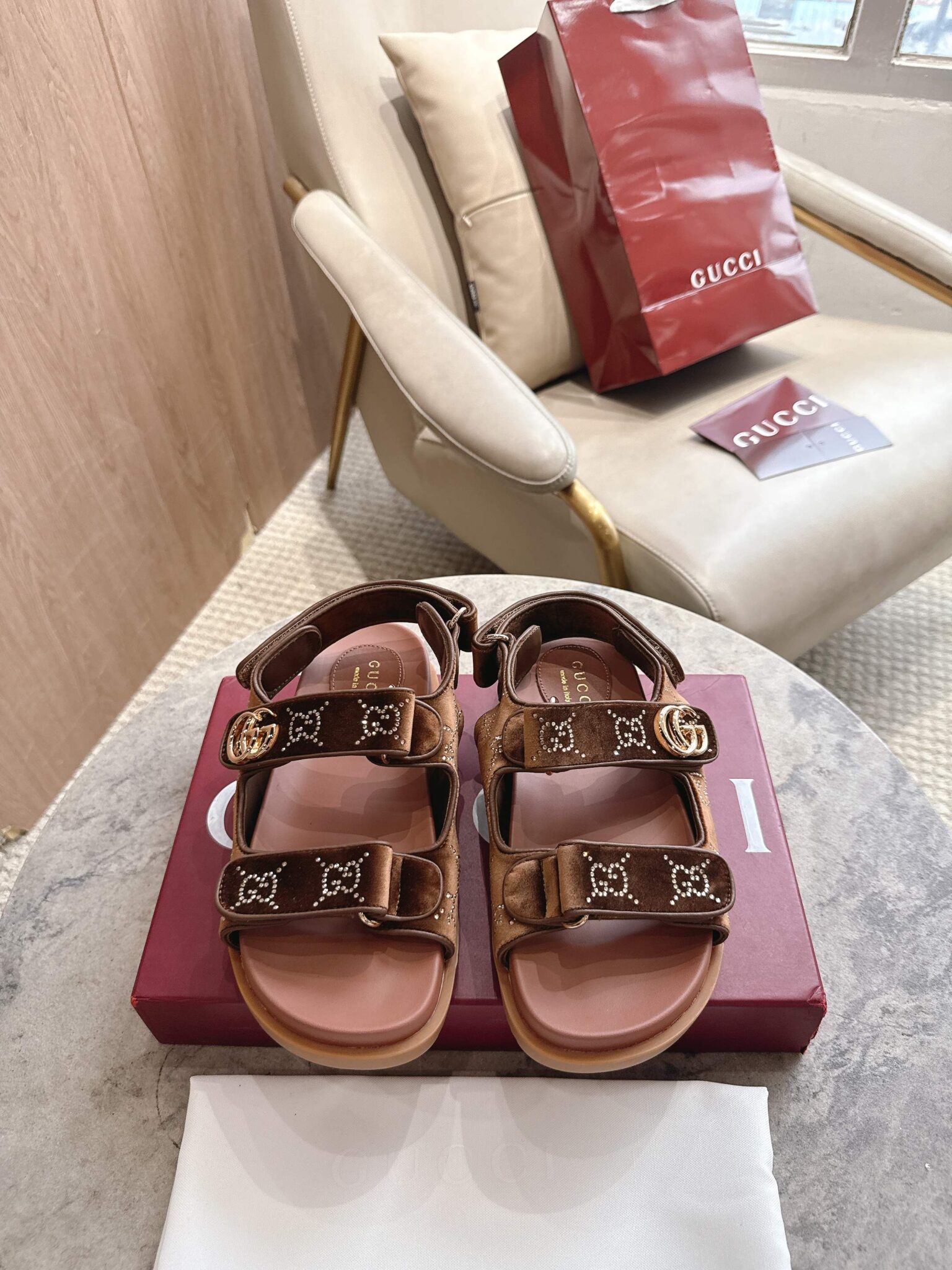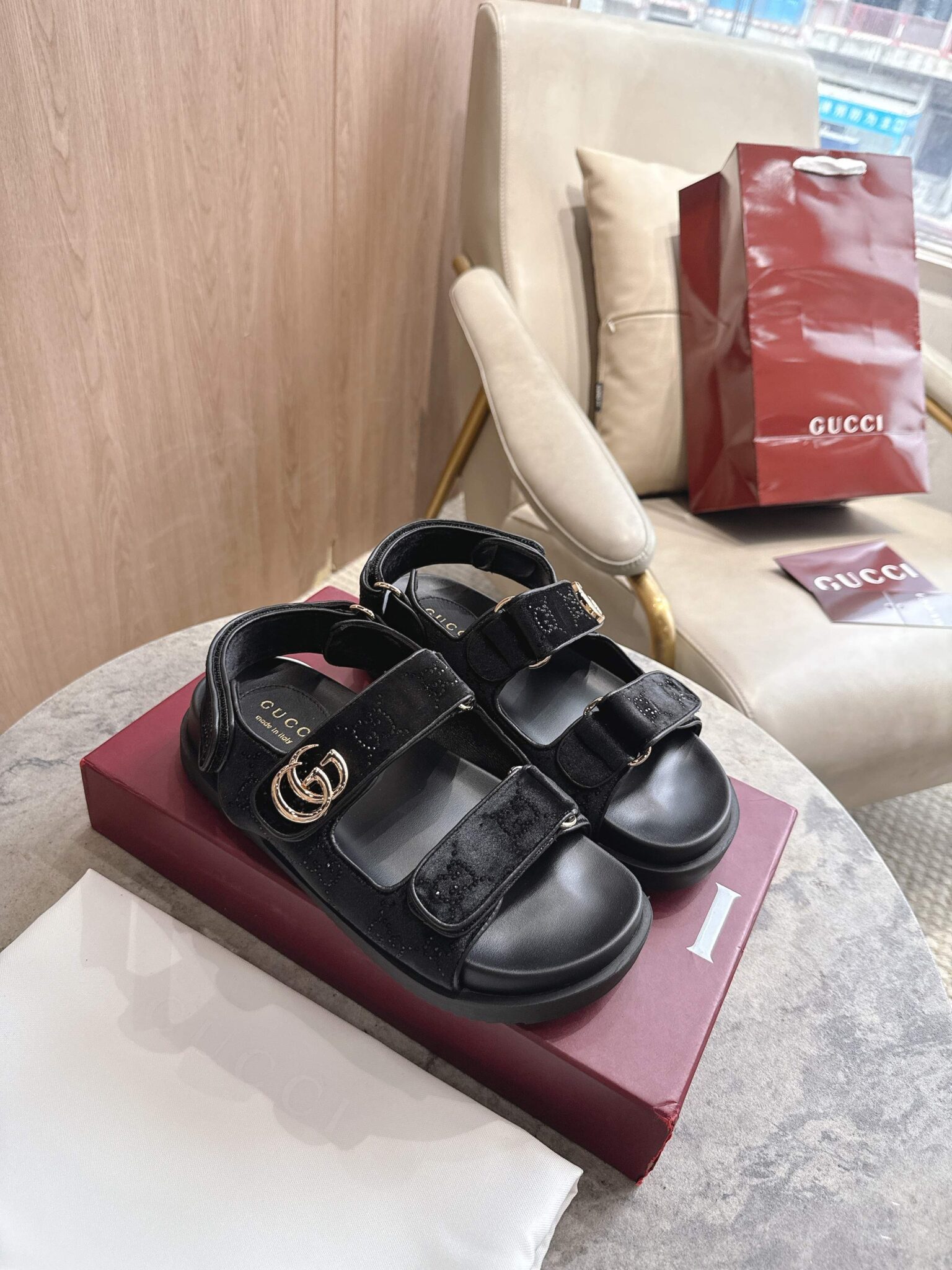 디자인: GG 크리스탈 벨벳 스트랩 샌들 (더블 G 로고 하드웨어 디테일, 조절 가능한 백 스트랩과 벨벳 소재의 조화가 고급스러운 컴포트 샌들)