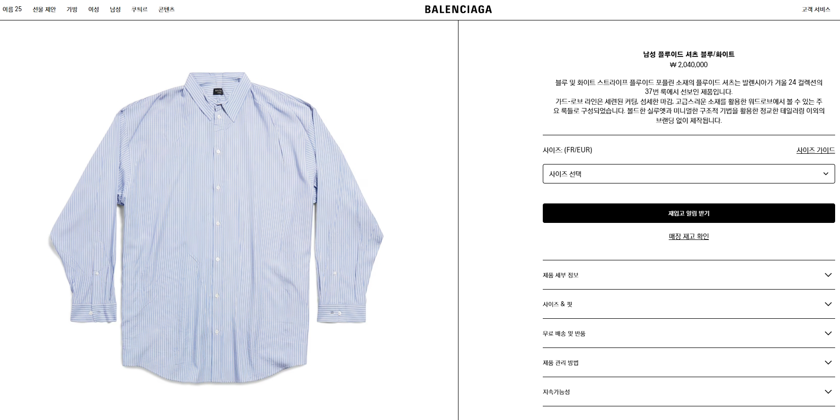 [발렌시아가] 남성 플루이드 셔츠 블루/화이트 809007TRLE94640