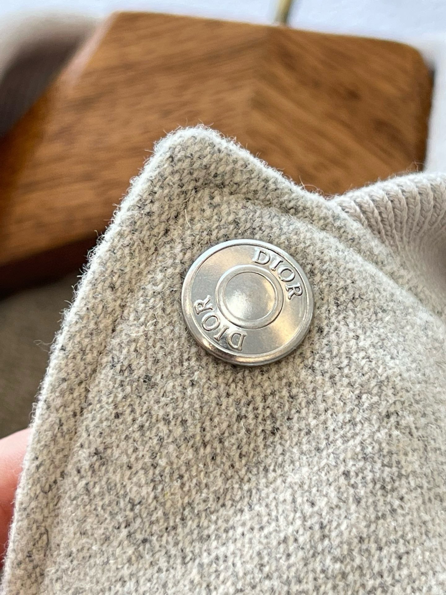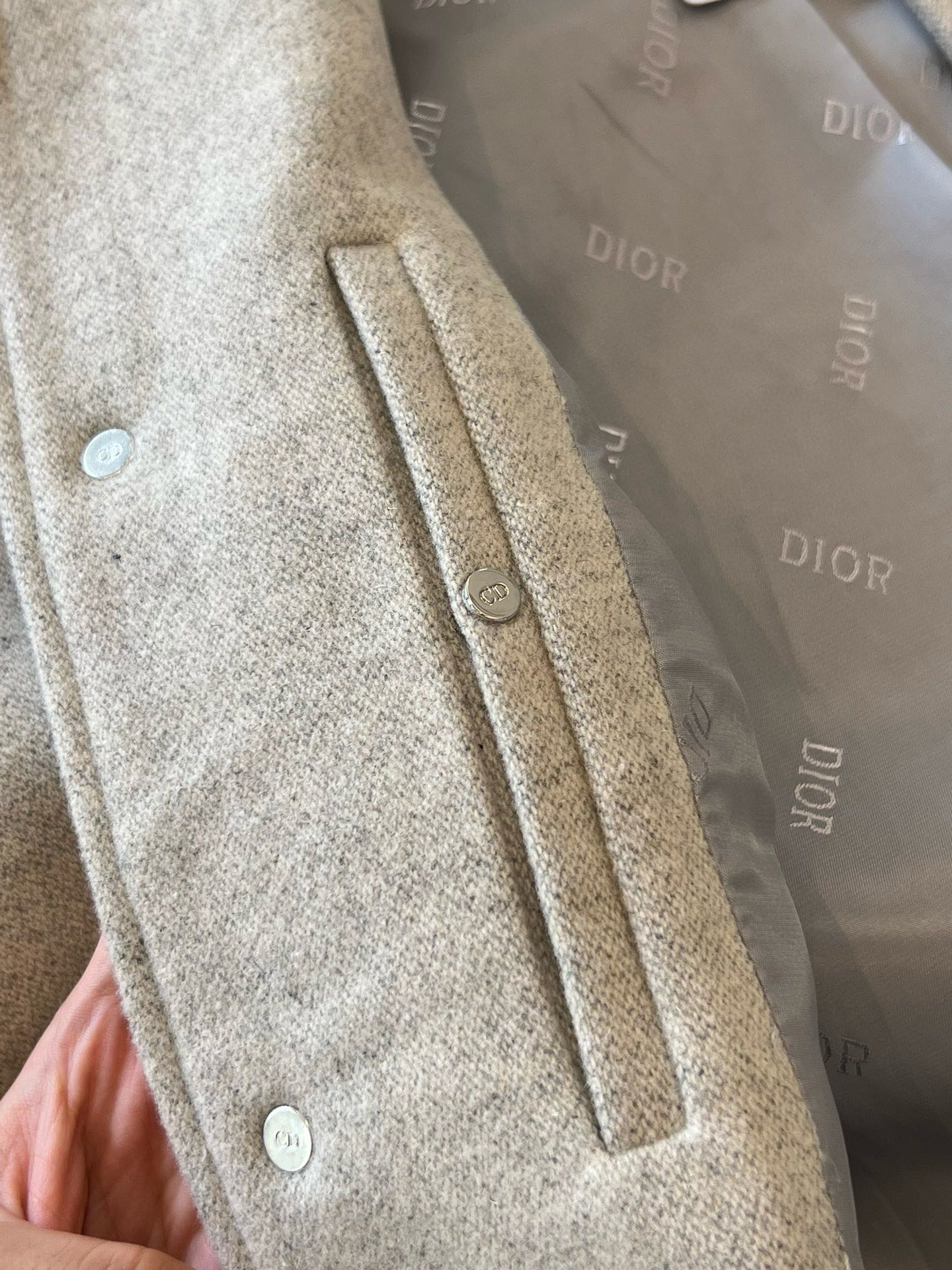 디테일: 스냅 버튼 여밈, 리브 처리된 칼라·소맷단·밑단, 곡선형 웰트 포켓, 후면 Dior Couture 자수 로고
