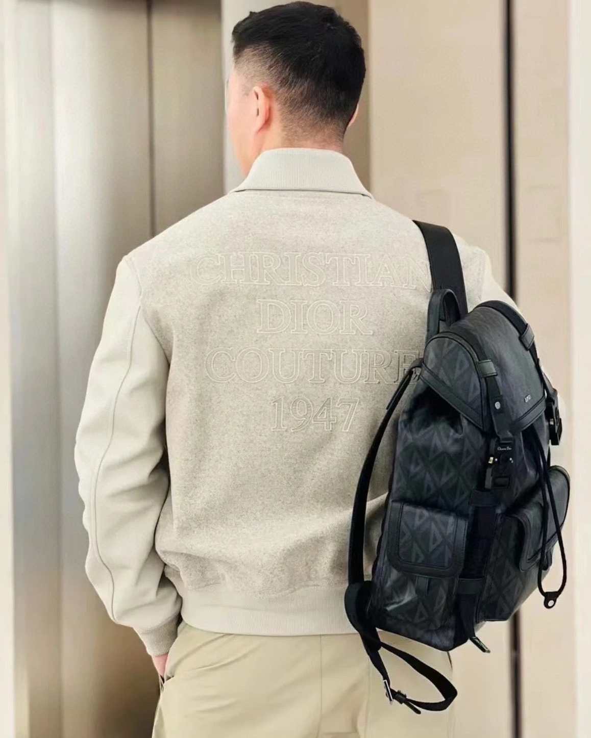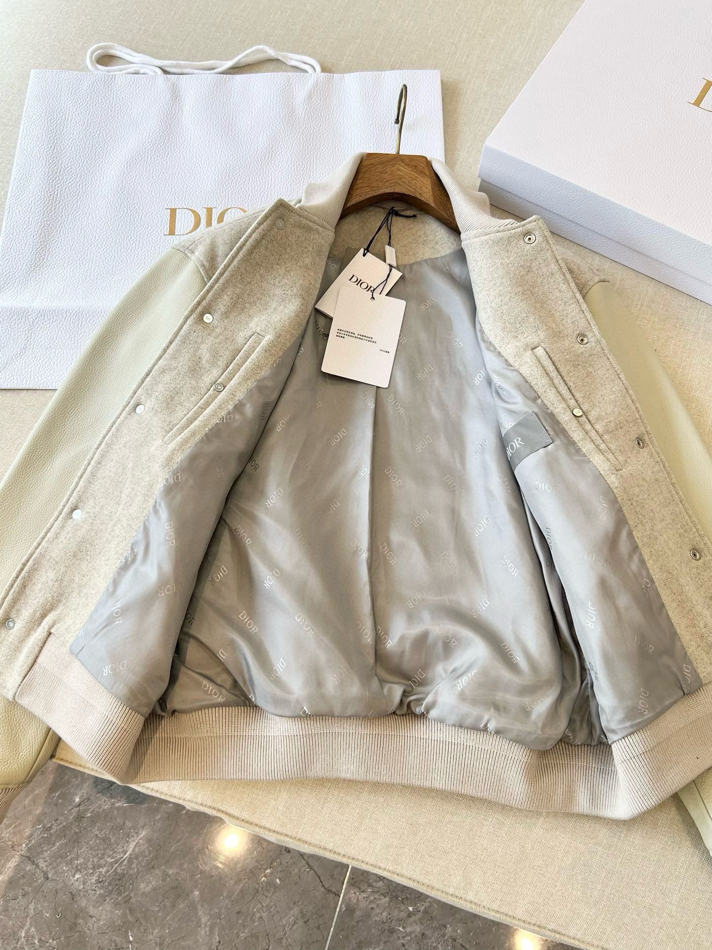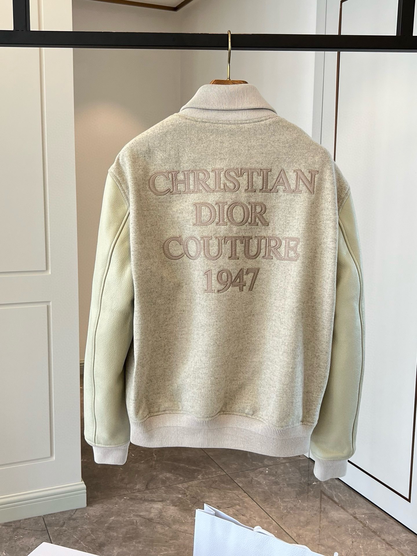 리브 처리된 칼라와 밑단이 클래식한 실루엣을 완성하고, 뒷면에 정교하게 수놓인 “Christian Dior Couture 1947” 자수 로고가 브랜드의 장인정신을 상징합니다. 세련된 뉴트럴 톤 컬러와 미니멀한 디자인으로 포멀룩부터 캐주얼까지 폭넓게 스타일링 가능한 하이엔드 블루종입니다.