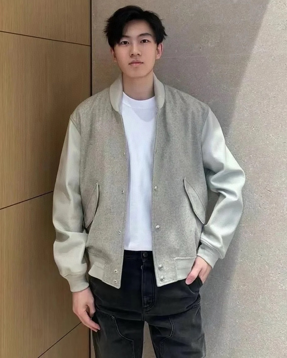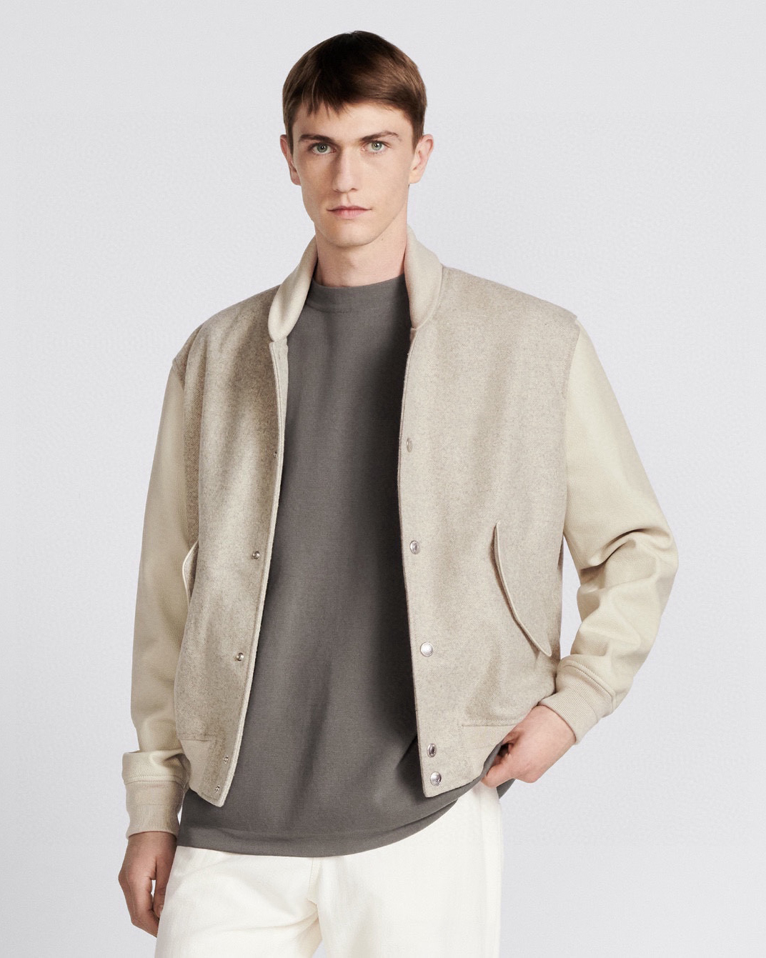 Dior 2024 가을·겨울 남성복 컬렉션의 시그니처 아이템인 카프스킨 바시티 재킷입니다. 부드럽고 은은한 윤기의 천연 송아지 가죽이 어깨와 소매에 사용되어 고급스러운 질감과 견고한 구조감을 선사하며, 바디 부분의 울 혼방 패브릭이 따뜻함과 편안함을 더합니다.