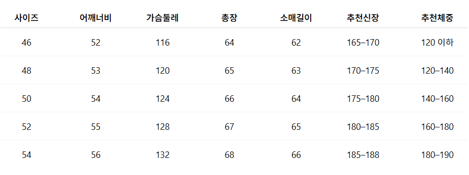 사이즈: 46 / 48 / 50 / 52 / 54
