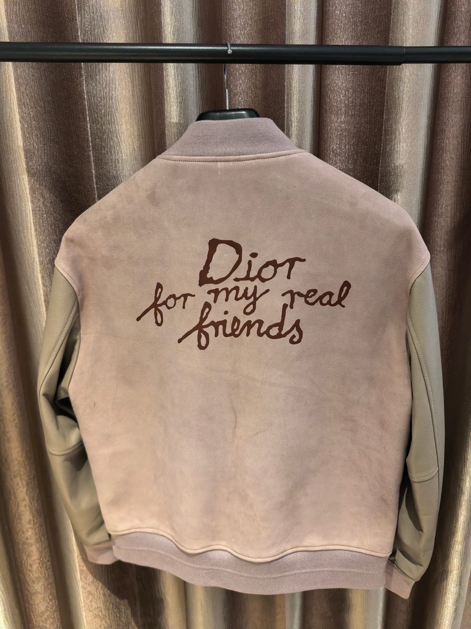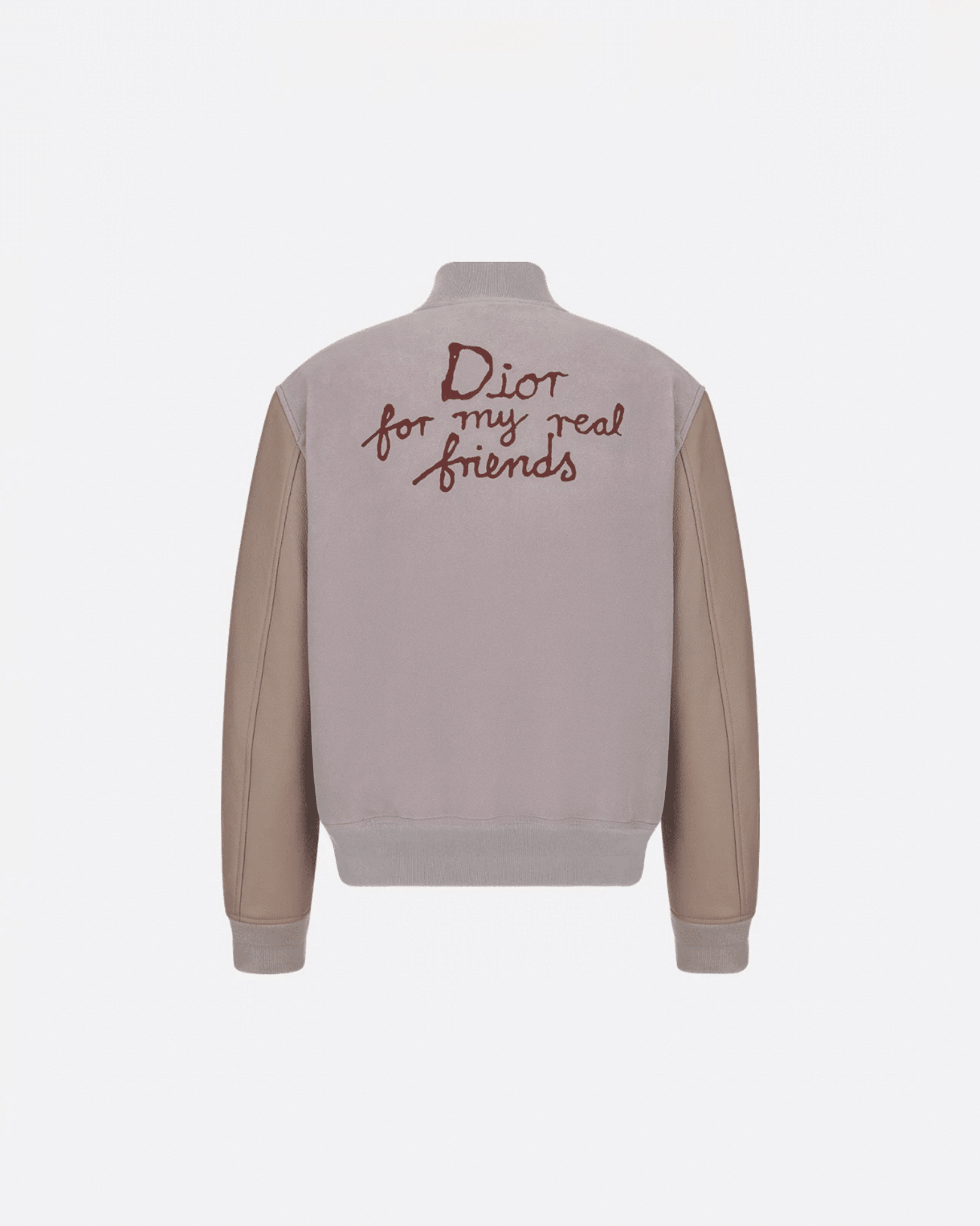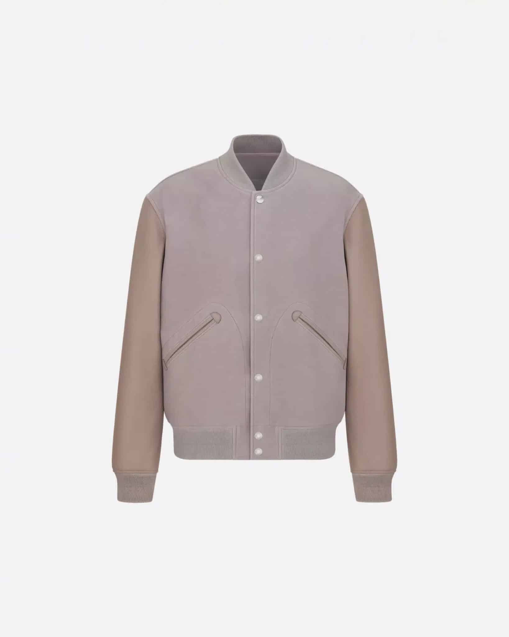 Dior 2025 SS 컬렉션의 DIOR AND HYLTON NEL 레더 바시티 재킷으로, 현대적인 아트 감성과 하이엔드 레더 크래프트가 결합된 남성 아우터이다. 차분하고 세련된 더스티 로즈 컬러의 스웨이드 바디와 부드러운 천연 가죽 슬리브가 조화를 이루어 고급스러운 텍스처 대비를 완성한다.