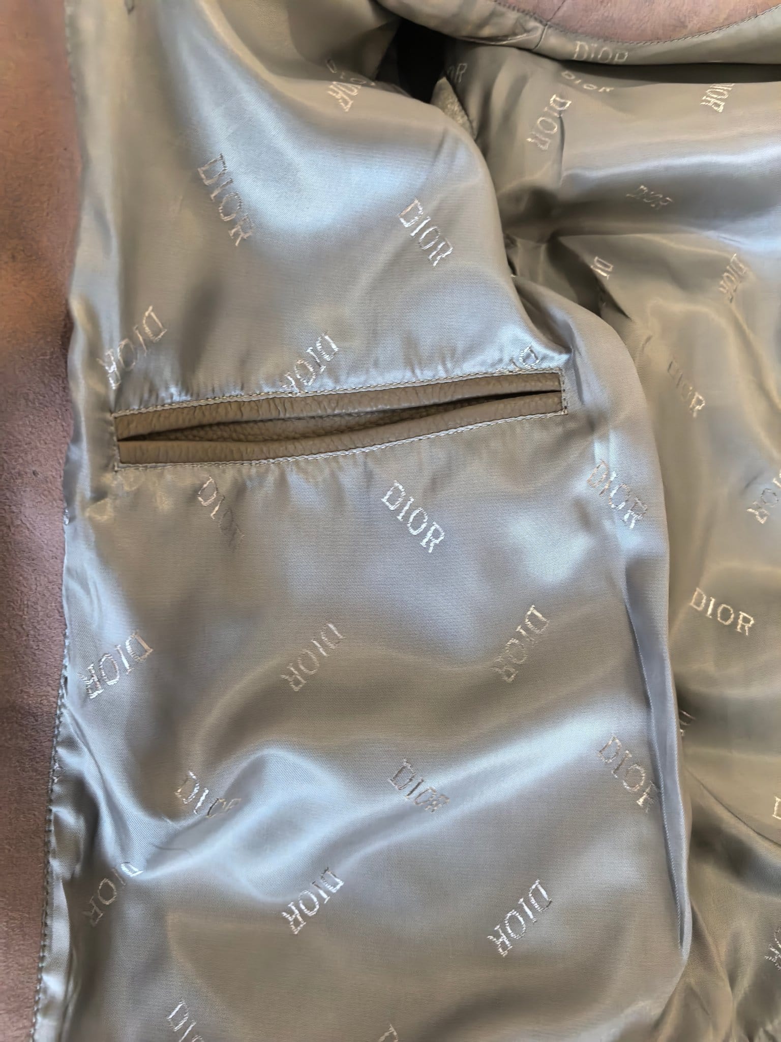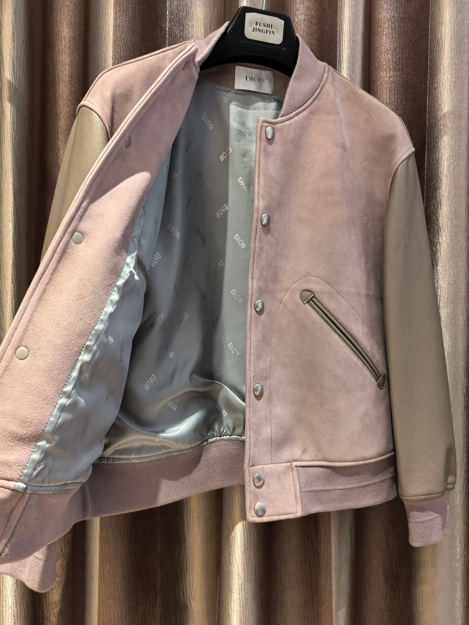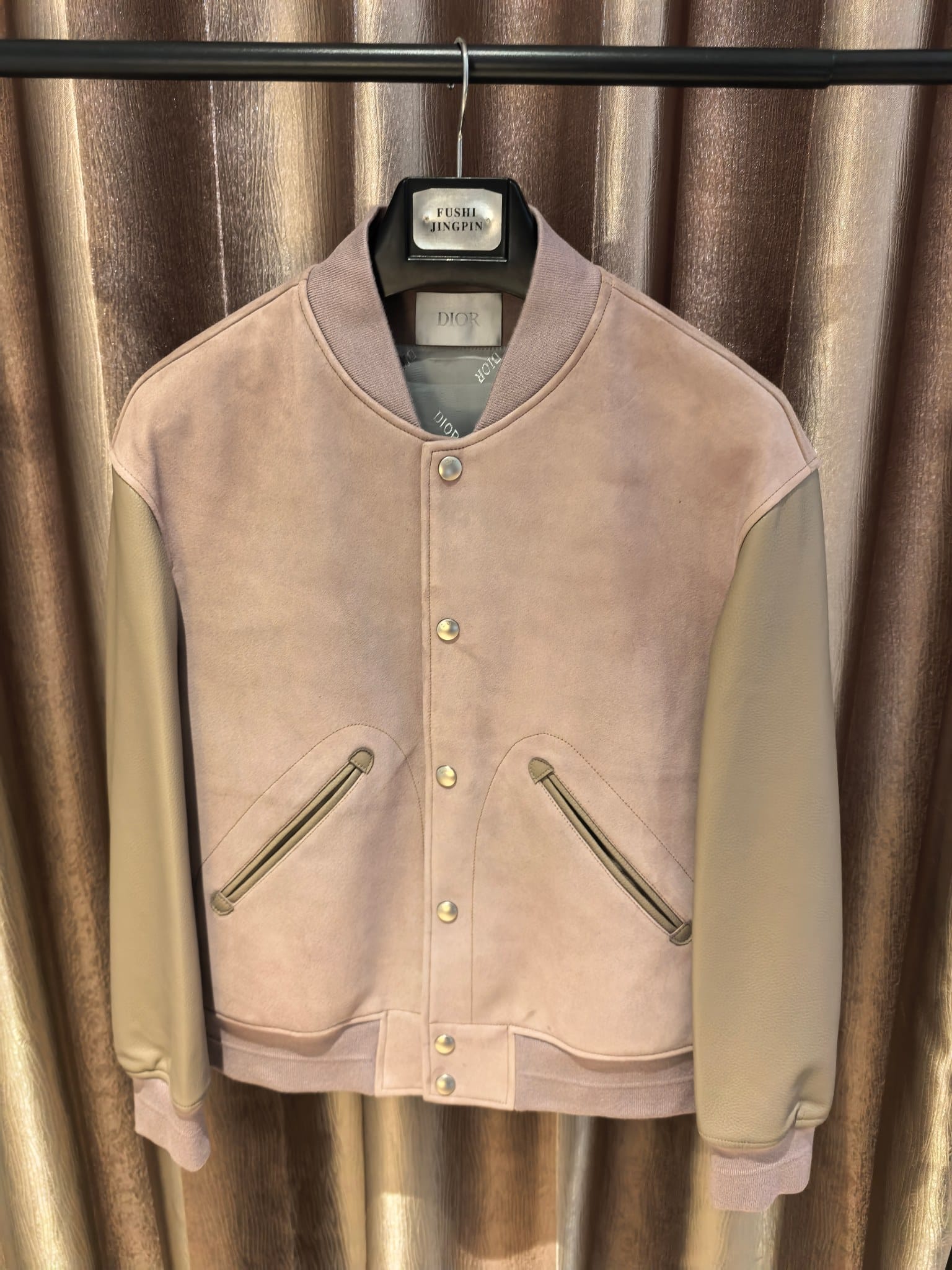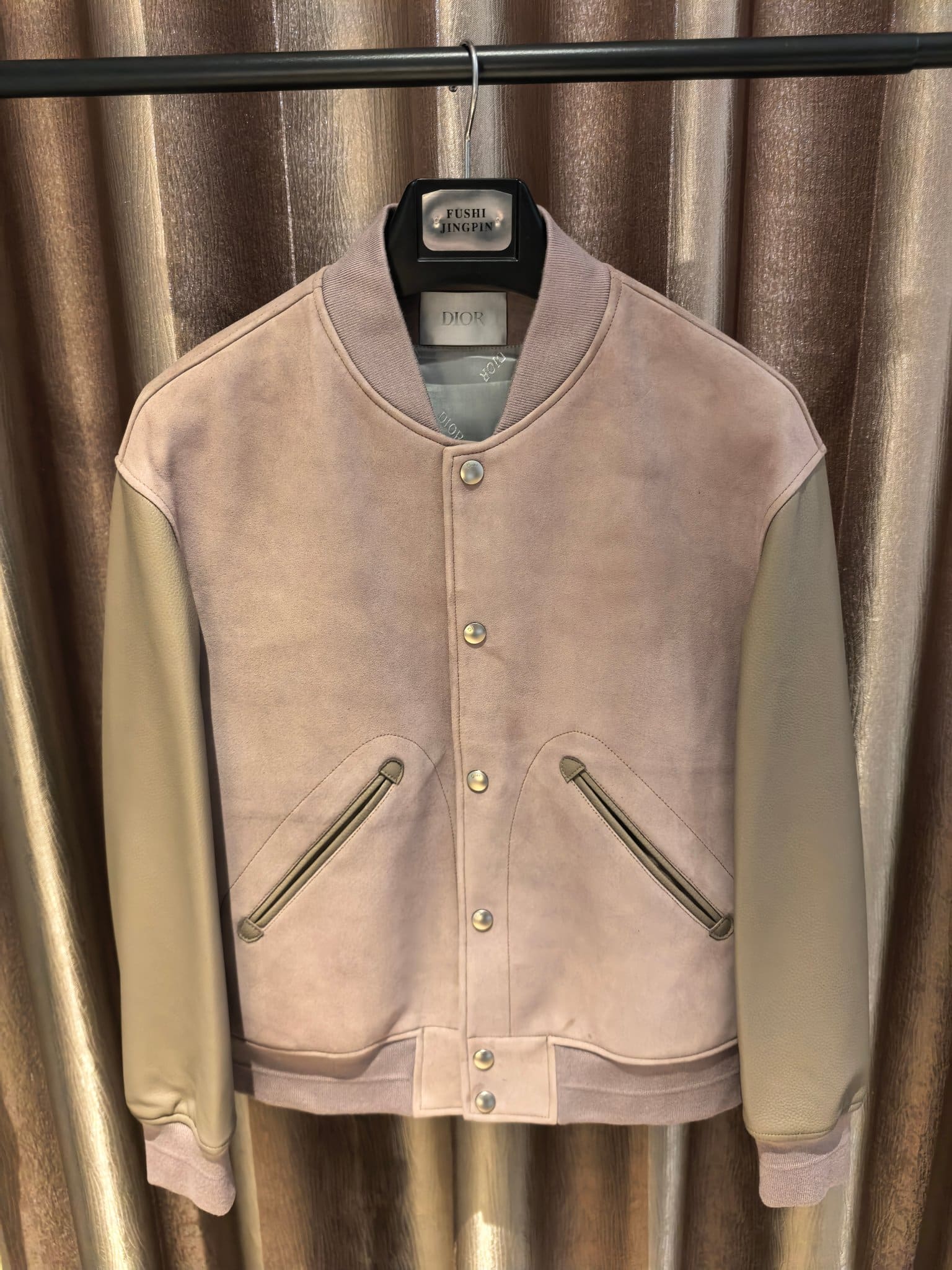 Dior 2025 SS 컬렉션의 DIOR AND HYLTON NEL 레더 바시티 재킷으로, 현대적인 아트 감성과 하이엔드 레더 크래프트가 결합된 남성 아우터이다. 차분하고 세련된 더스티 로즈 컬러의 스웨이드 바디와 부드러운 천연 가죽 슬리브가 조화를 이루어 고급스러운 텍스처 대비를 완성한다.