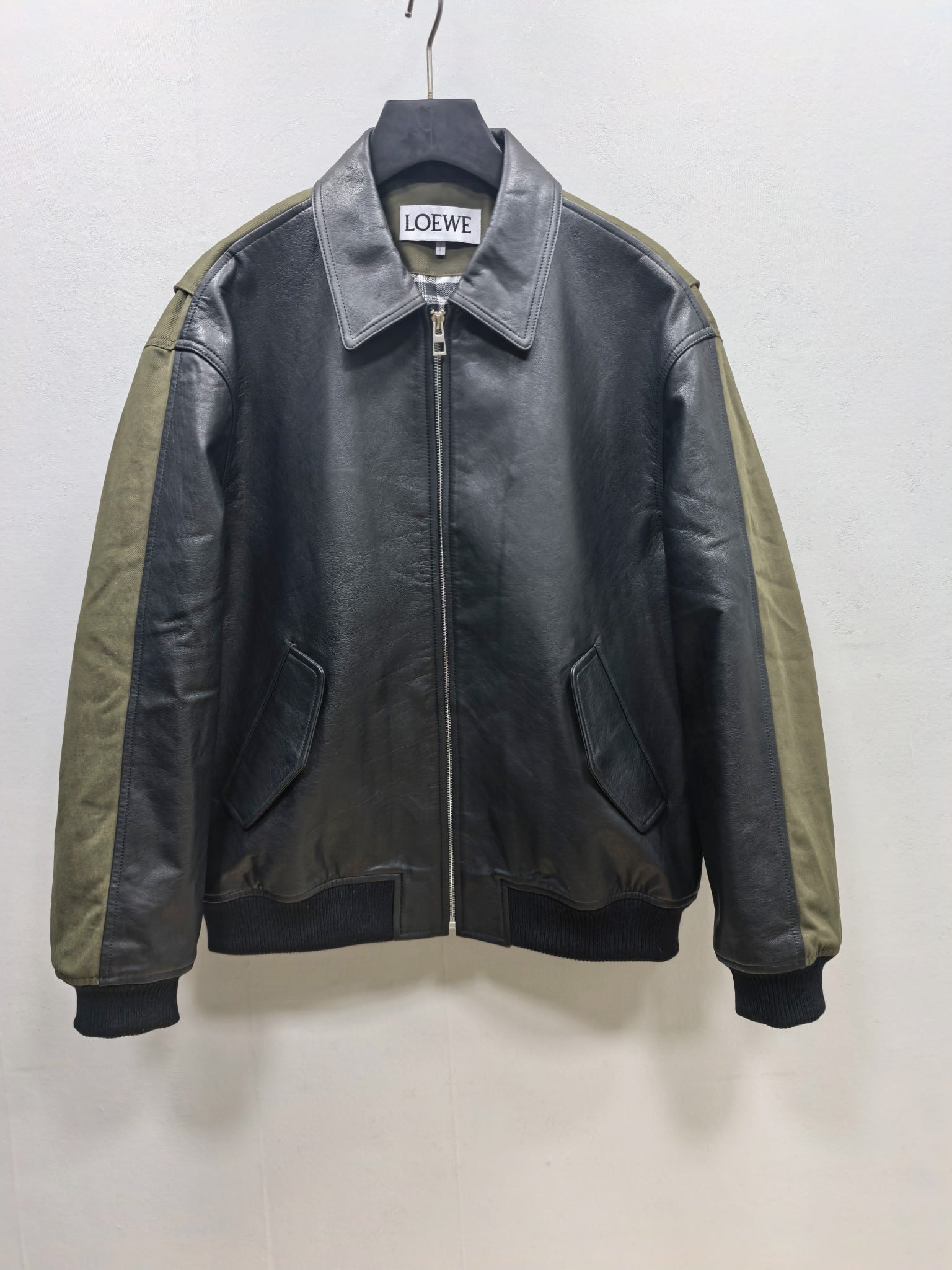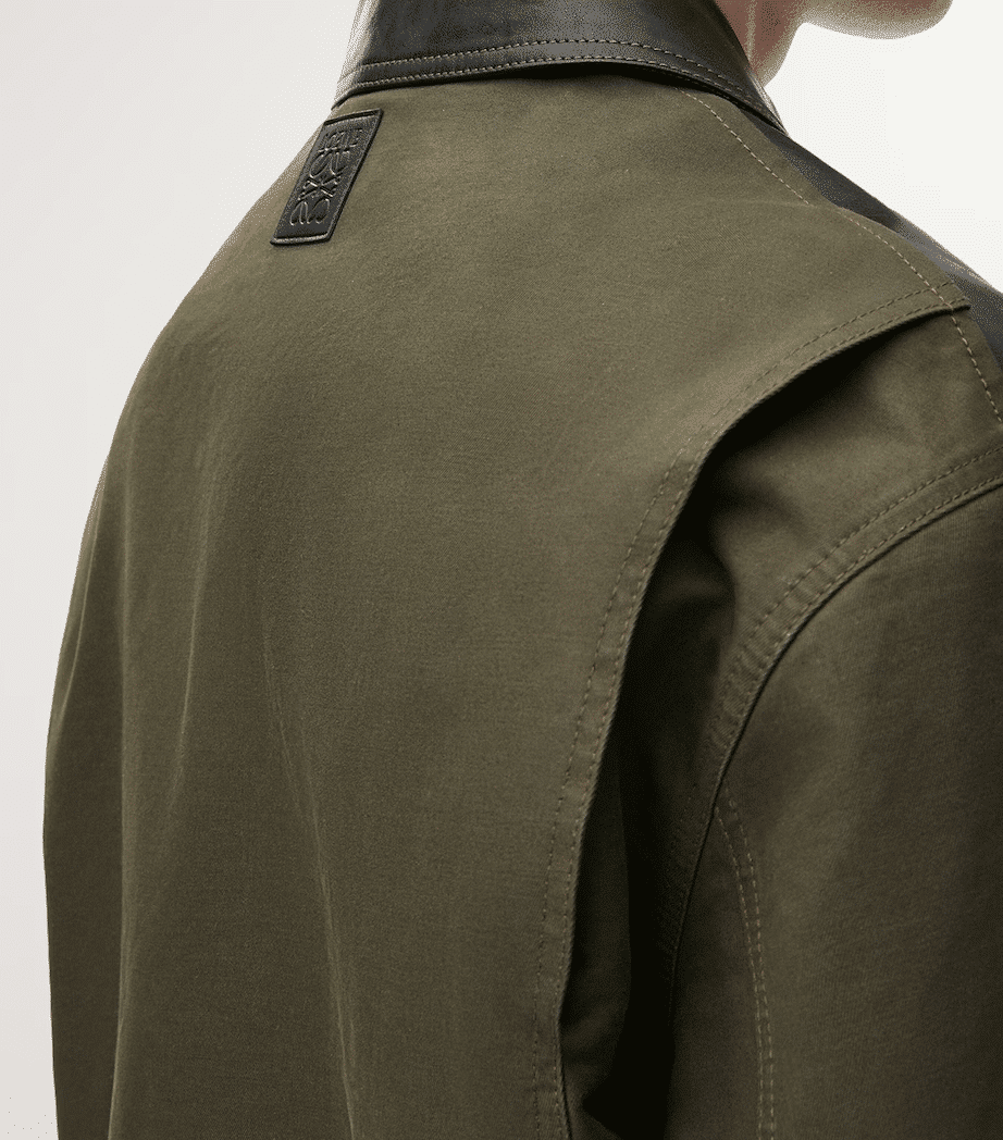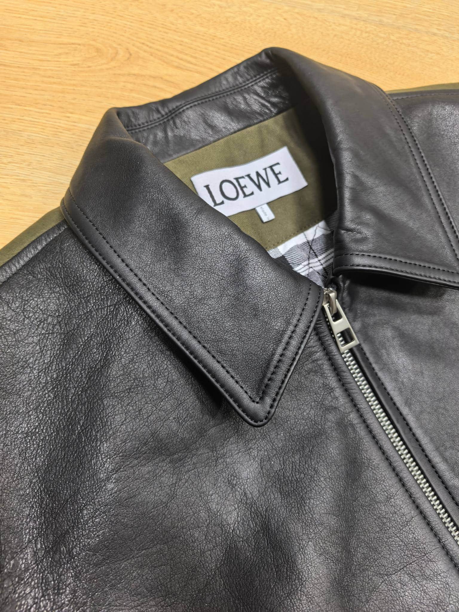 로에베의 2025년 최신 컬렉션으로 선보이는 믹스 미디어 자켓입니다. 전면의 매끄러운 천연 가죽과 소매 및 후면의 탄탄한 패브릭 소재가 조화를 이루어, 브랜드 특유의 아티스틱하면서도 실용적인 워크웨어 무드를 현대적으로 재해석했습니다.