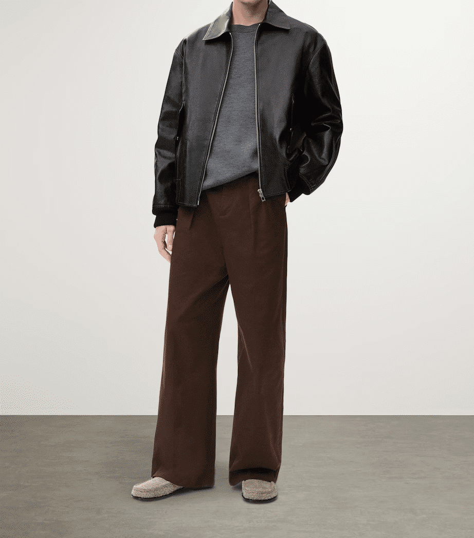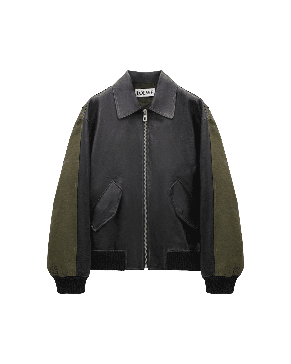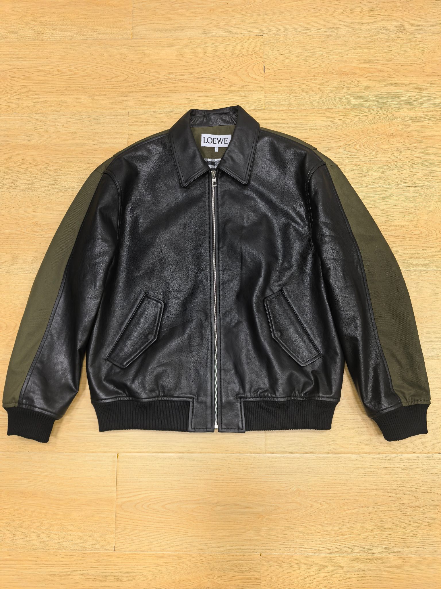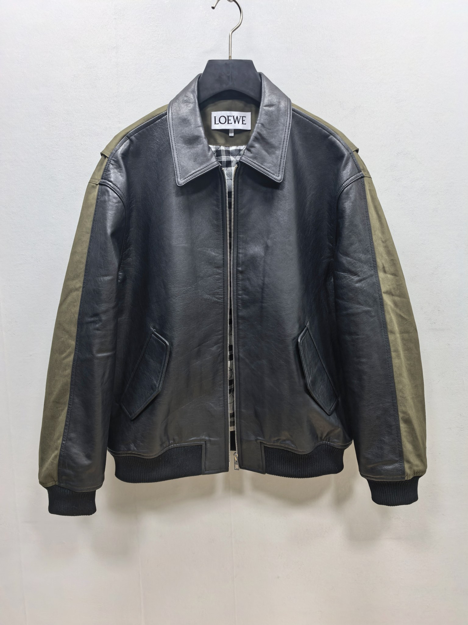 로에베의 2025년 최신 컬렉션으로 선보이는 믹스 미디어 자켓입니다. 전면의 매끄러운 천연 가죽과 소매 및 후면의 탄탄한 패브릭 소재가 조화를 이루어, 브랜드 특유의 아티스틱하면서도 실용적인 워크웨어 무드를 현대적으로 재해석했습니다.