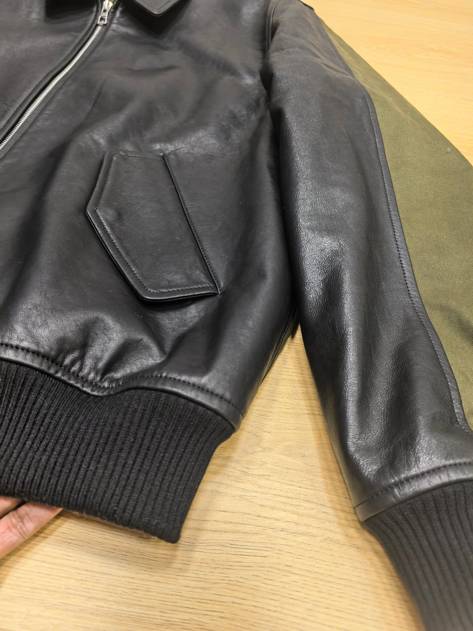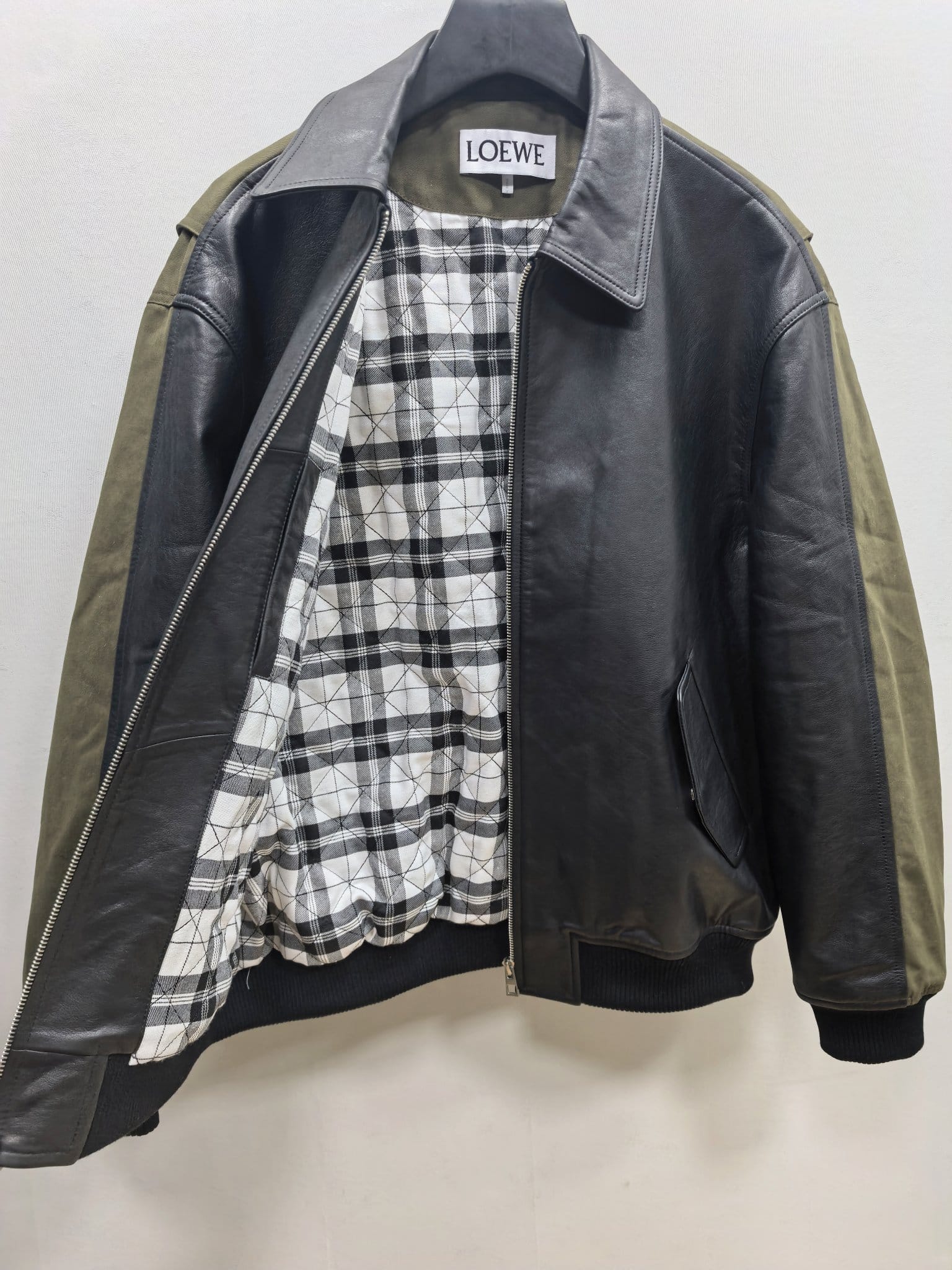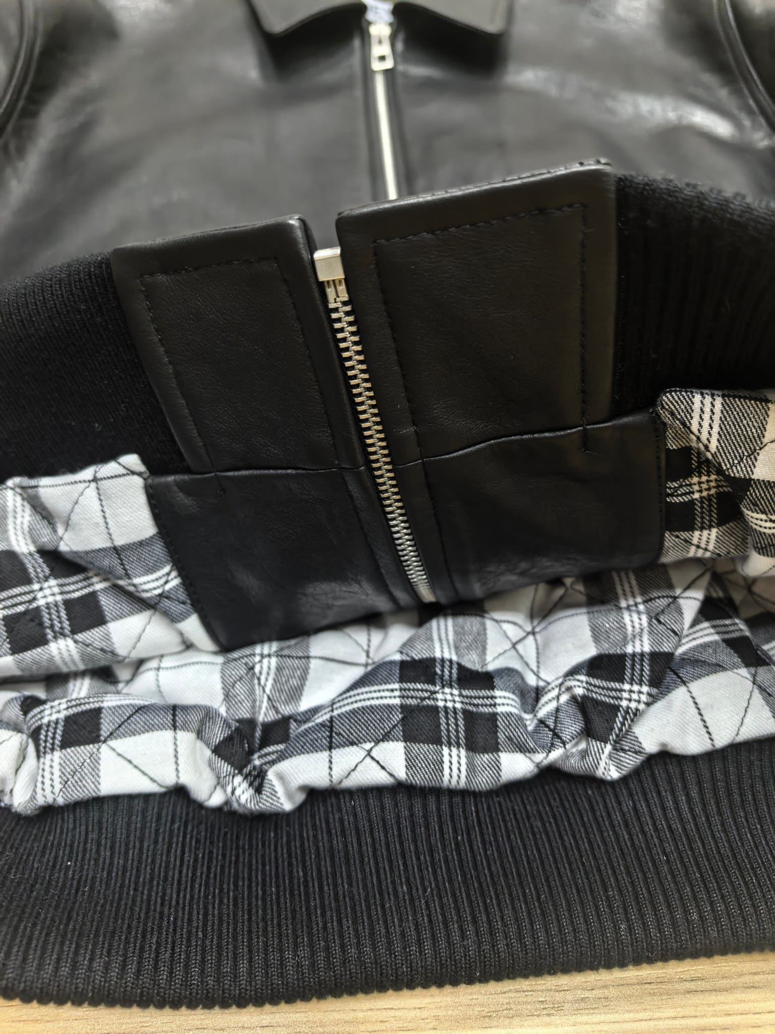 디테일: 가죽 및 패브릭 배색 디자인, 등판 아나그램 가죽 패치, 체크 패턴 퀼팅 안감, 하단 니트 리브 마감