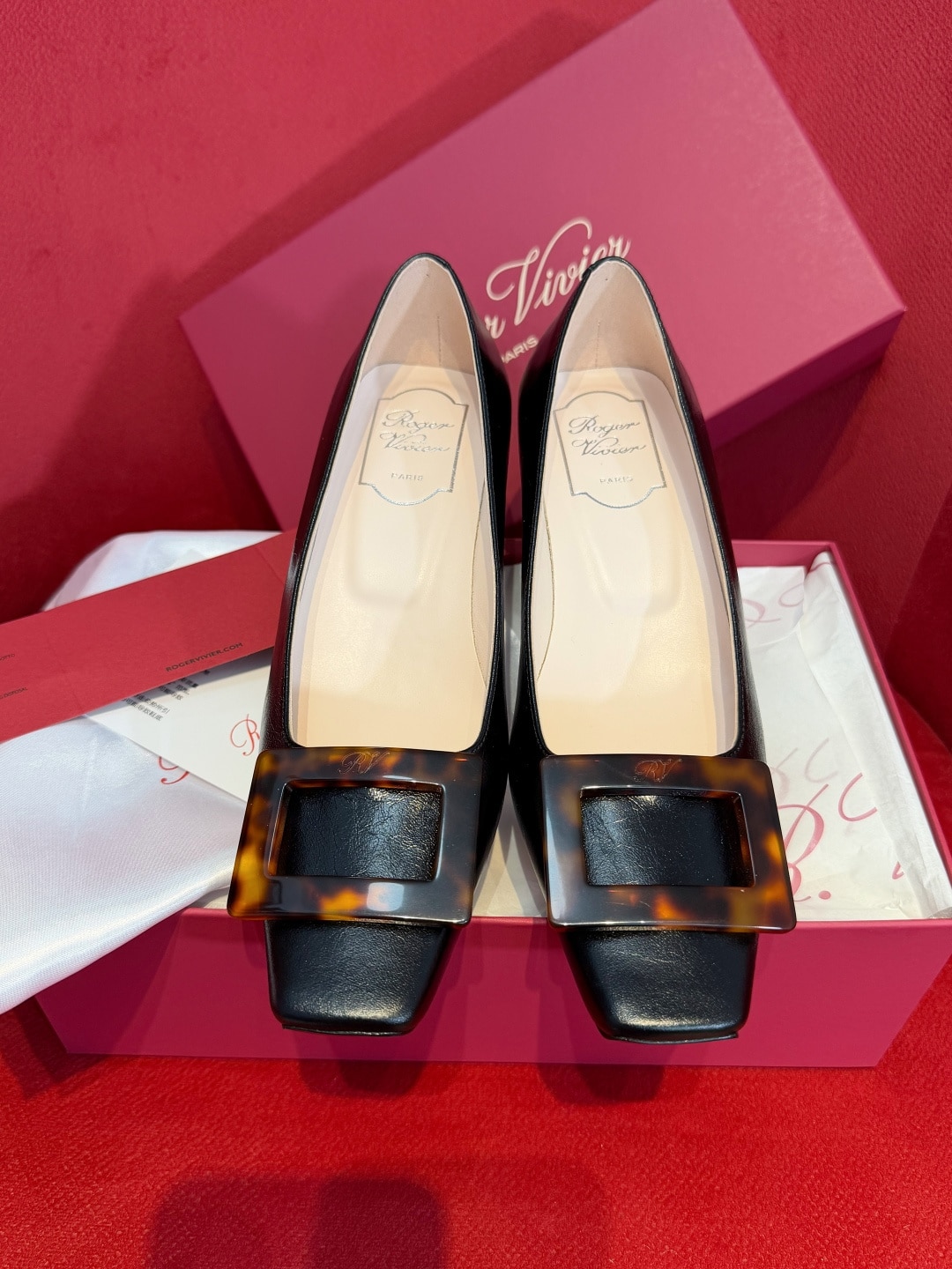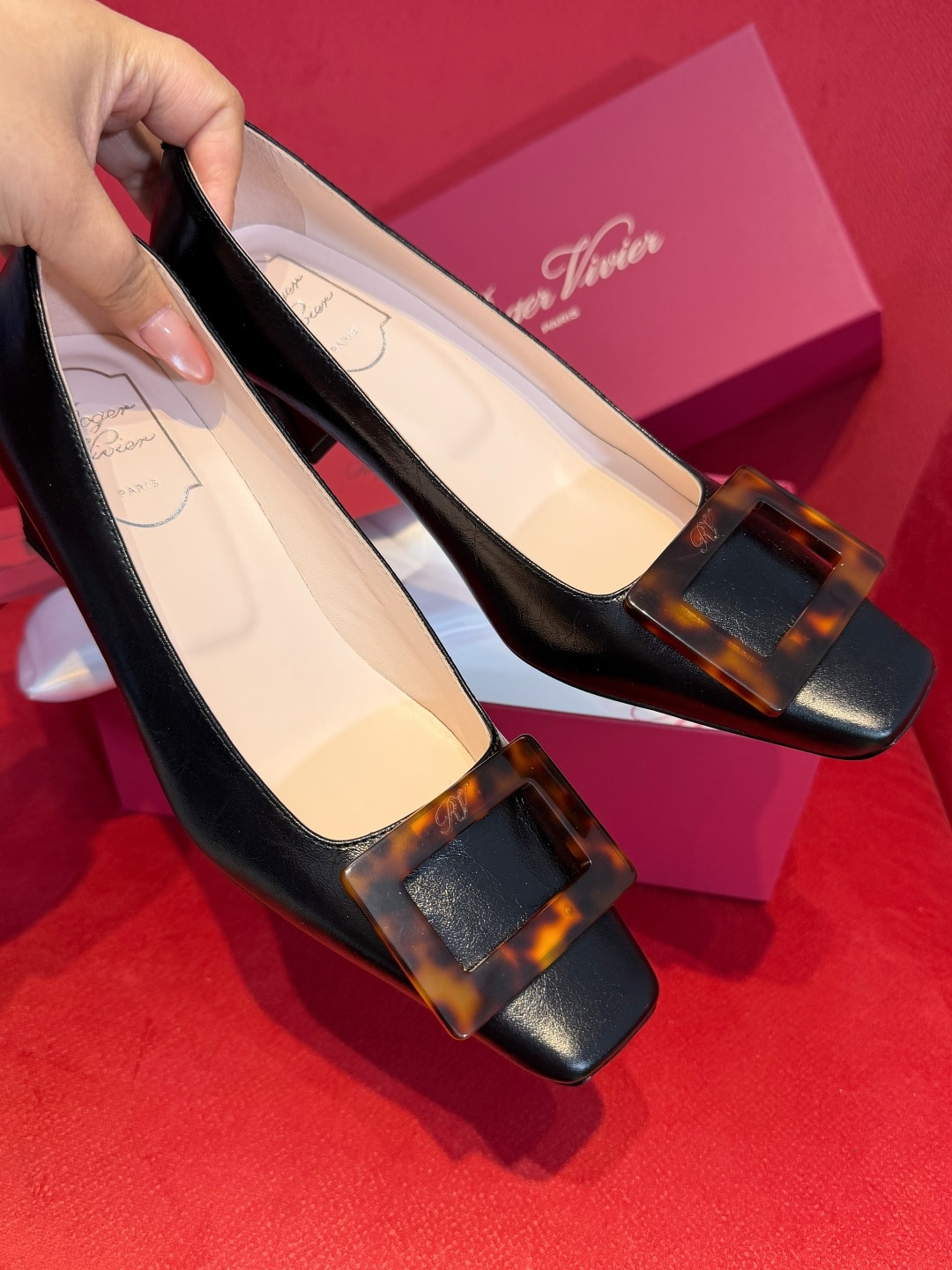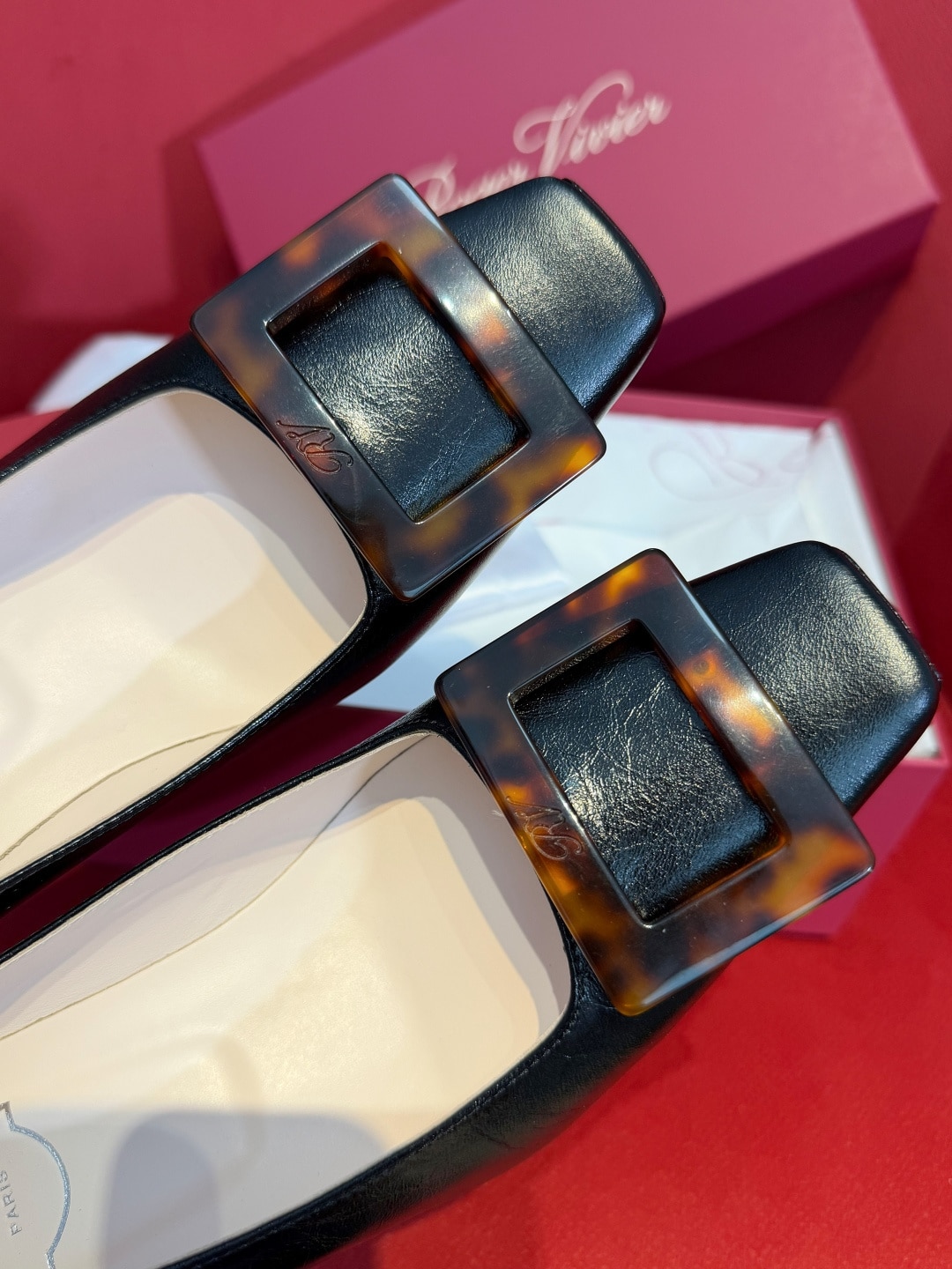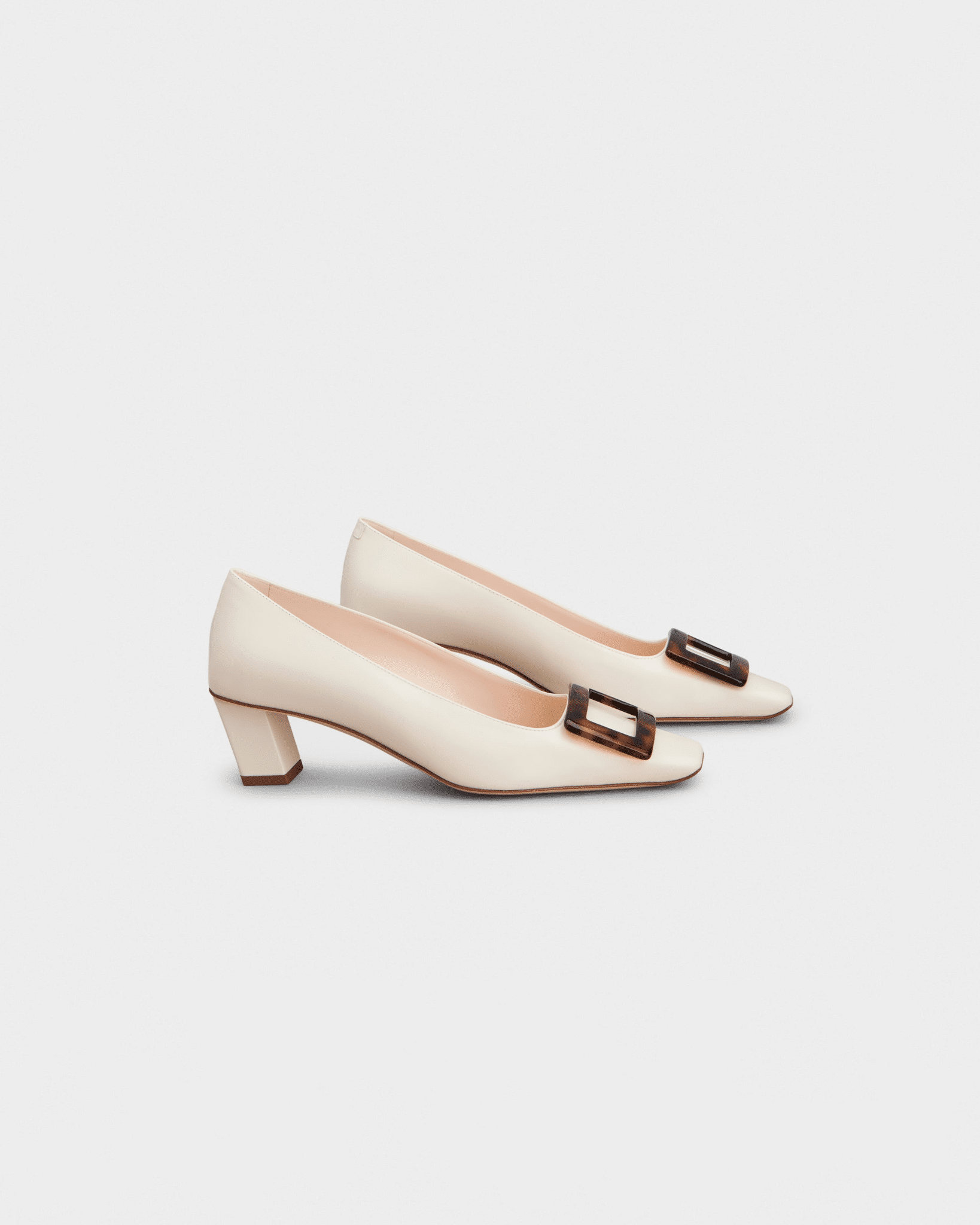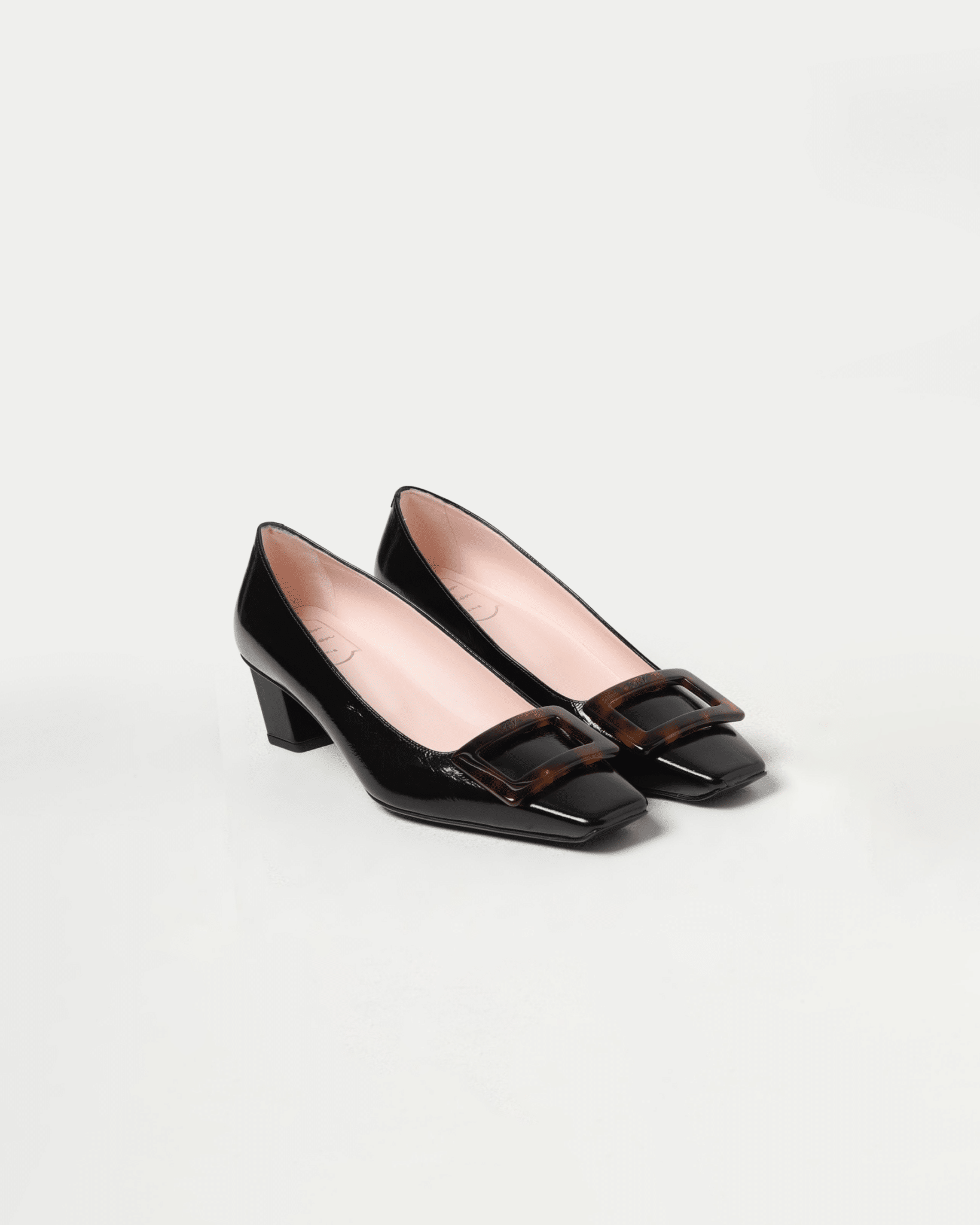 로제 비비에의 시그니처인 사각형 버클에 고급스러운 호박색 거북등껍질 무늬(타르타루가)를 더해 클래식함과 현대적인 미학을 결합한 디자인입니다.