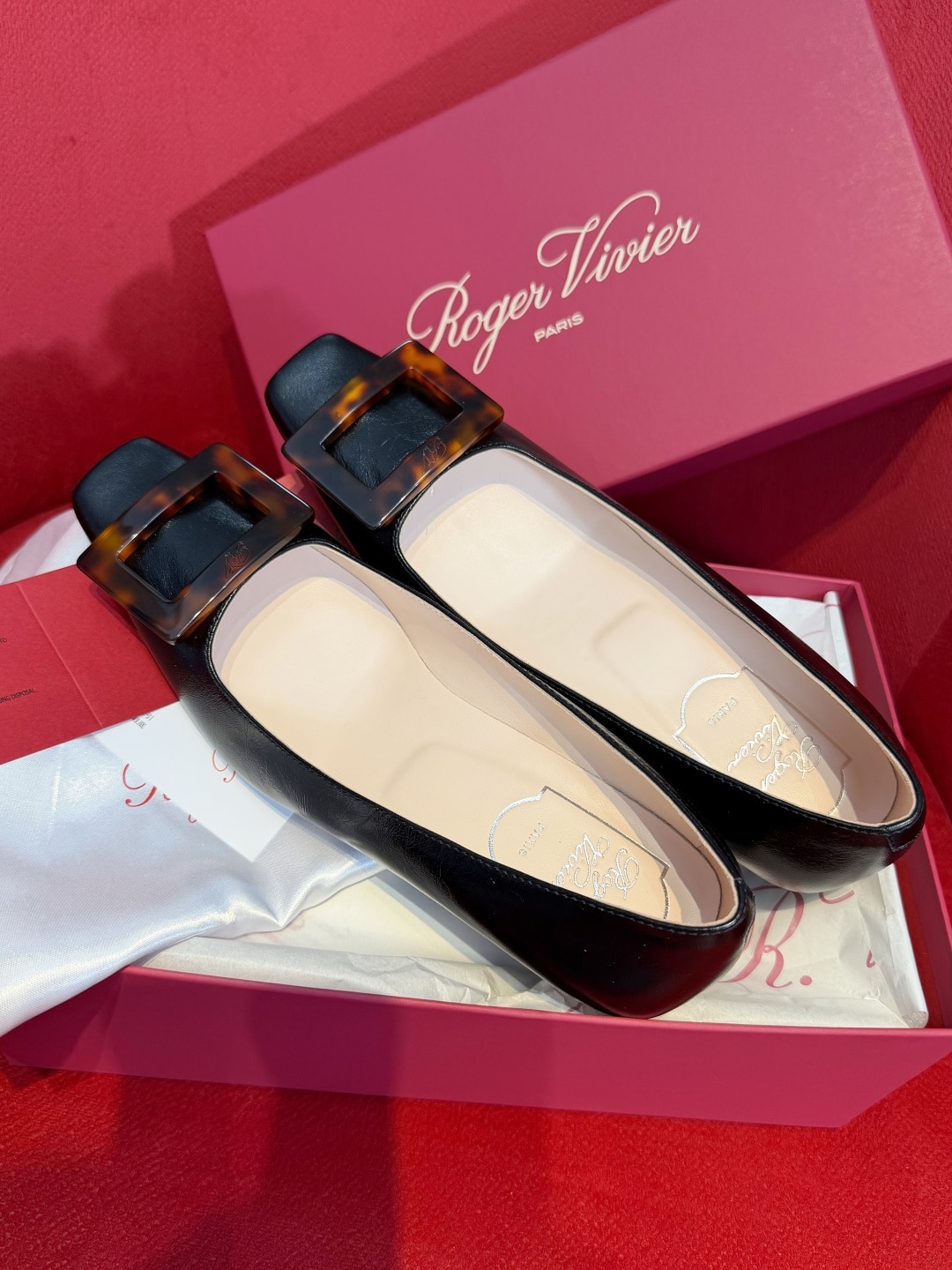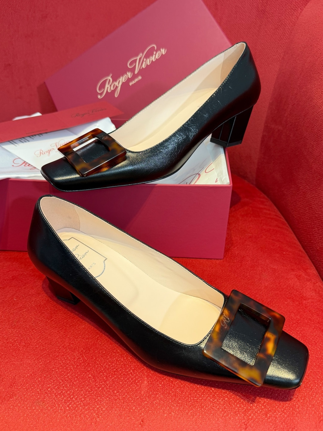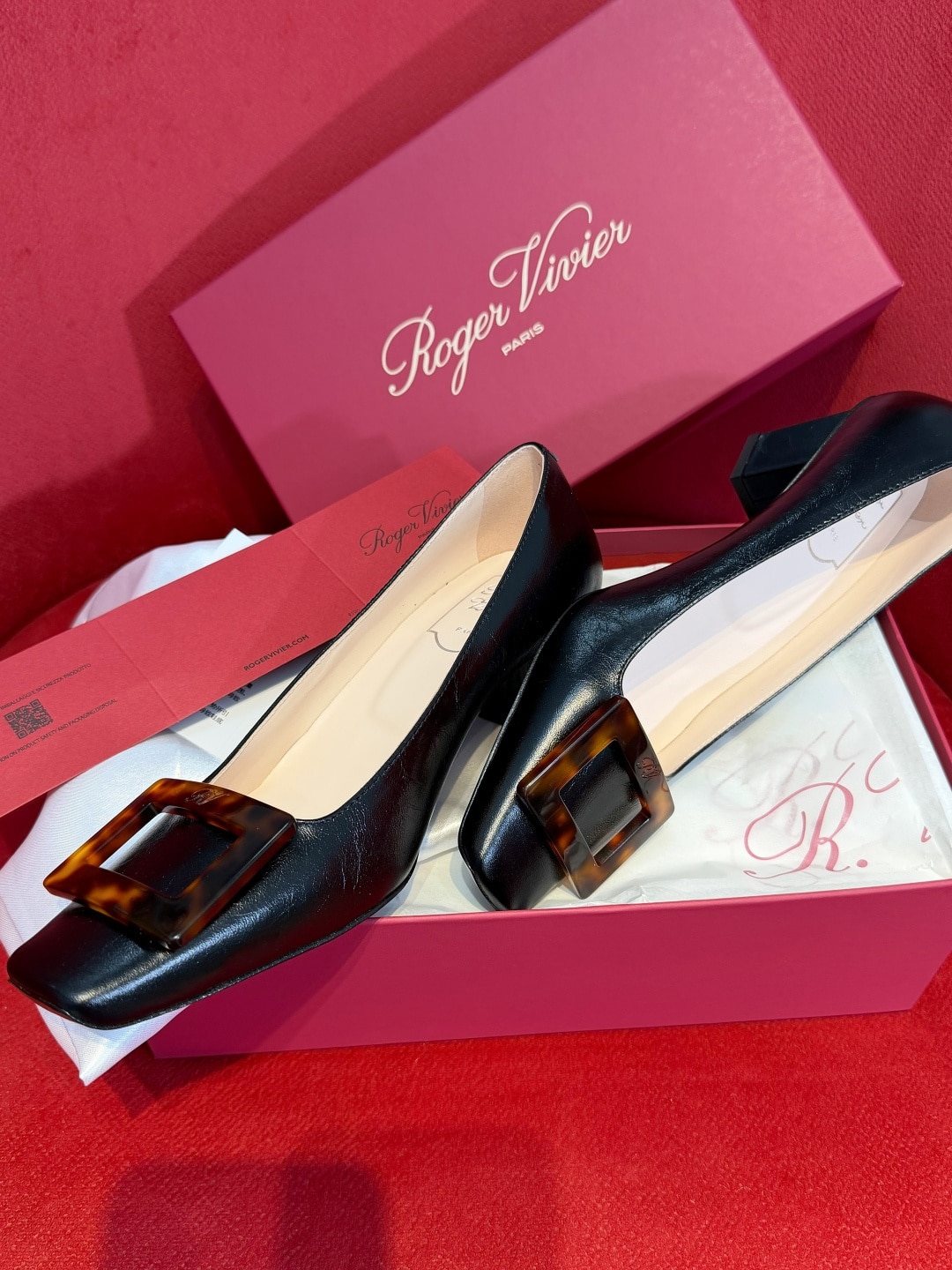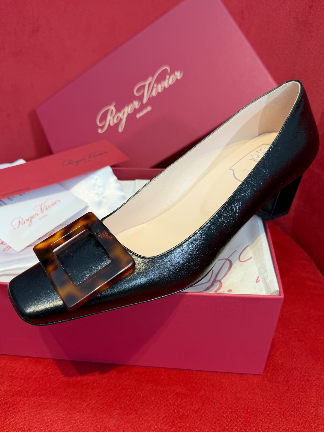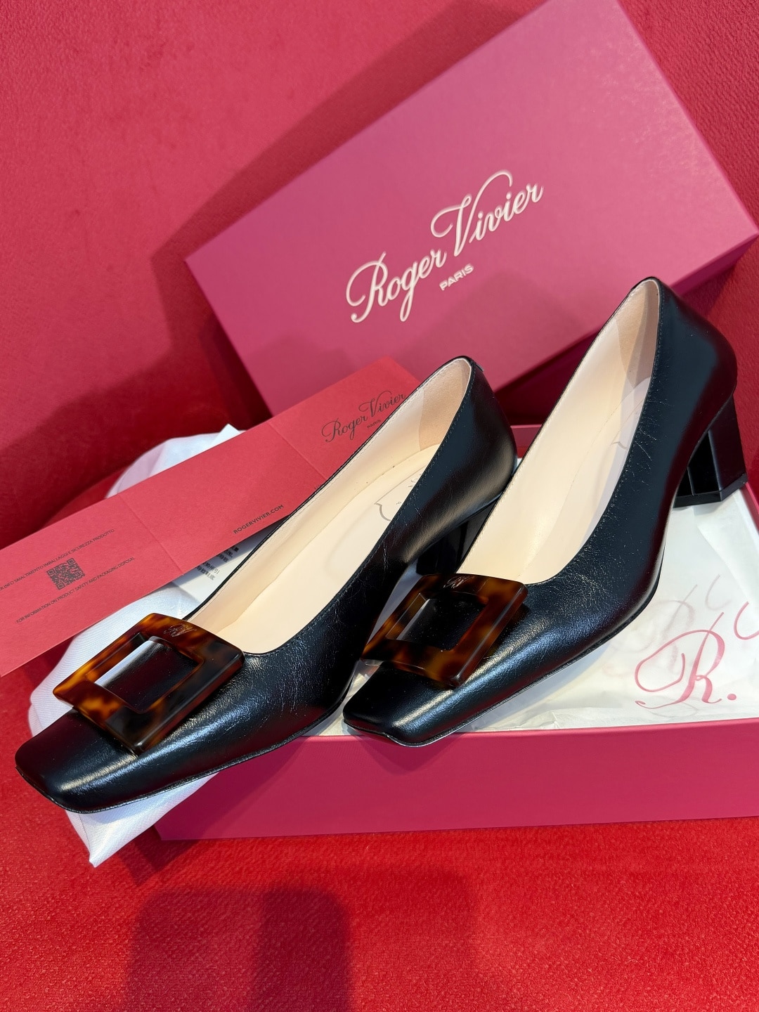 로제 비비에의 시그니처인 사각형 버클에 고급스러운 호박색 거북등껍질 무늬(타르타루가)를 더해 클래식함과 현대적인 미학을 결합한 디자인입니다.