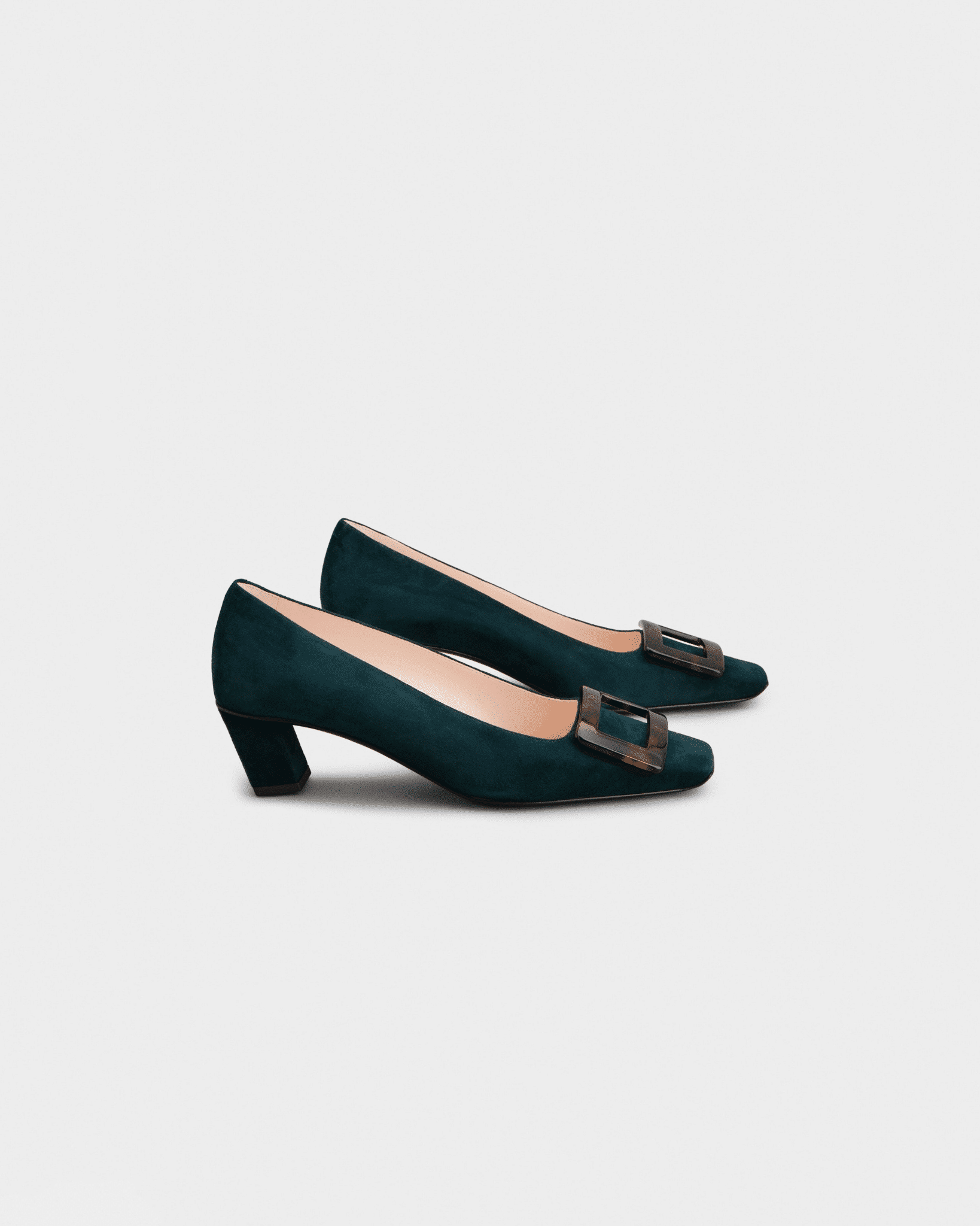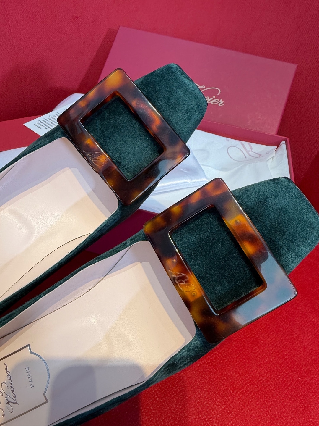 로제 비비에의 시그니처인 사각형 버클에 고급스러운 호박색 거북등껍질 무늬(타르타루가)를 더해 클래식함과 현대적인 미학을 결합한 디자인입니다.