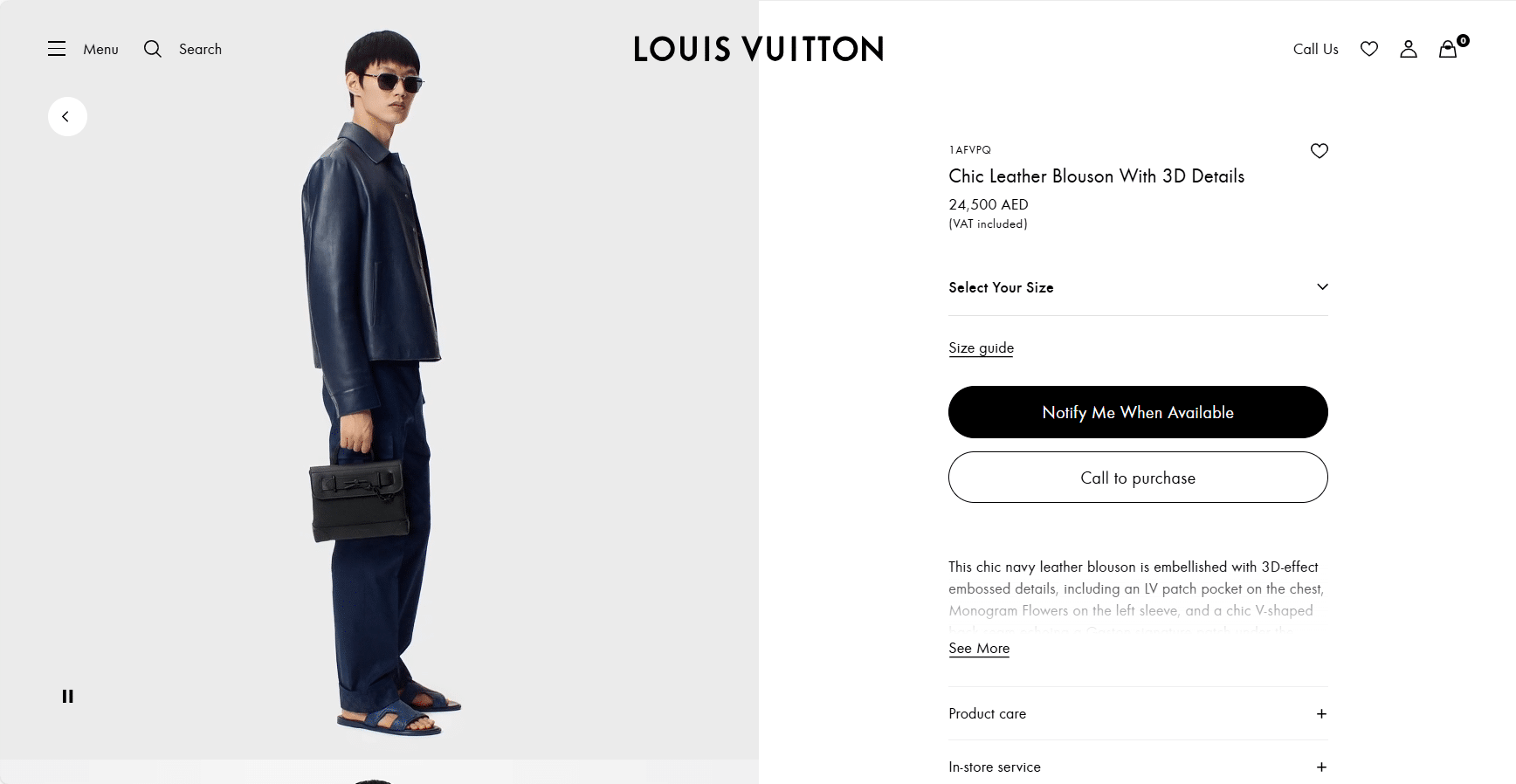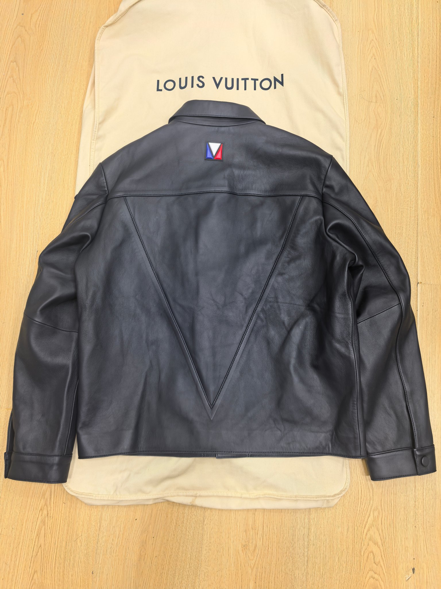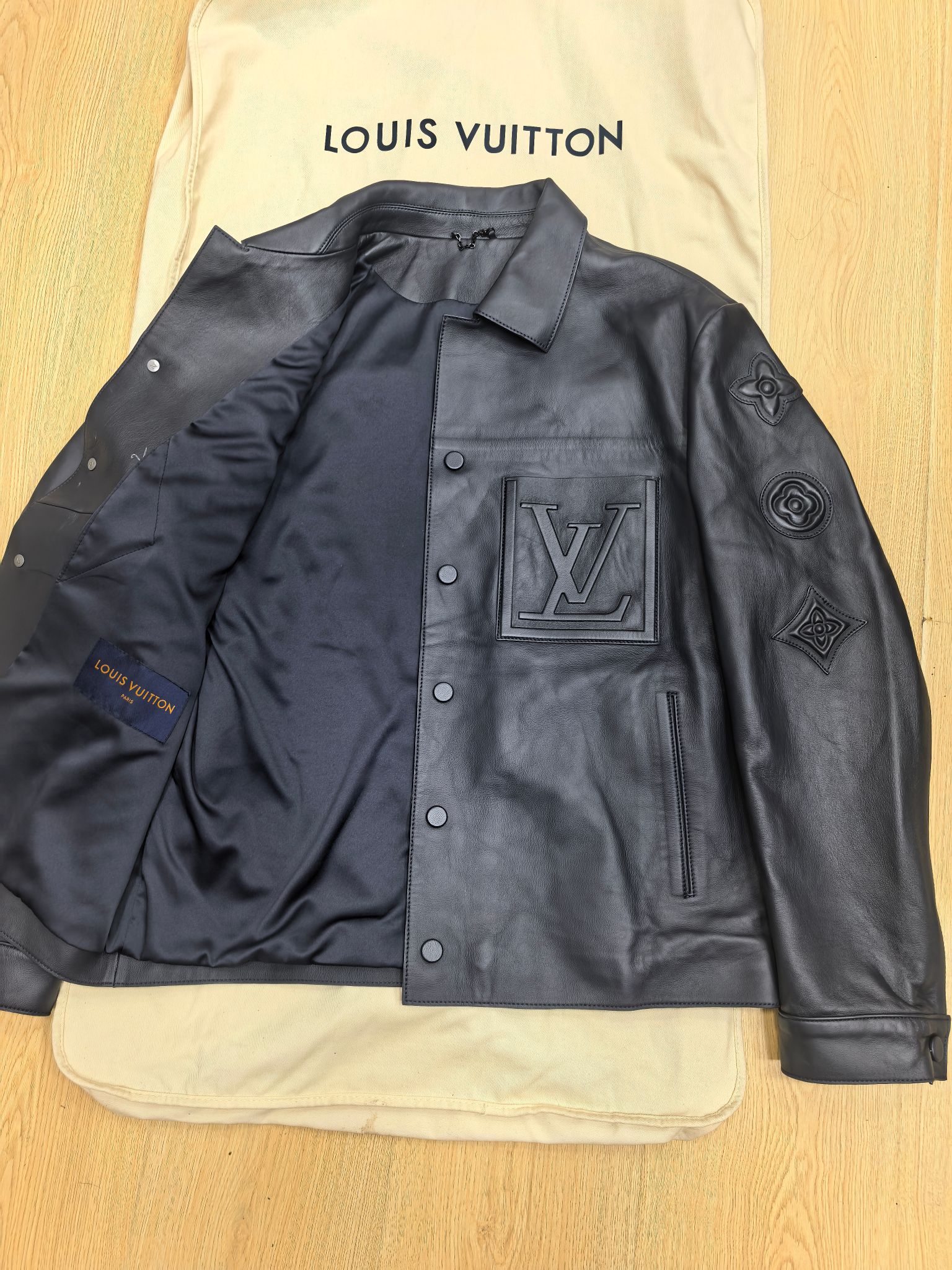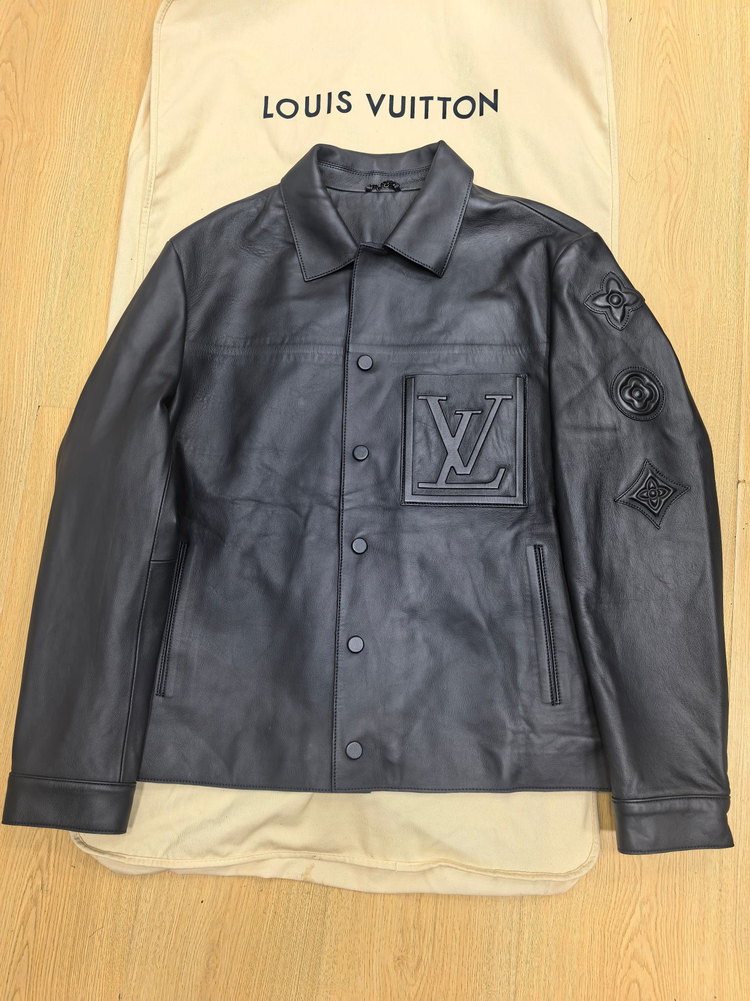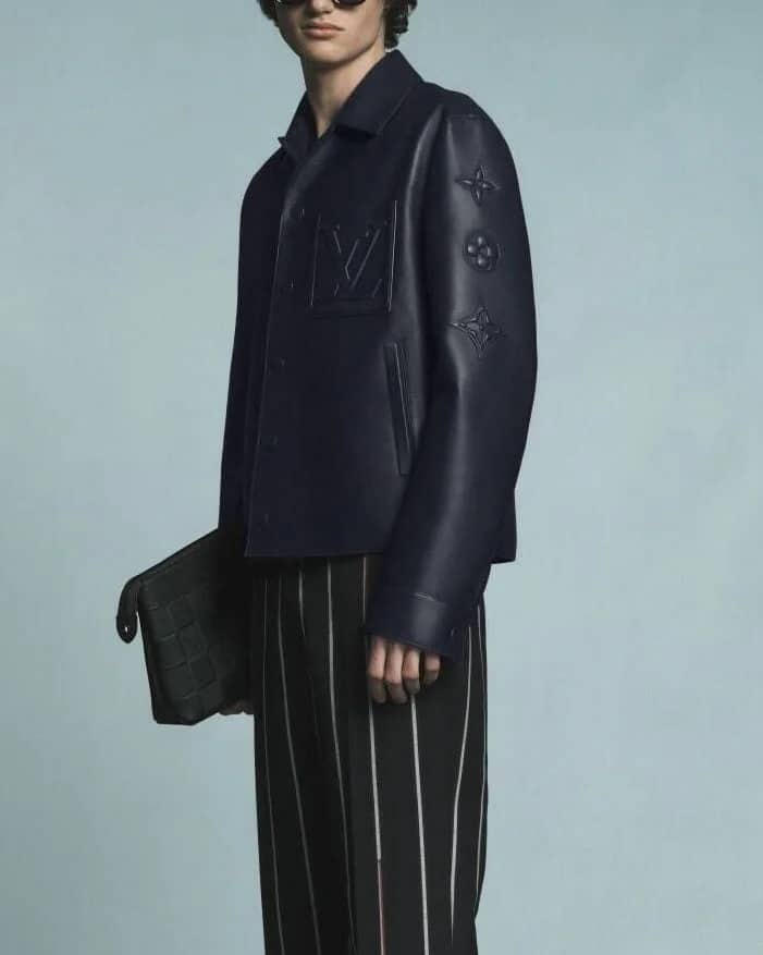 맞춤 제작된 하드웨어와 백 네크라인의 메탈 로고 플래그 라벨이 디테일을 한층 강조하며, 절제된 라인 속에서도 존재감 있는 디자인을 선사한다. 포멀한 셔츠형 실루엣과 레더의 깊은 질감이 어우러진 하이엔드 남성 아우터로, Louis Vuitton 특유의 품격과 모던함을 담아냈다.