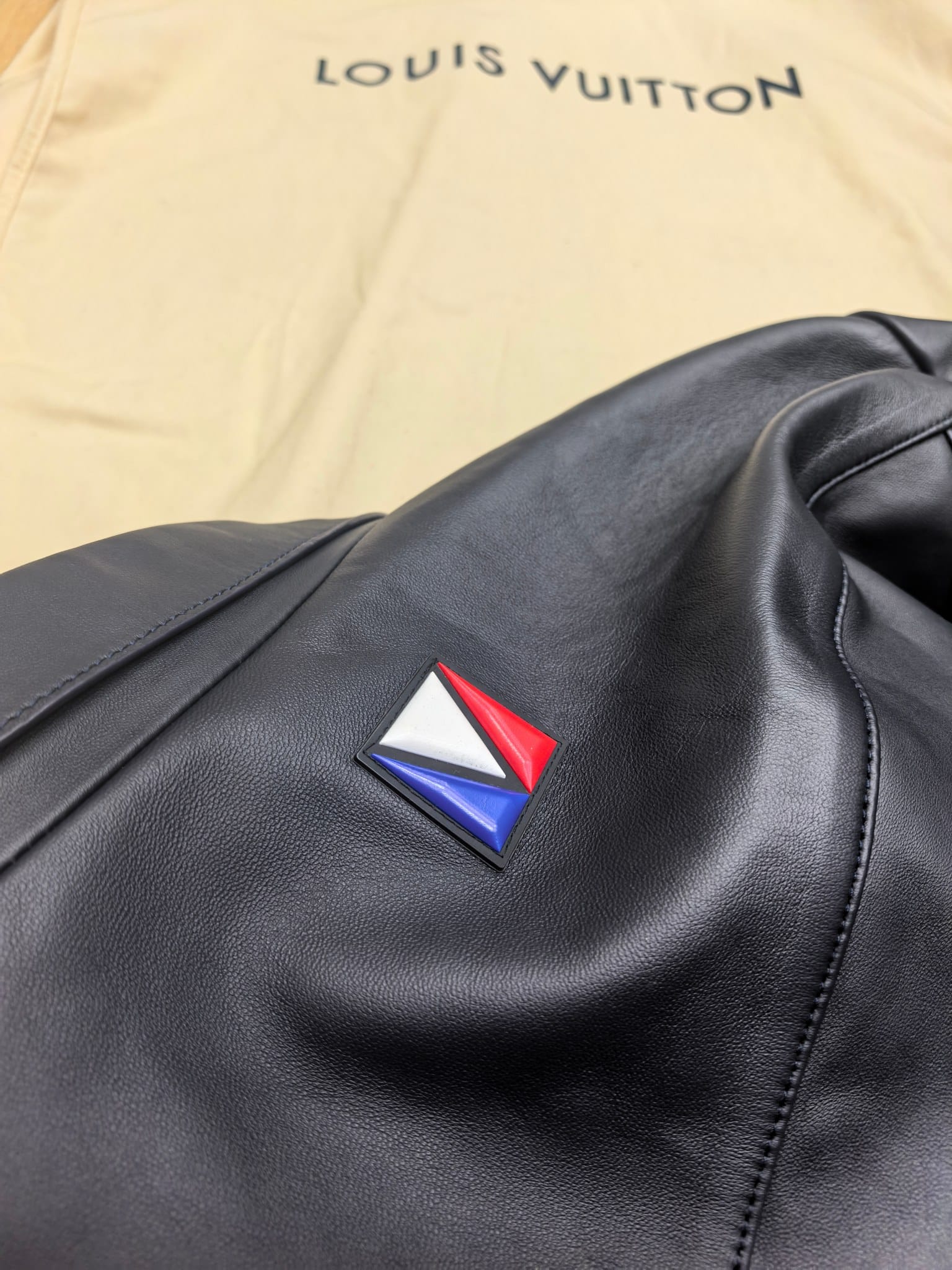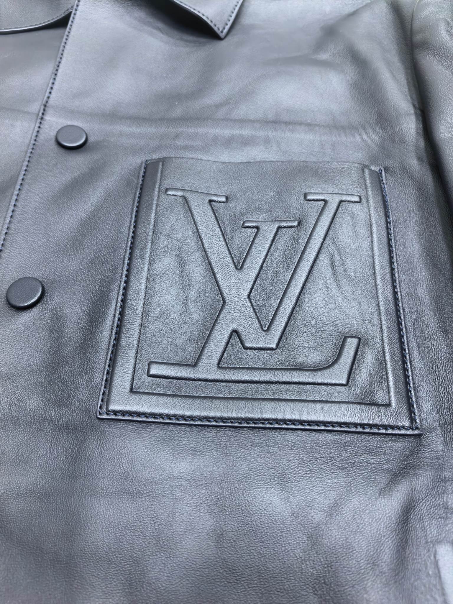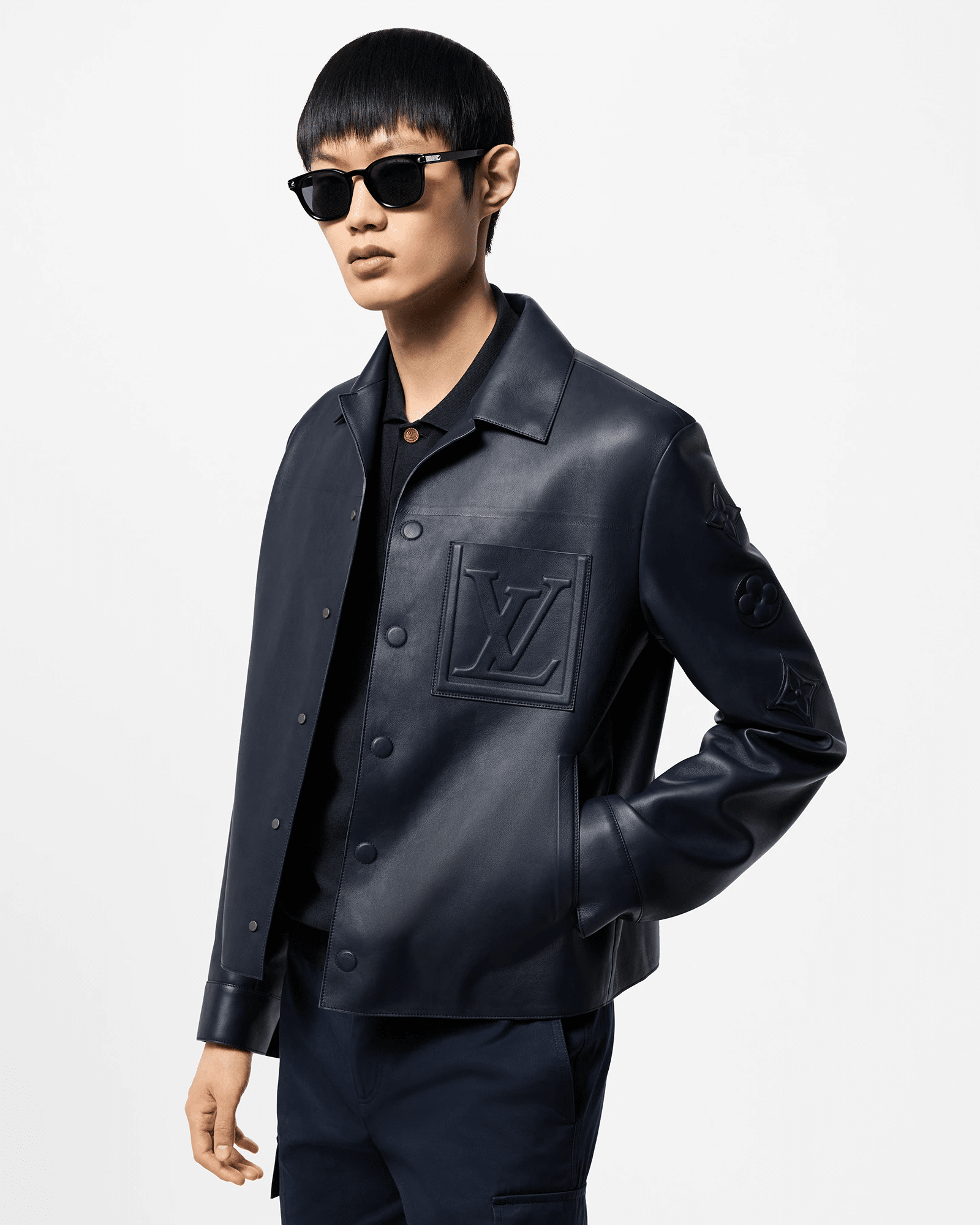 Louis Vuitton의 2025 시즌 남성용 레더 셔츠 재킷. 부드럽고 탄탄한 질감의 천연 수입 양가죽으로 제작되어 클래식하면서도 구조적인 실루엣을 완성했다. 전면의 LV 엠보싱 패치와 소매의 모노그램 엠블럼이 브랜드의 아이코닉한 감성을 담아내며, 고급스러운 네이비 톤이 세련된 인상을 준다.