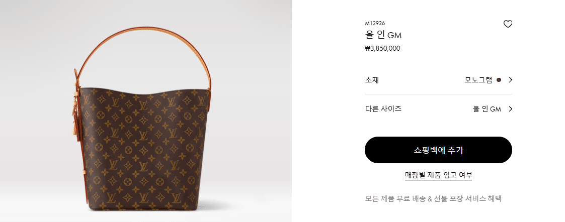 “[루이비통] 올 인 GM M12926”의 첫 상품평을 남겨 주세요