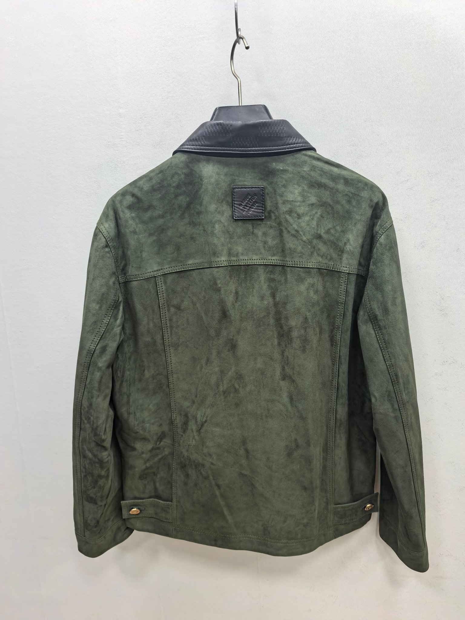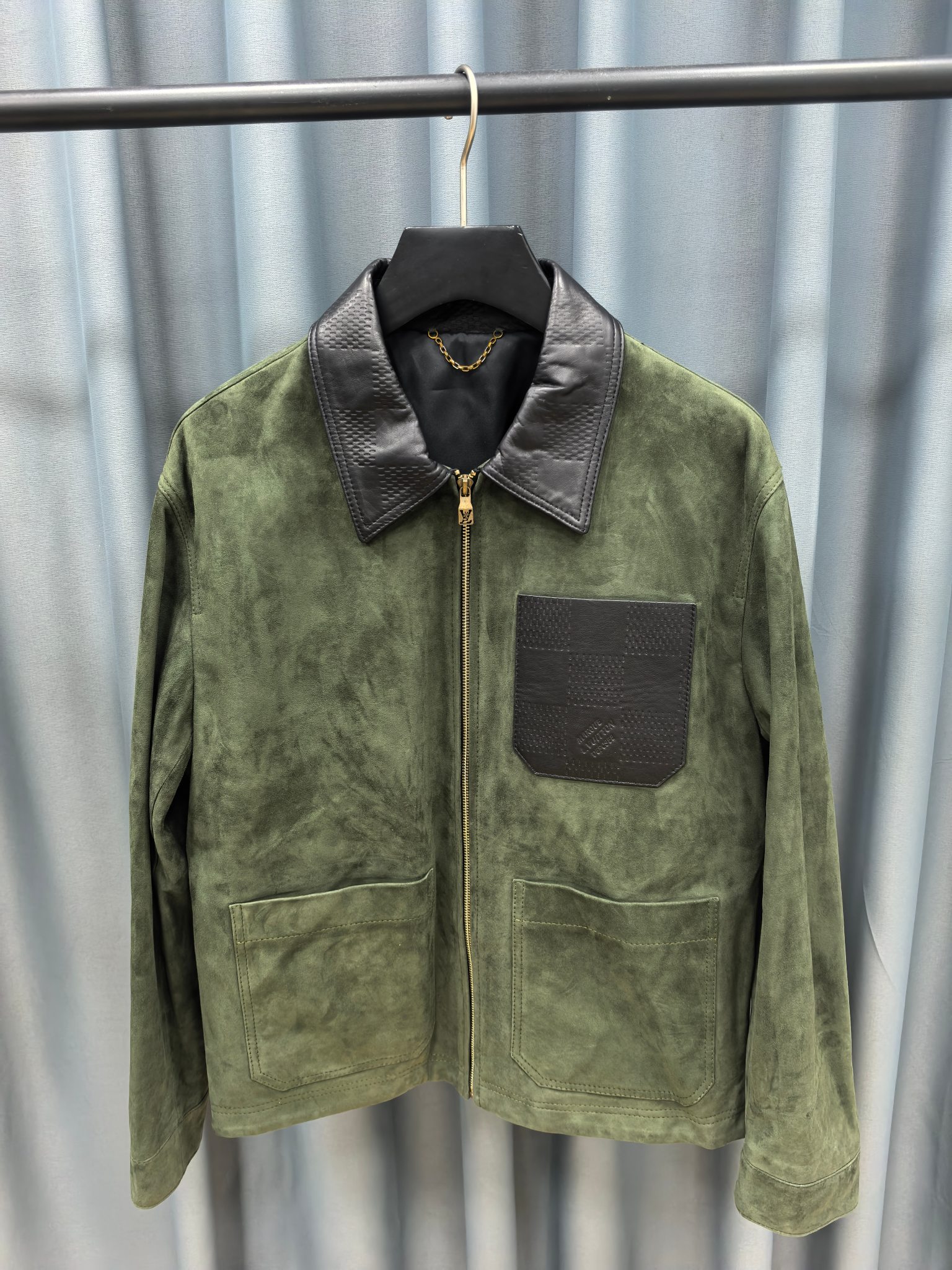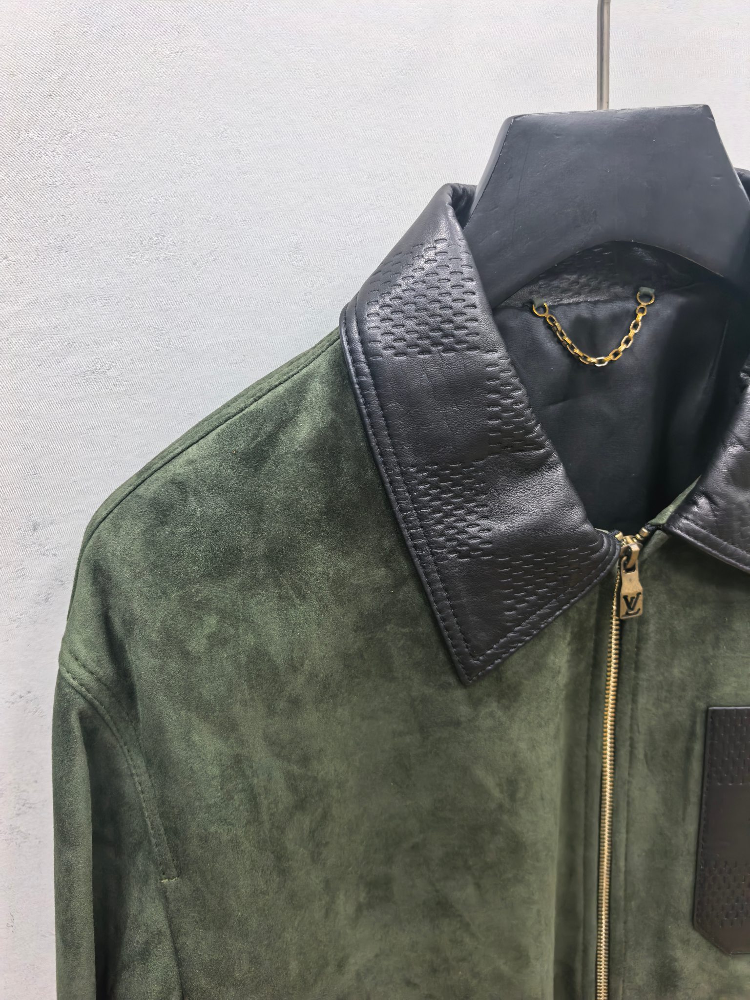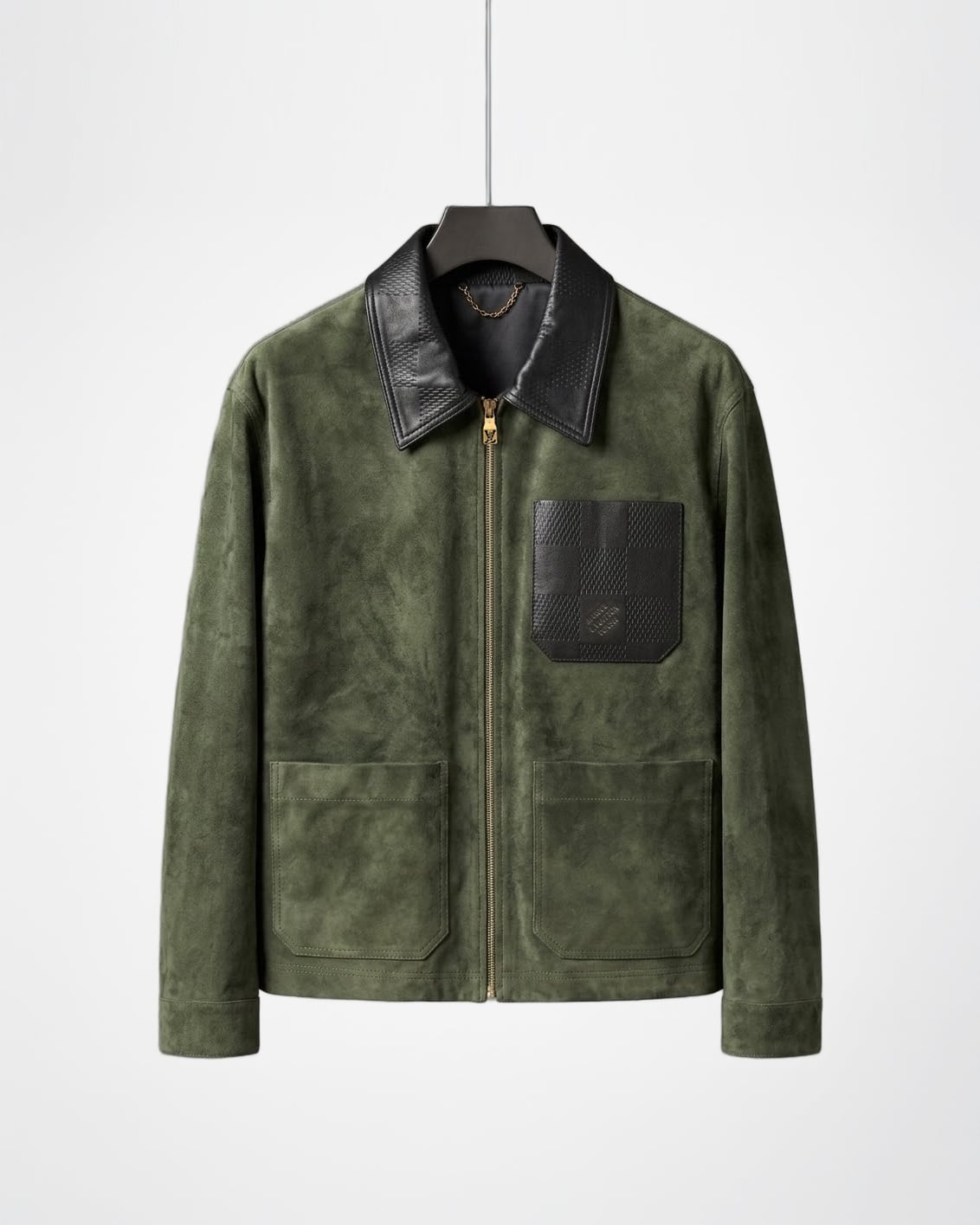 LOUIS VUITTON 2025 프리폴 남성 컬렉션에서 선보이는 스웨이드 레더 집업 재킷. 깊이 있는 그린 컬러의 프리미엄 스웨이드 가죽을 사용해 부드럽고 균일한 기모 텍스처를 구현했으며, 자연스러운 음영이 더해져 고급스러운 볼륨감을 연출한다. 간결한 실루엣과 정교한 패턴 설계가 어우러져 착용 시 구조적인 라인을 유지하면서도 편안한 드레이프를 제공한다.
