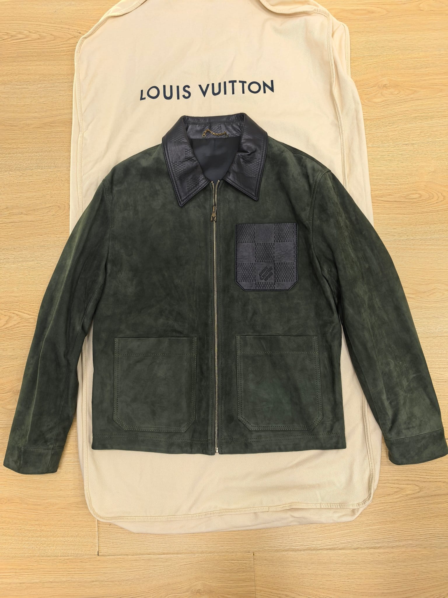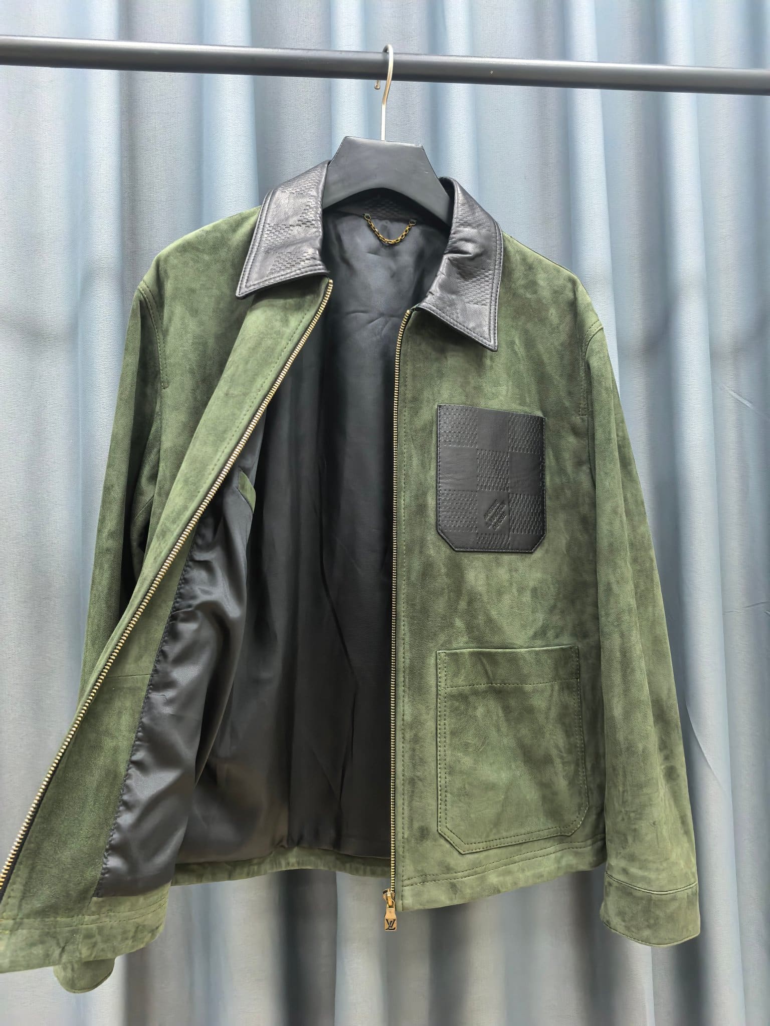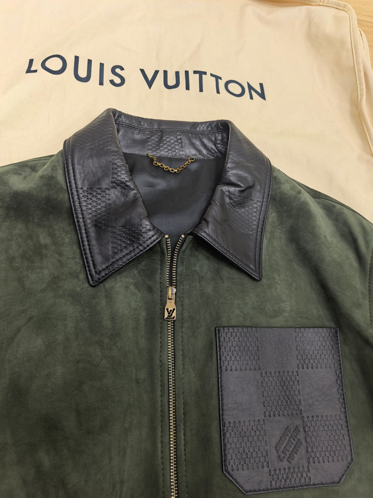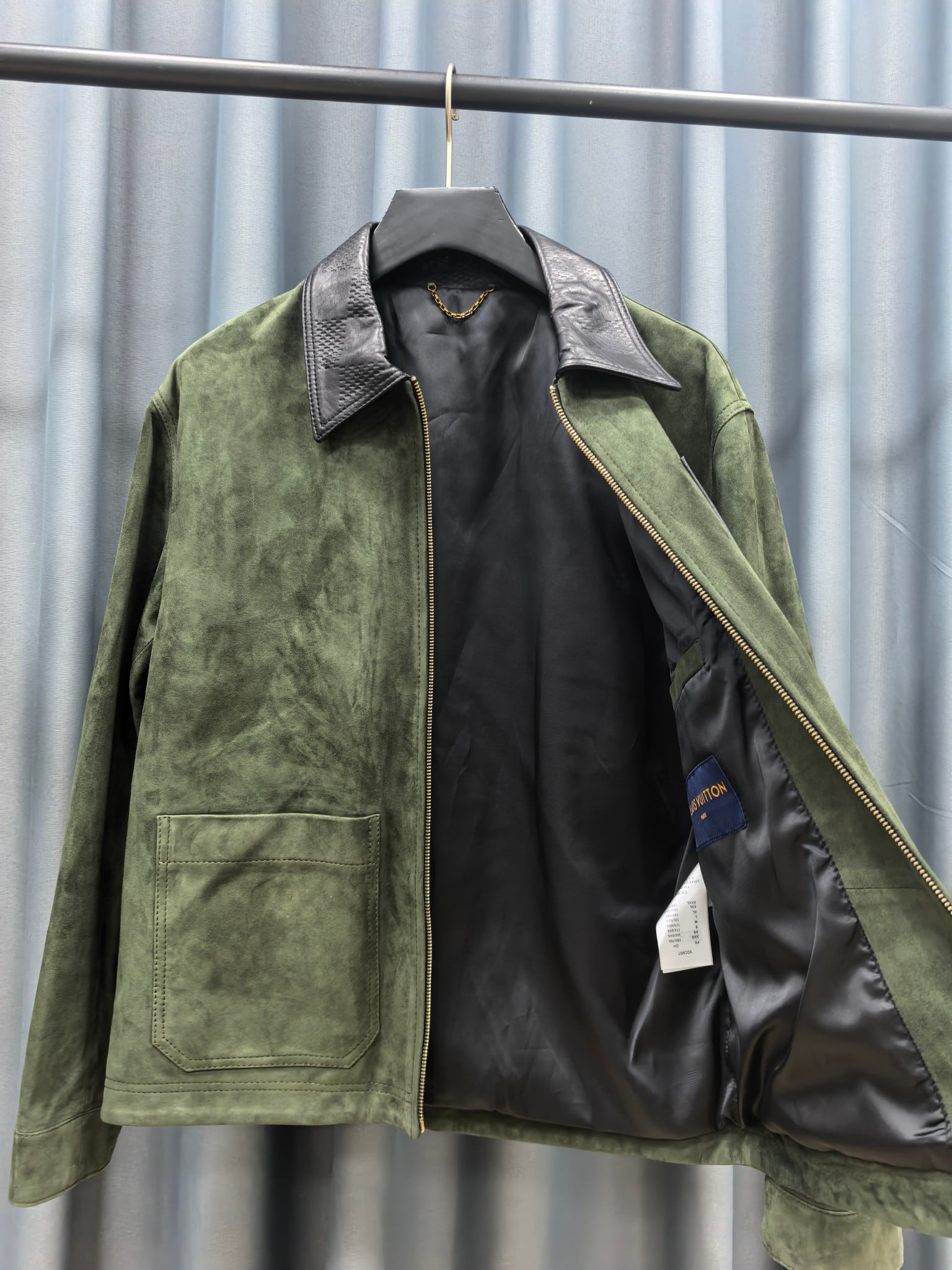LOUIS VUITTON 2025 프리폴 남성 컬렉션에서 선보이는 스웨이드 레더 집업 재킷. 깊이 있는 그린 컬러의 프리미엄 스웨이드 가죽을 사용해 부드럽고 균일한 기모 텍스처를 구현했으며, 자연스러운 음영이 더해져 고급스러운 볼륨감을 연출한다. 간결한 실루엣과 정교한 패턴 설계가 어우러져 착용 시 구조적인 라인을 유지하면서도 편안한 드레이프를 제공한다.