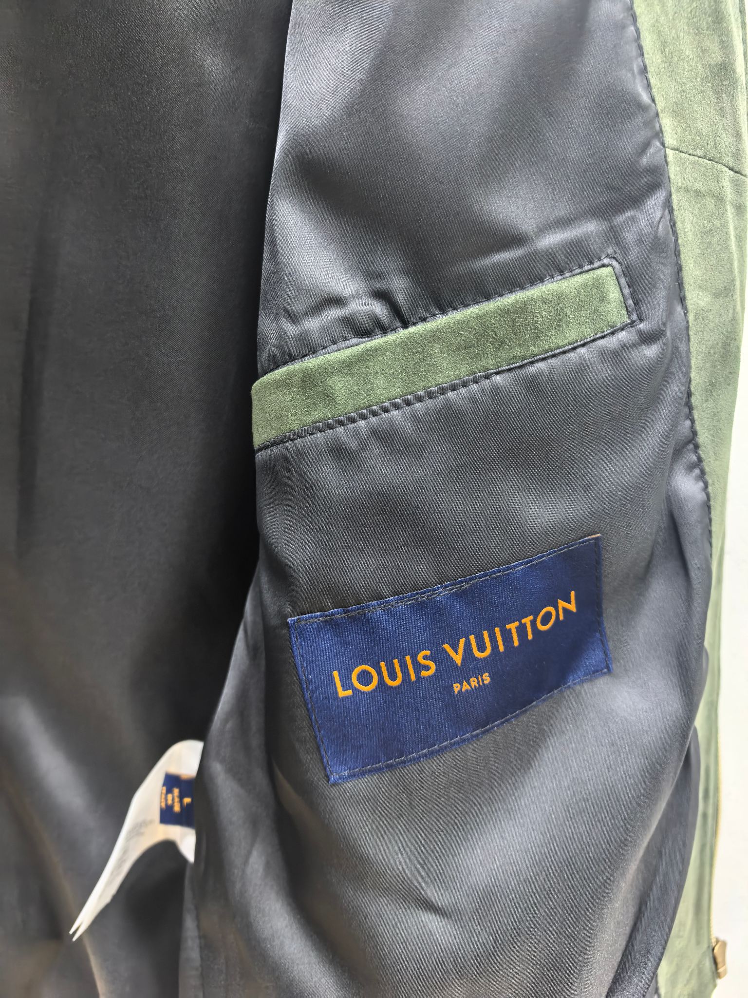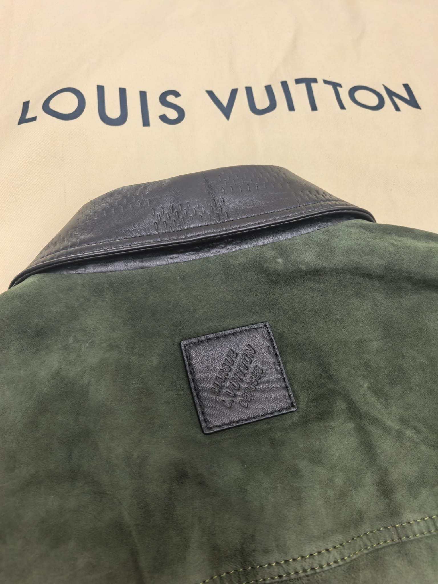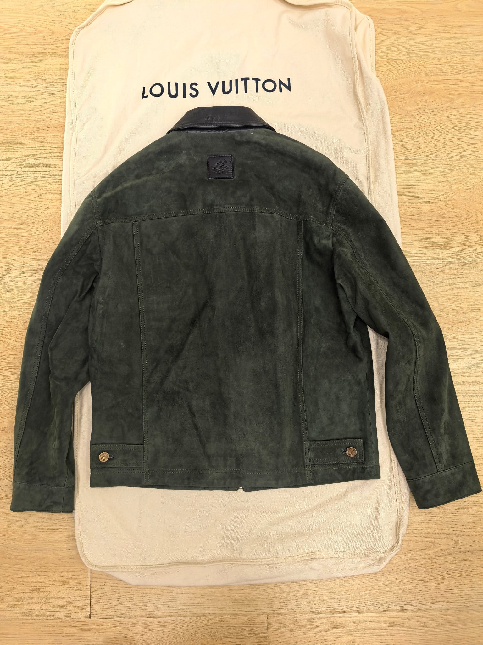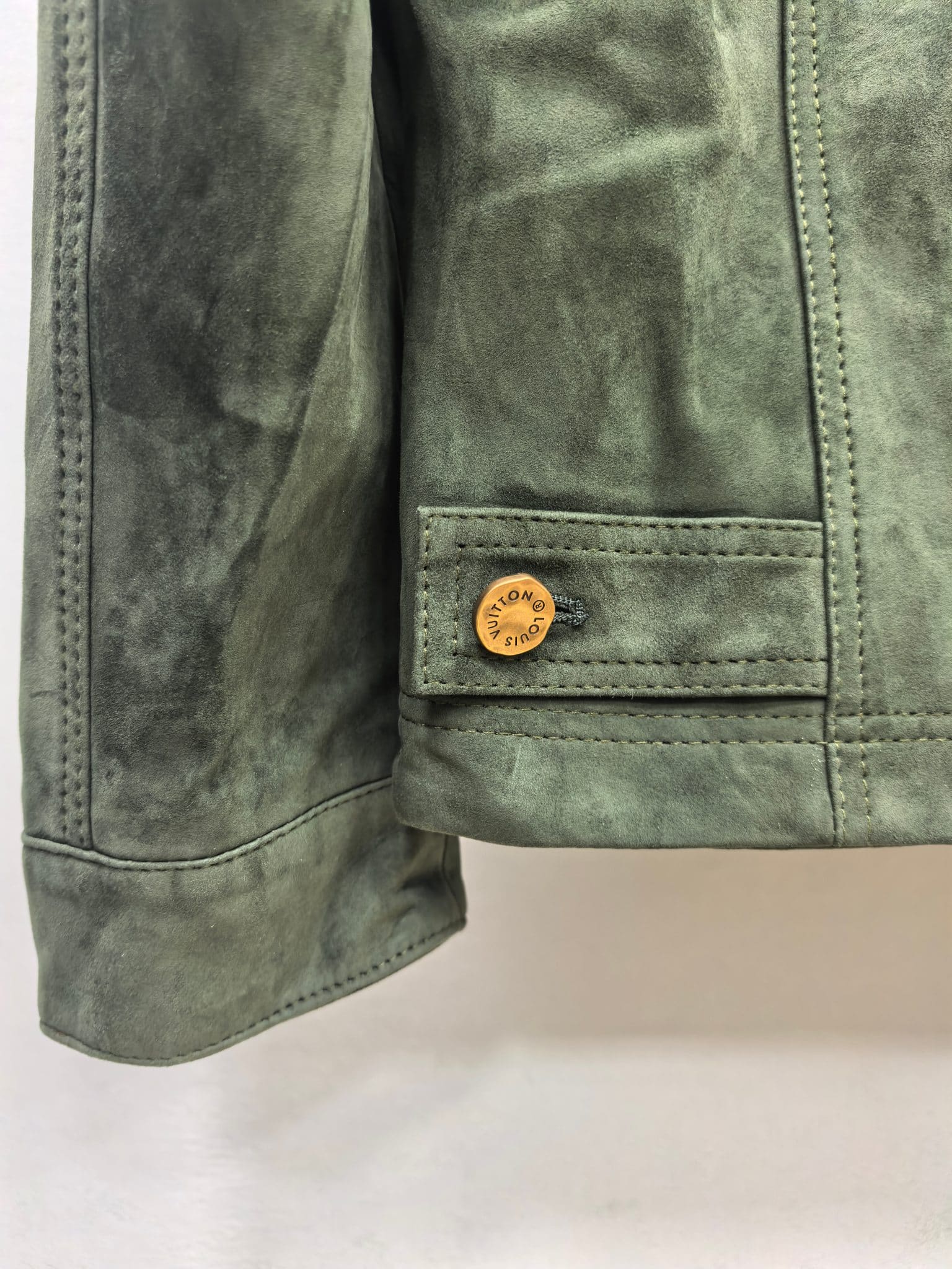LOUIS VUITTON 2025 프리폴 남성 컬렉션에서 선보이는 스웨이드 레더 집업 재킷. 깊이 있는 그린 컬러의 프리미엄 스웨이드 가죽을 사용해 부드럽고 균일한 기모 텍스처를 구현했으며, 자연스러운 음영이 더해져 고급스러운 볼륨감을 연출한다. 간결한 실루엣과 정교한 패턴 설계가 어우러져 착용 시 구조적인 라인을 유지하면서도 편안한 드레이프를 제공한다.