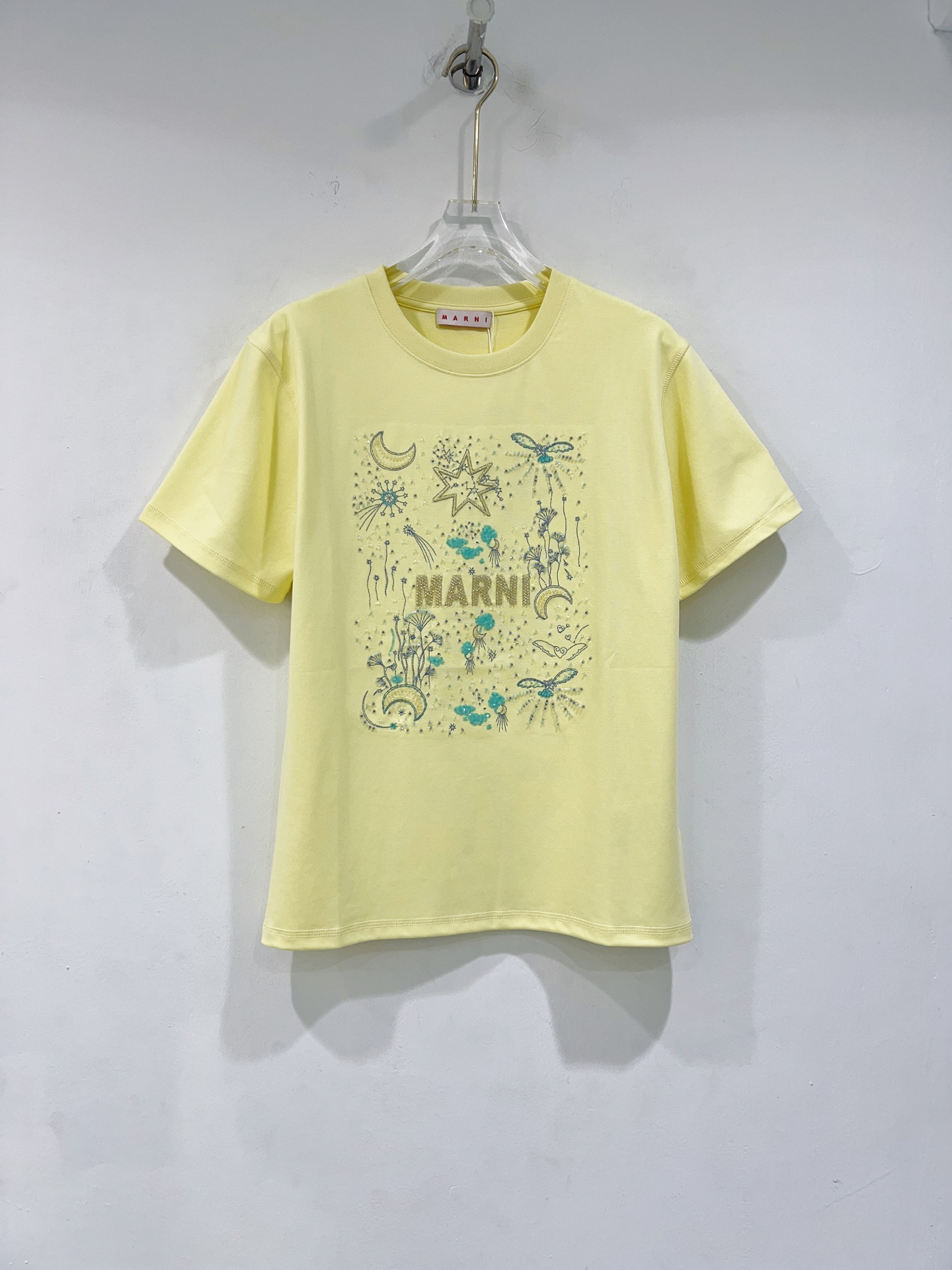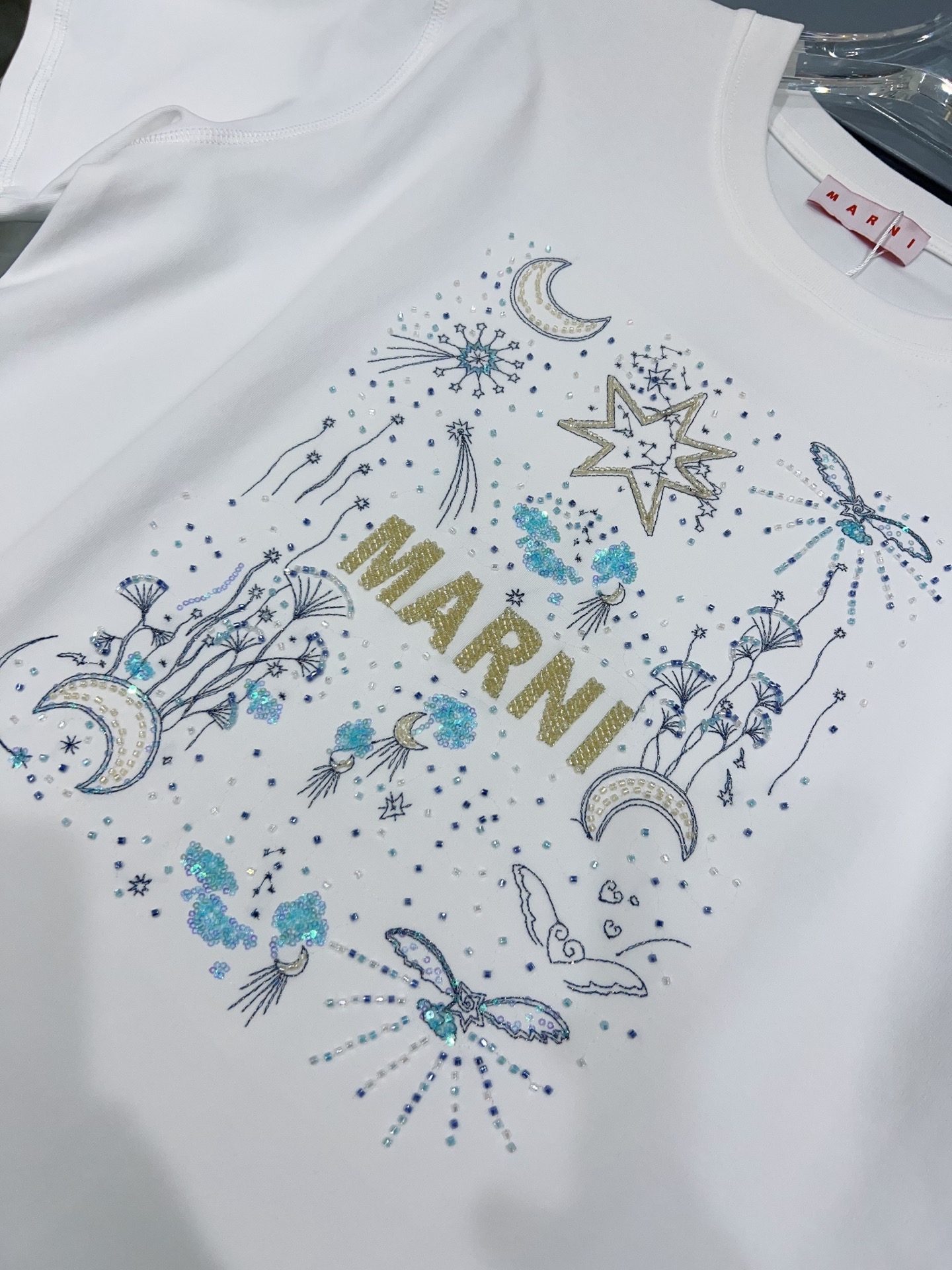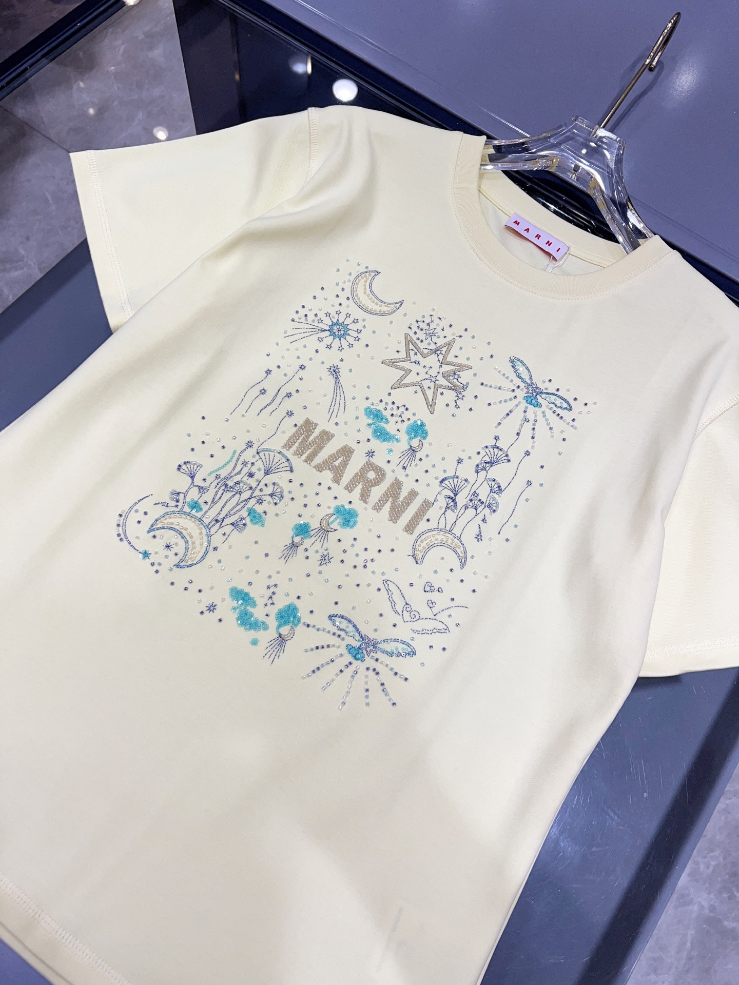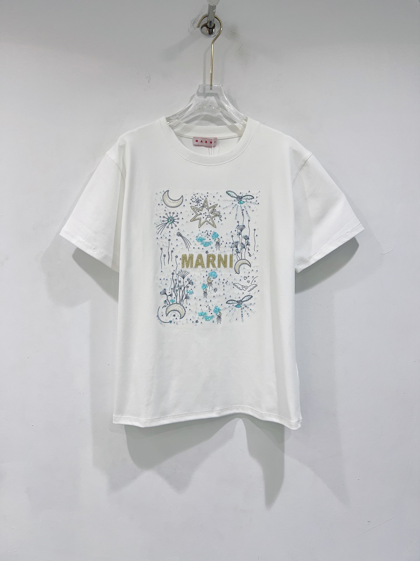 디자인 / 핏: 마르니만의 예술적 감각이 돋보이는 26SS 시즌 신상 반팔 티셔츠입니다. 전면의 로고와 밤하늘의 별, 달을 형상화한 유니크한 그래픽이 특징이며, 섬세한 자수와 입체적인 비즈(Beads) 디테일이 어우러져 압도적인 존재감을 드러냅니다.