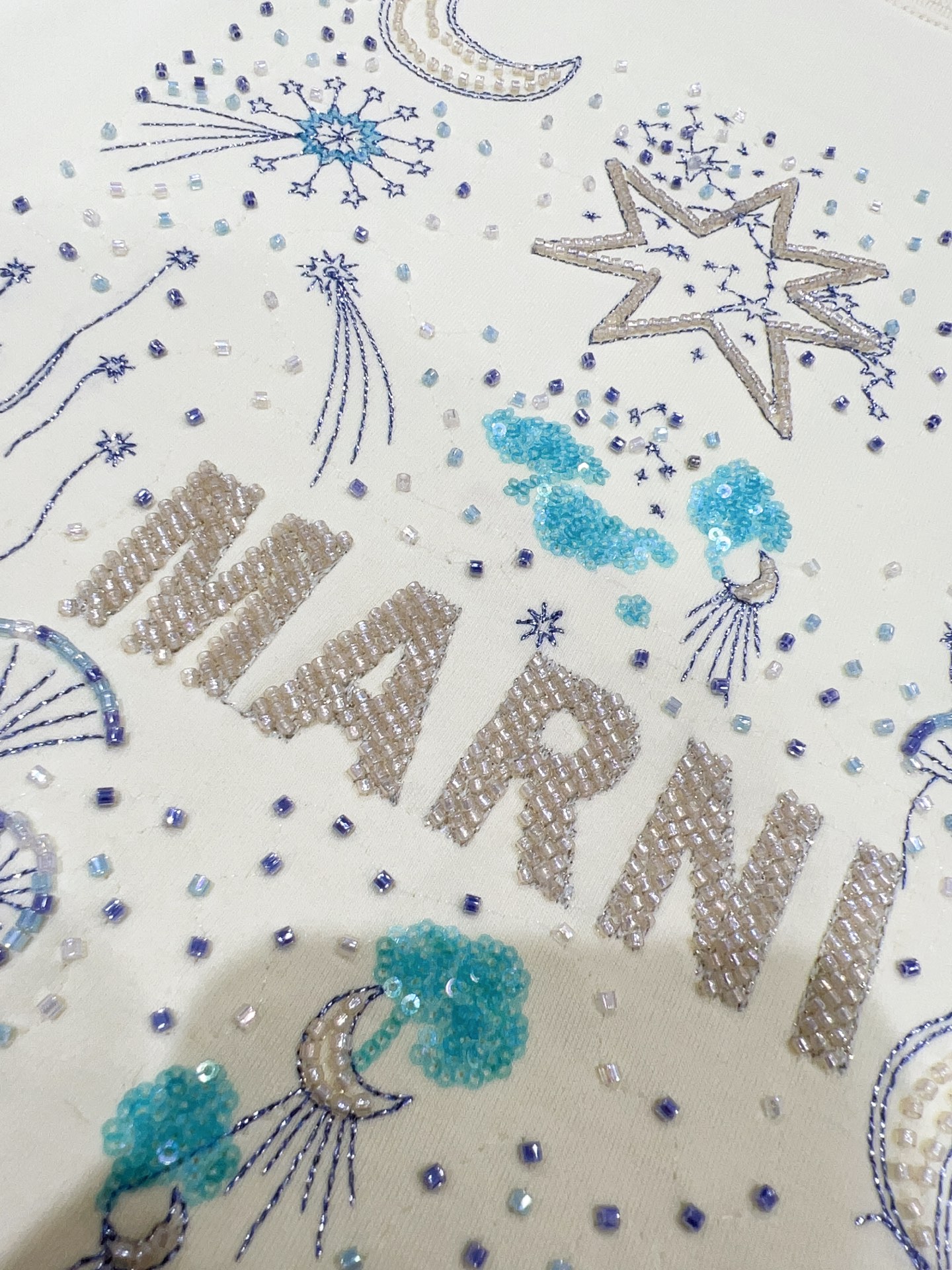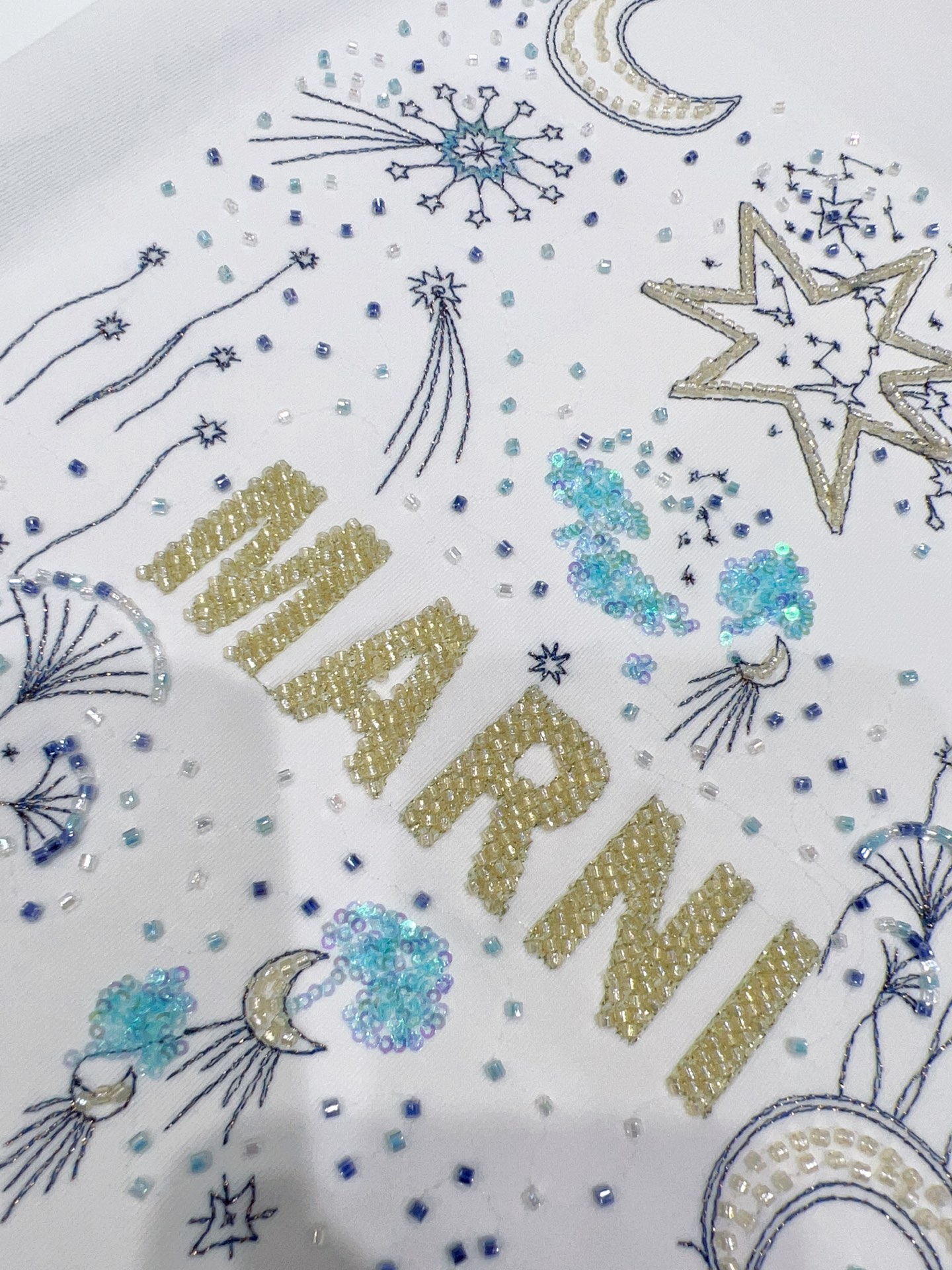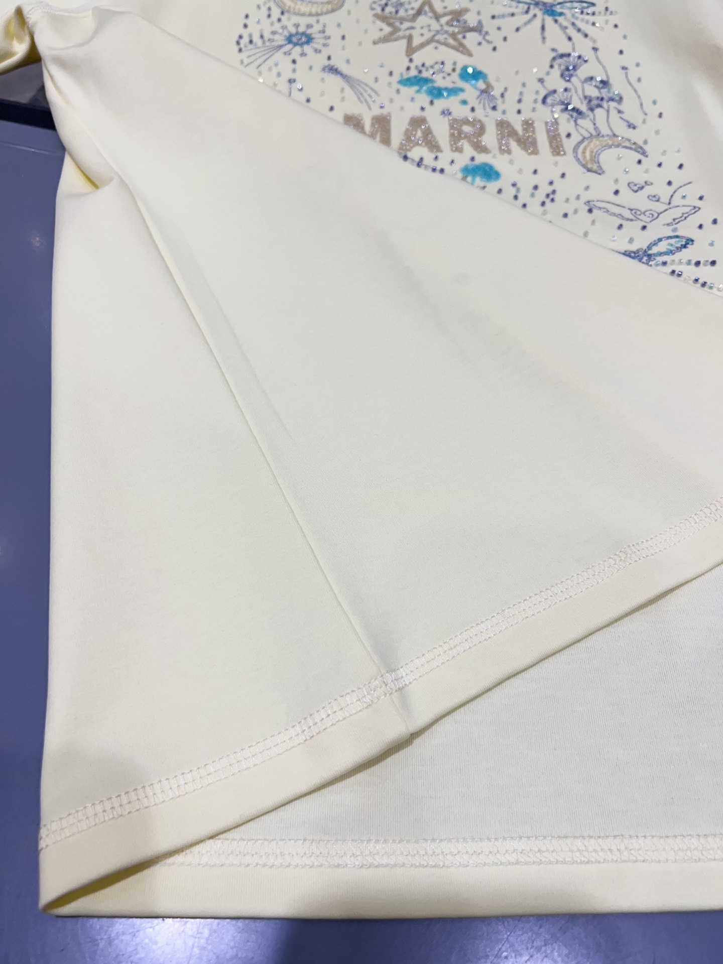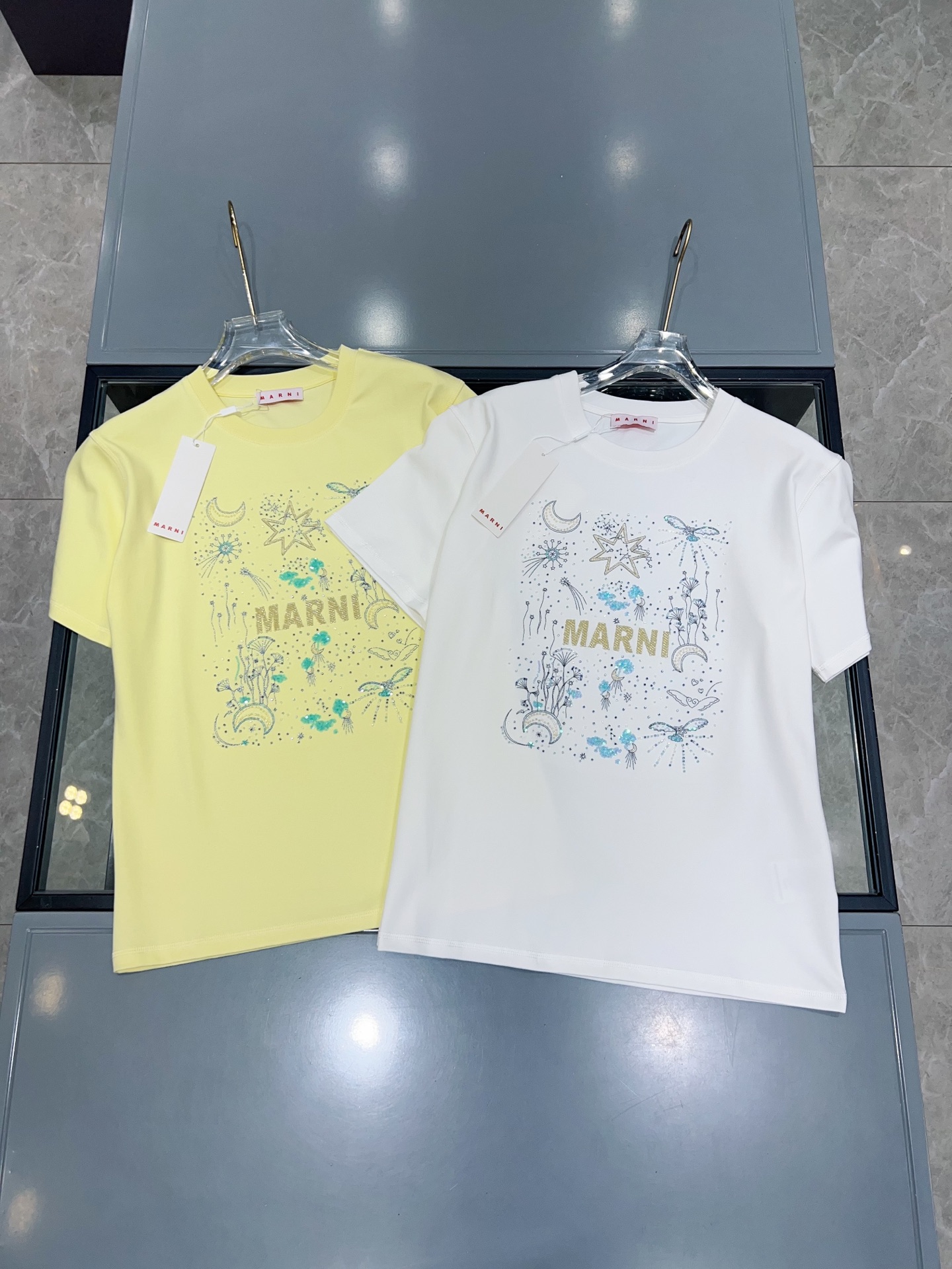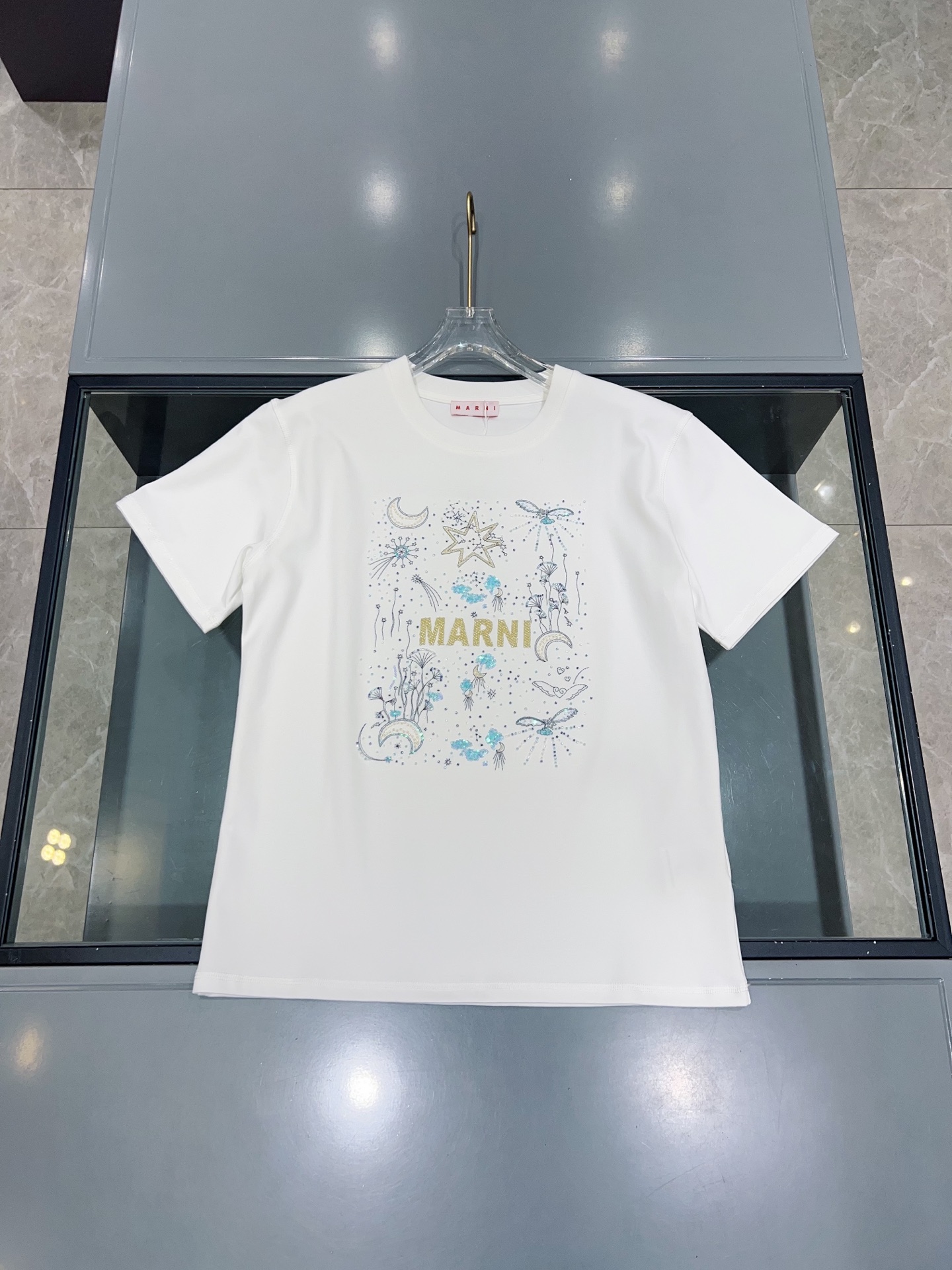디자인 / 핏: 마르니만의 예술적 감각이 돋보이는 26SS 시즌 신상 반팔 티셔츠입니다. 전면의 로고와 밤하늘의 별, 달을 형상화한 유니크한 그래픽이 특징이며, 섬세한 자수와 입체적인 비즈(Beads) 디테일이 어우러져 압도적인 존재감을 드러냅니다.