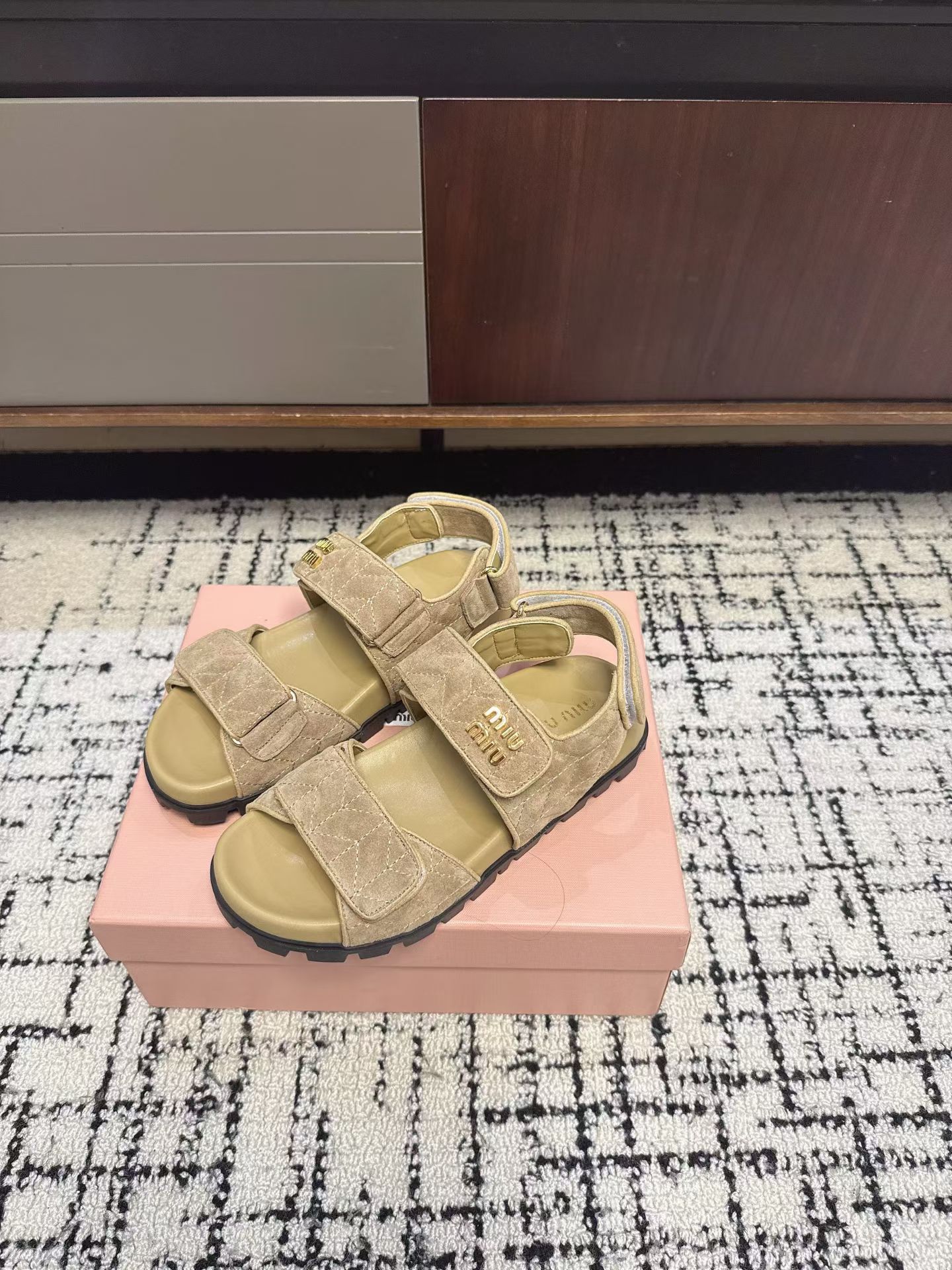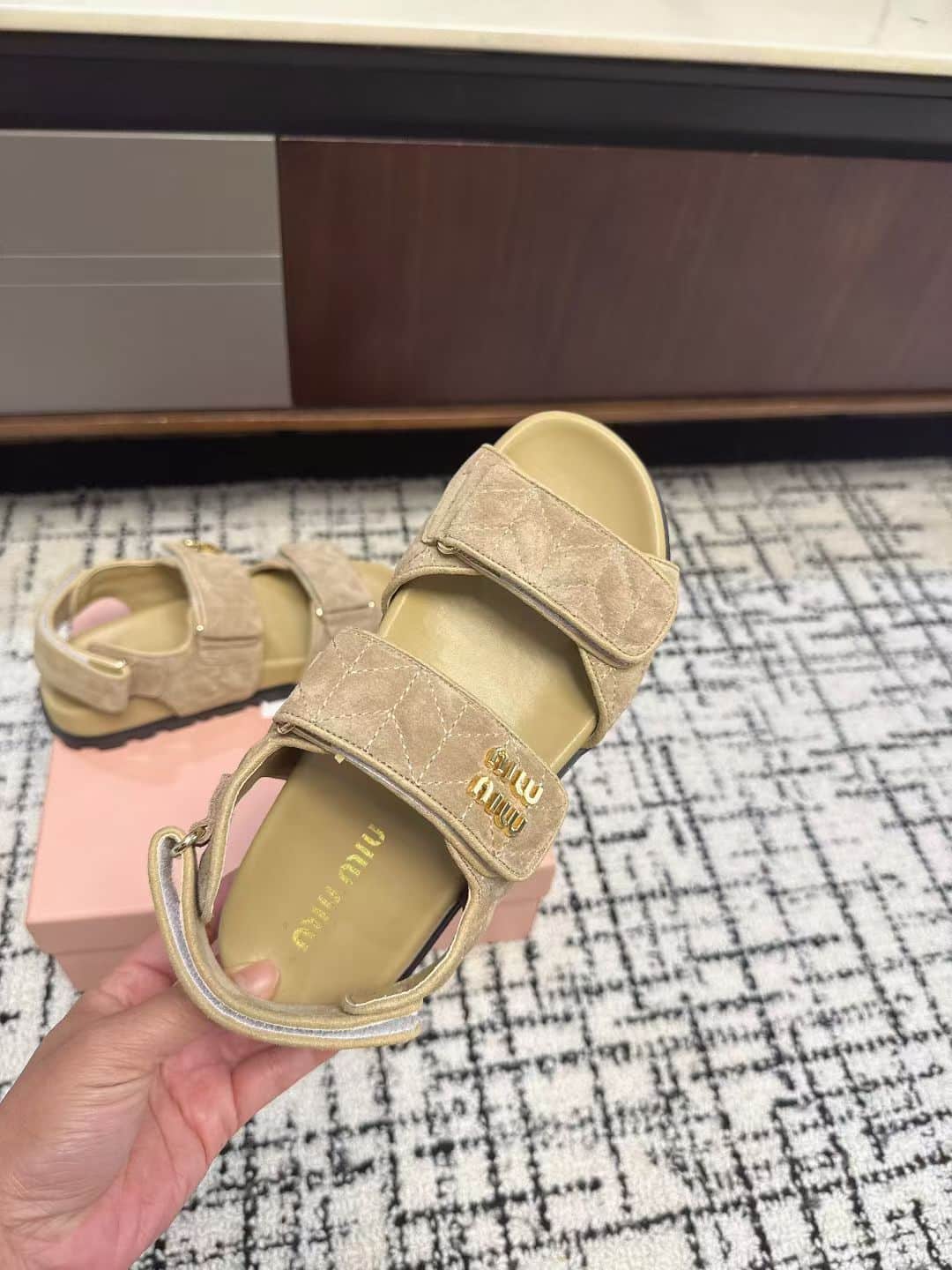 디자인: 2026 S/S 시즌 자수 로고 트리플 벨크로 스트랩 샌들 (퀼팅 자수 디테일과 골드 메탈 로고가 포인트인 디자인으로, 안정적인 백스트랩과 푹신한 쿠션감이 더해져 데일리하게 즐기기 좋은 럭셔리 캐주얼 무드)