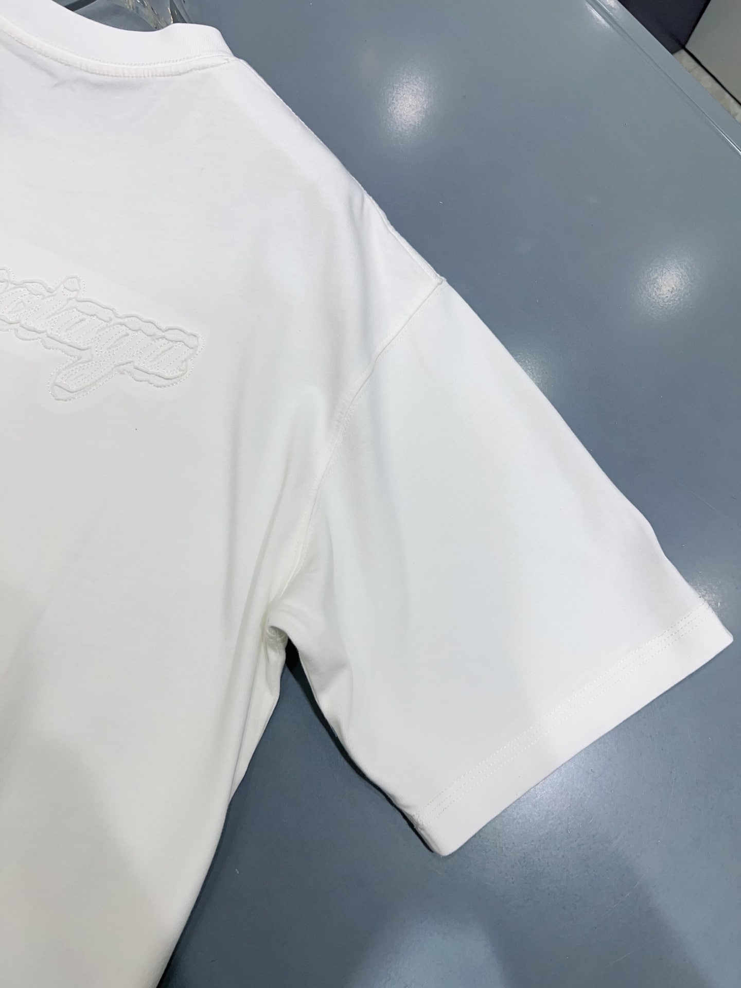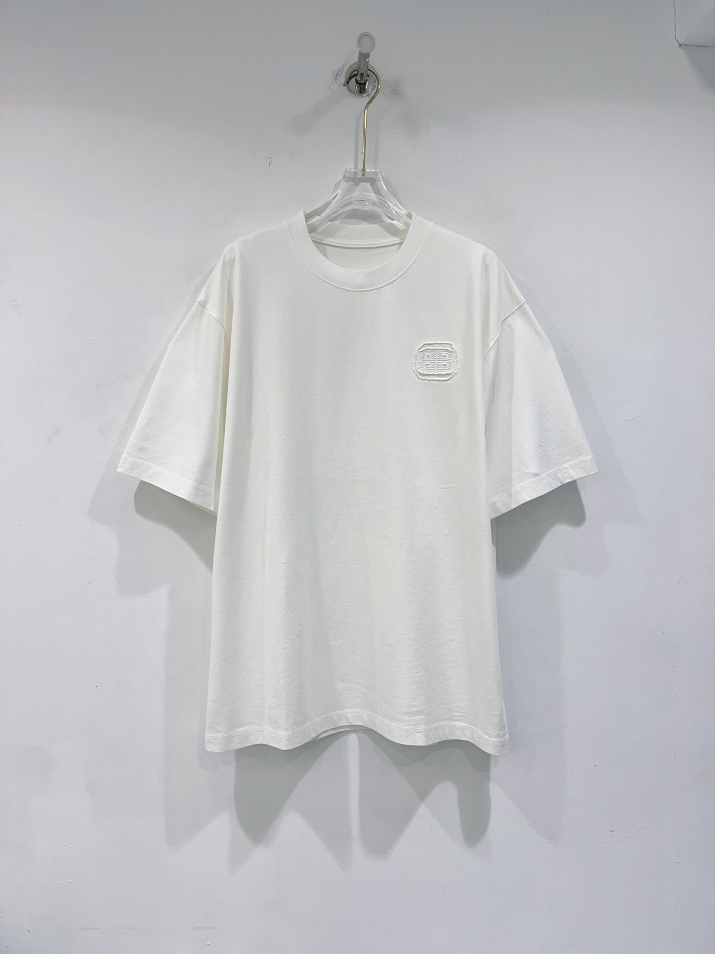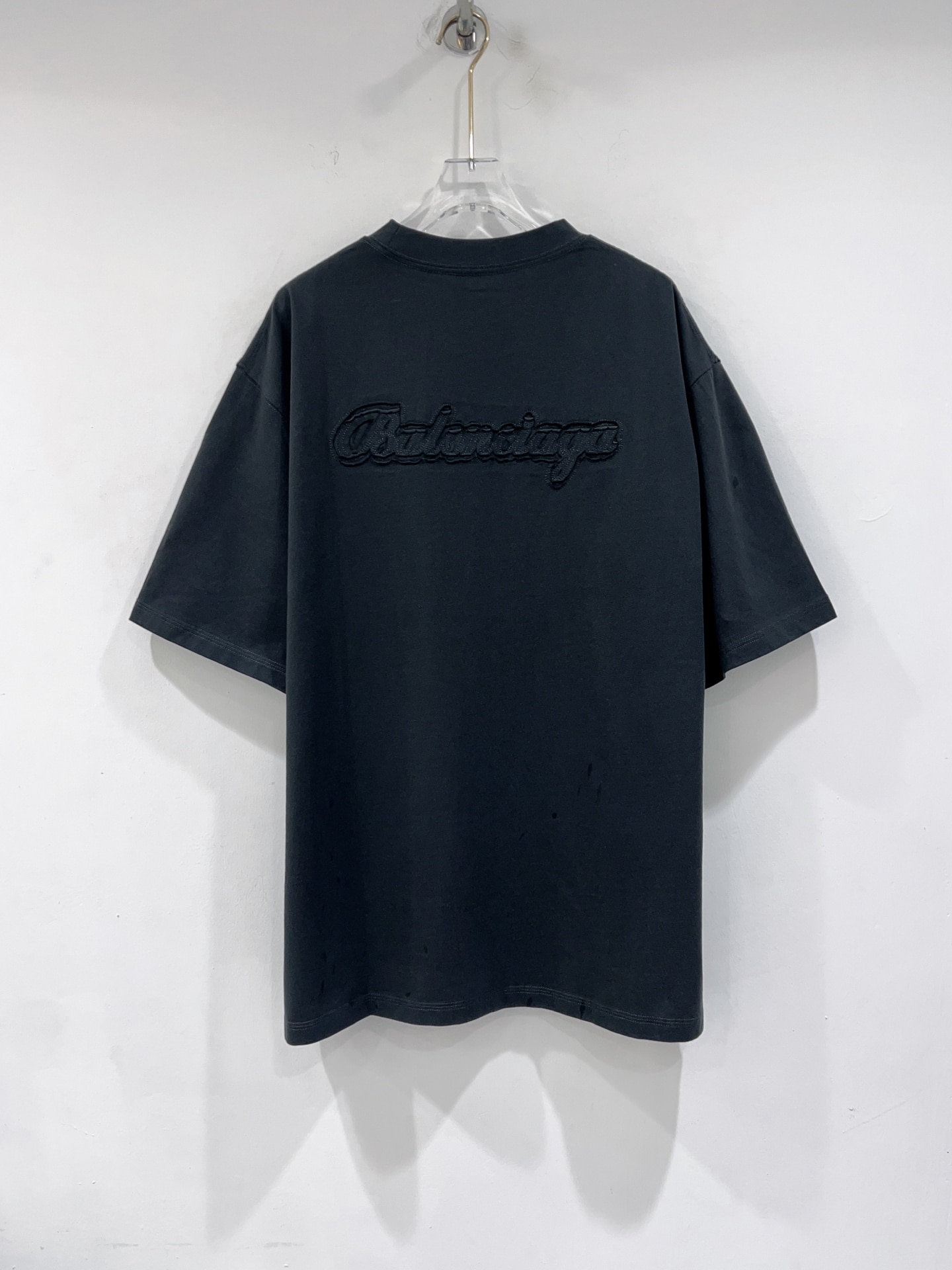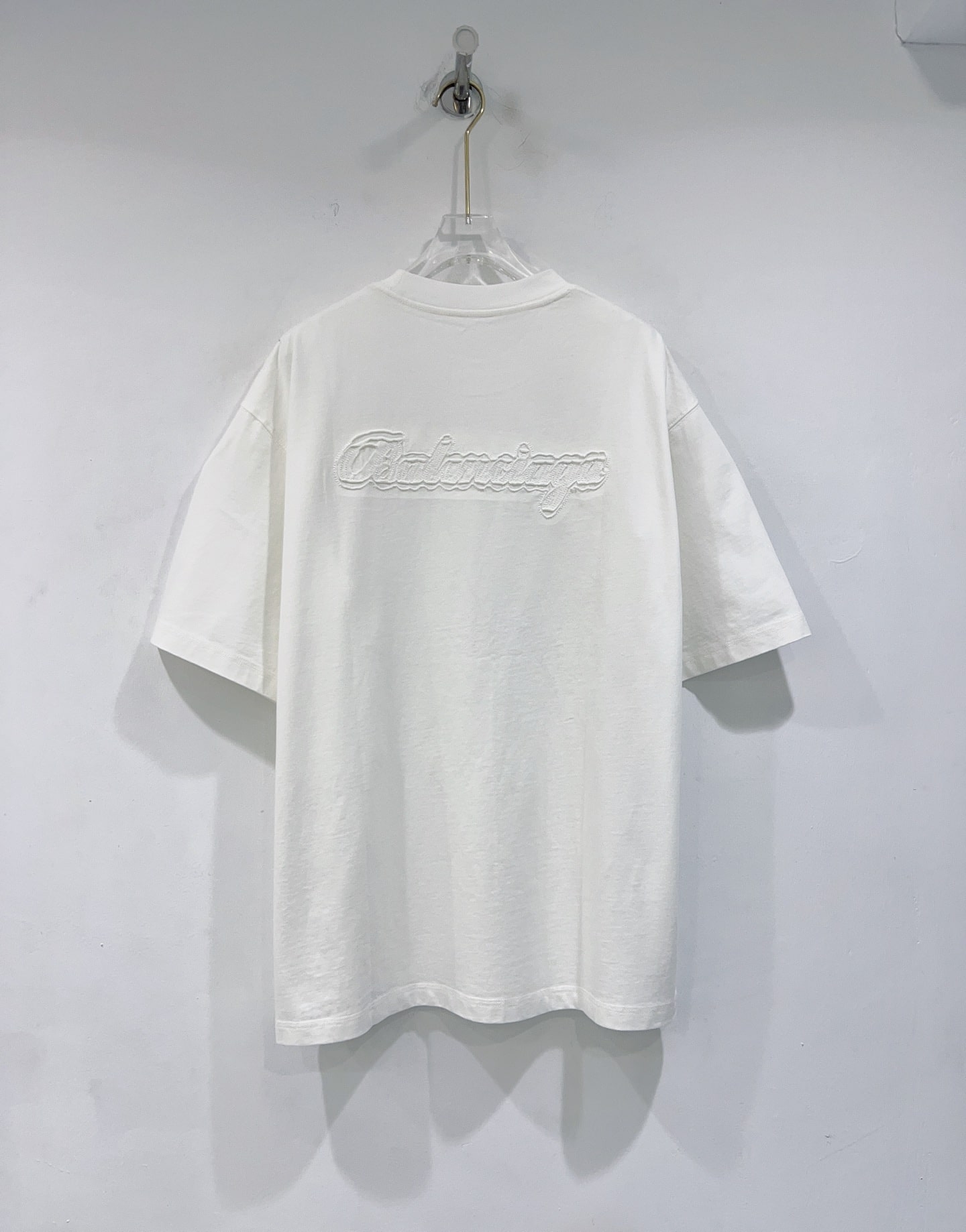 발렌시아가만의 독보적인 실루엣이 돋보이는 오버사이즈 반팔 티셔츠입니다. 전면과 후면에 적용된 톤온톤(Tone-on-Tone) 입체 자수 공법이 특징으로, 브랜드 고유의 필기체 로고를 정교하게 새겨 넣었습니다.