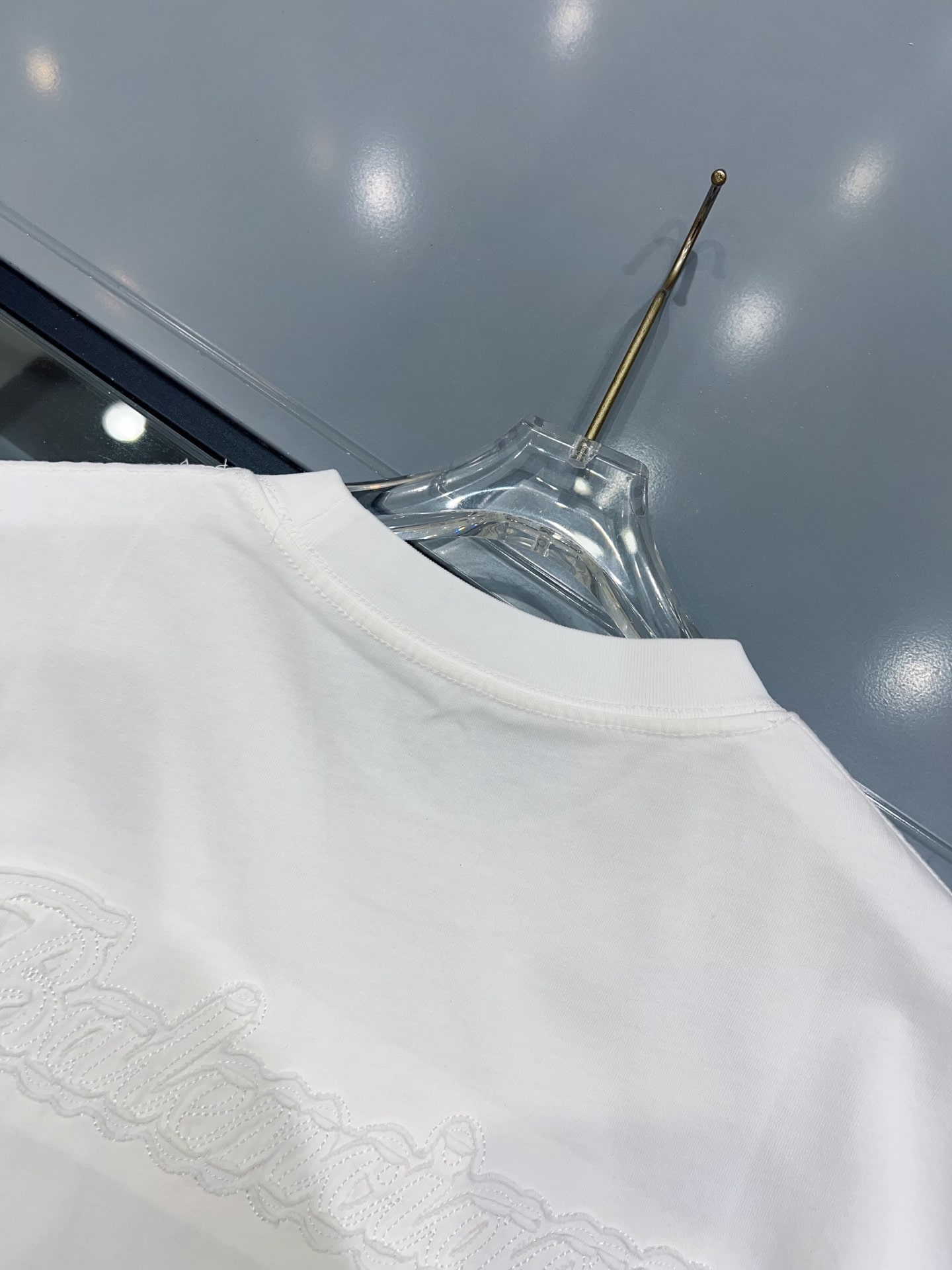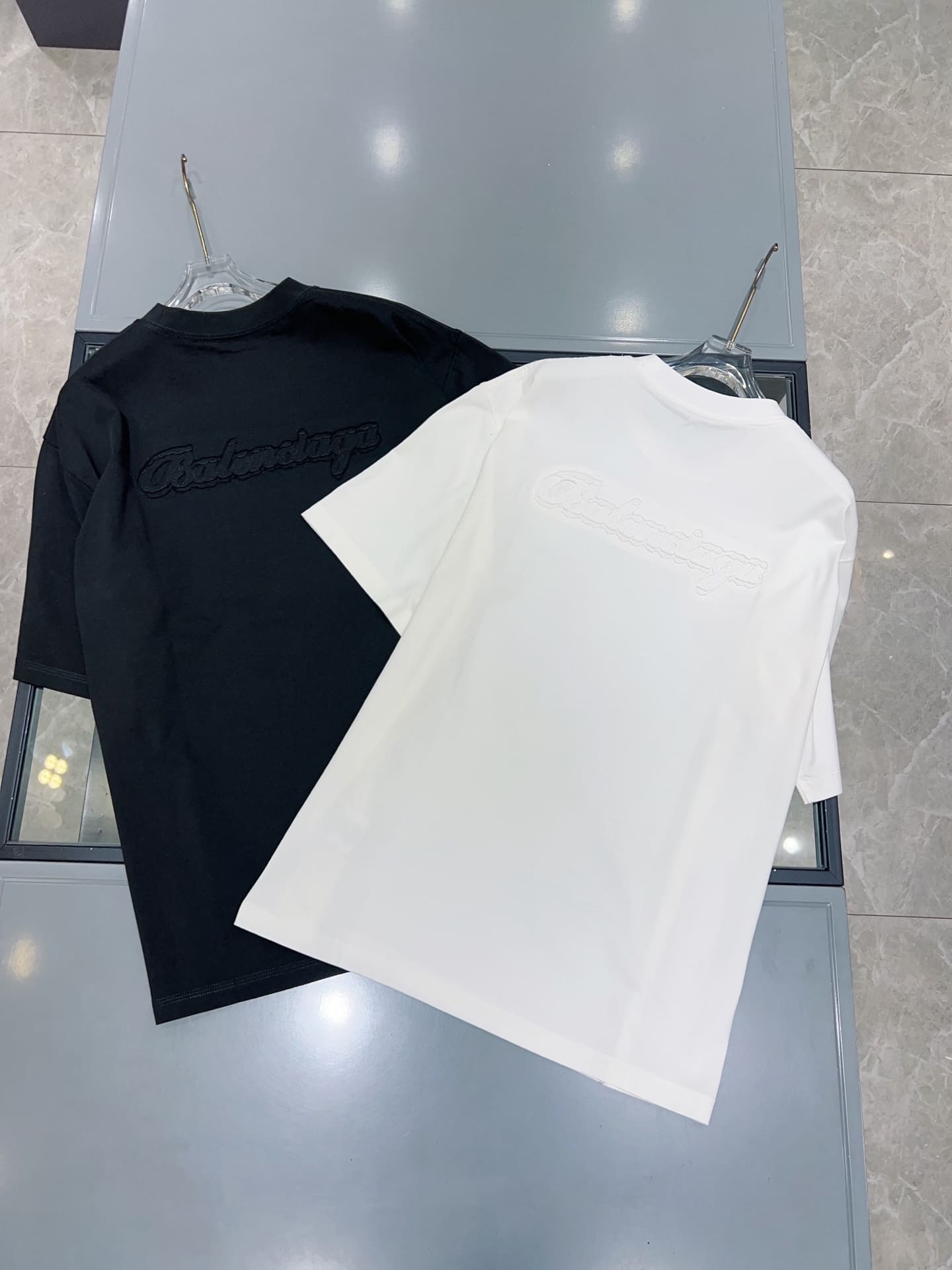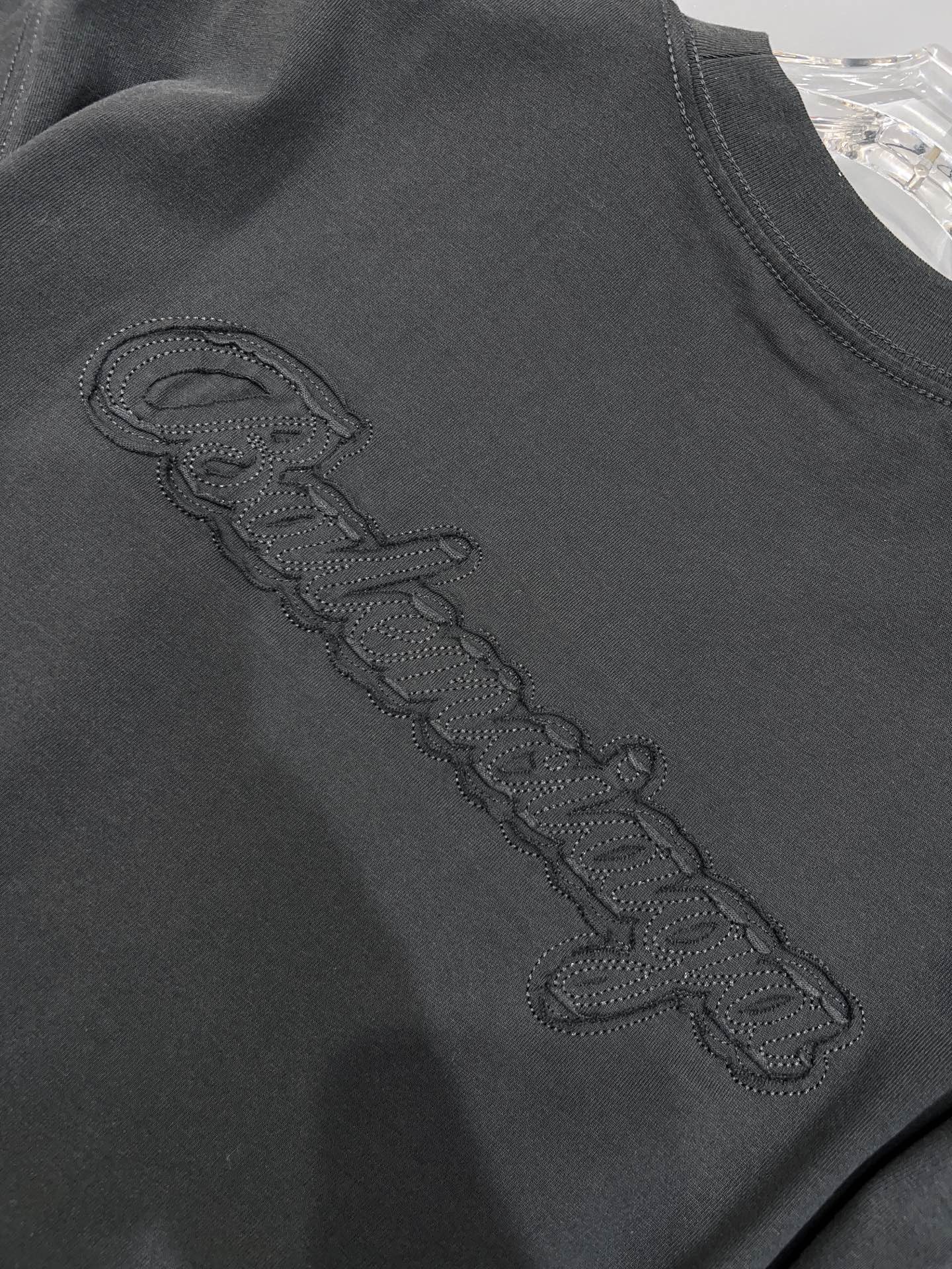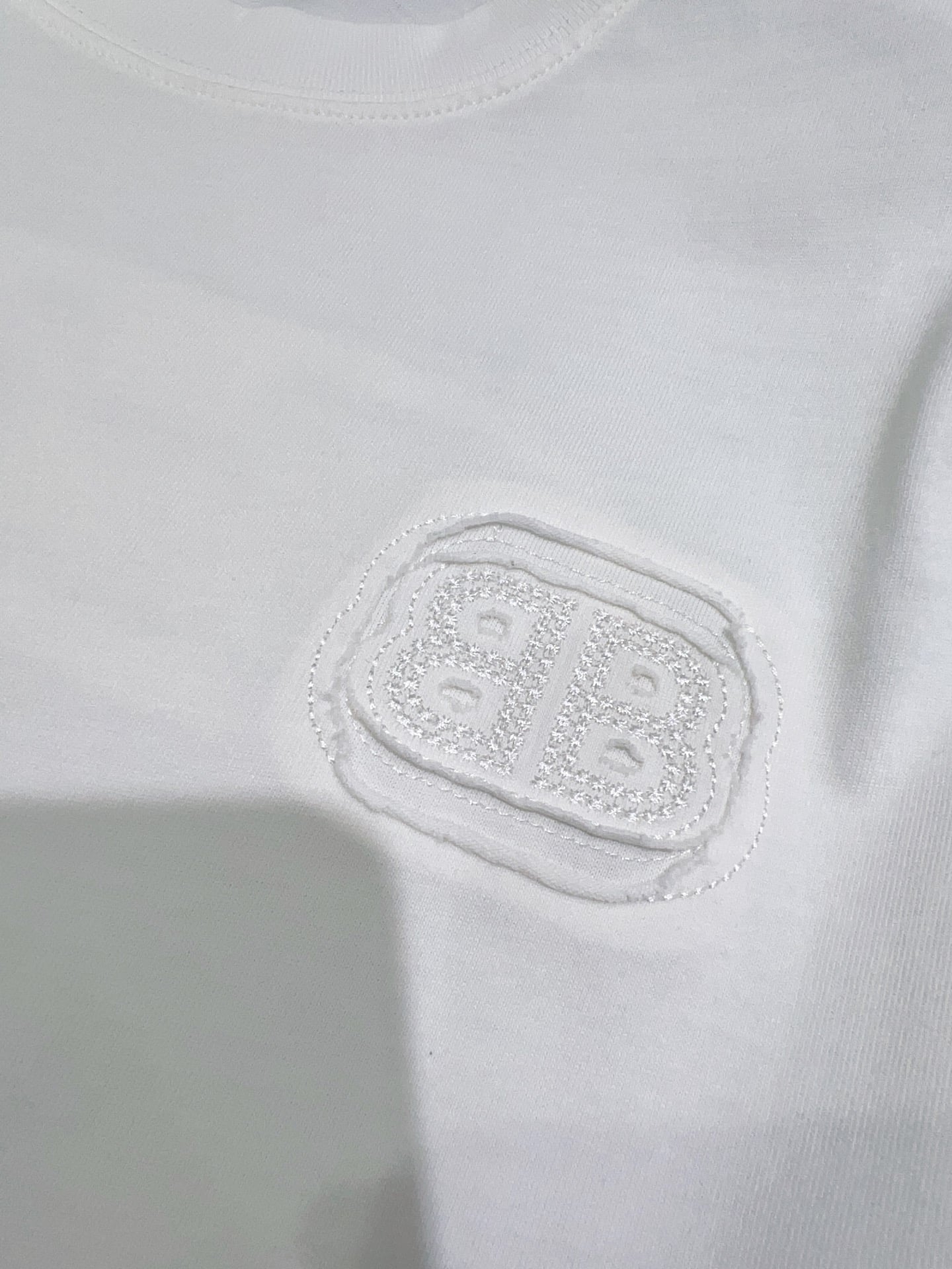 발렌시아가만의 독보적인 실루엣이 돋보이는 오버사이즈 반팔 티셔츠입니다. 전면과 후면에 적용된 톤온톤(Tone-on-Tone) 입체 자수 공법이 특징으로, 브랜드 고유의 필기체 로고를 정교하게 새겨 넣었습니다.