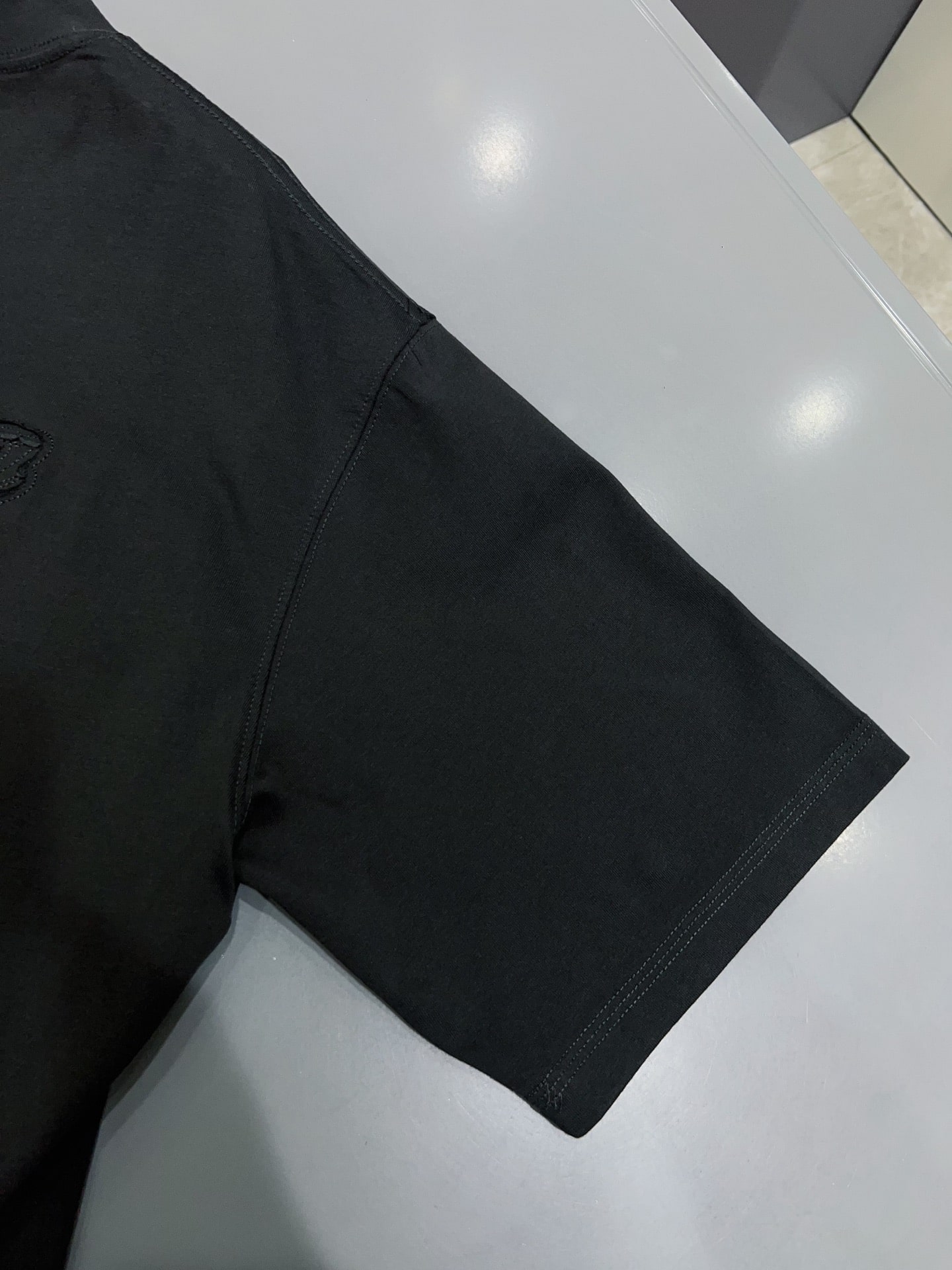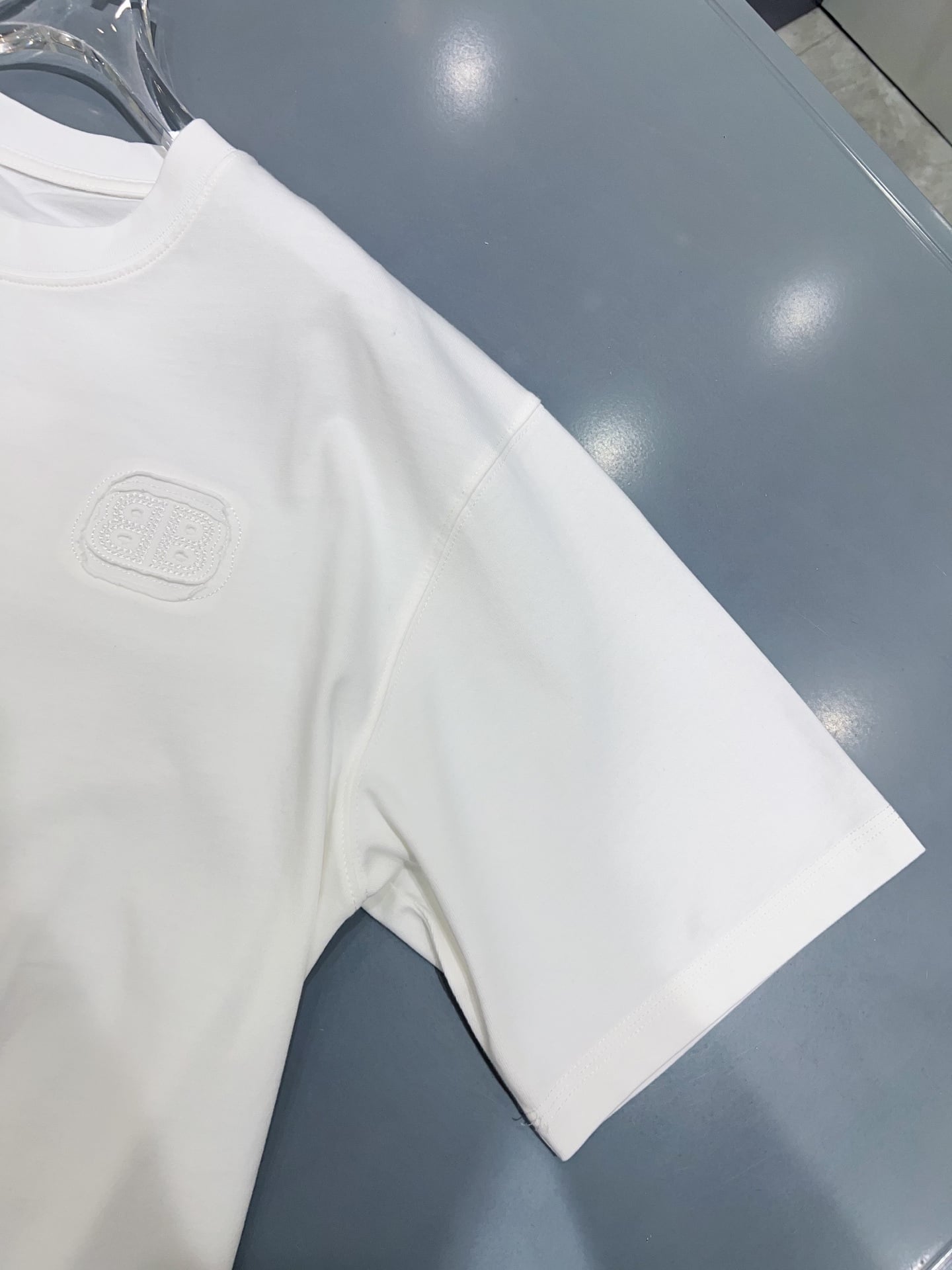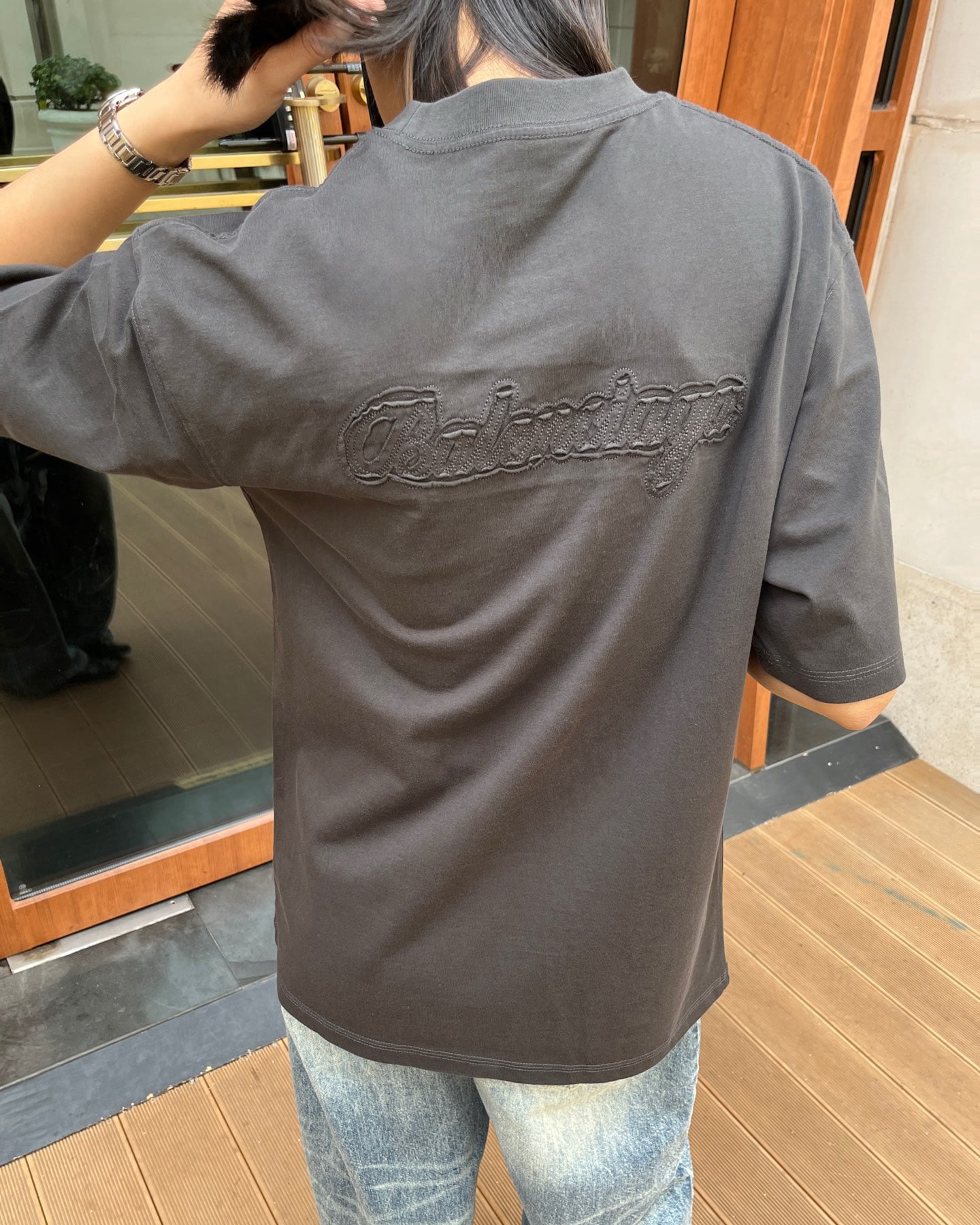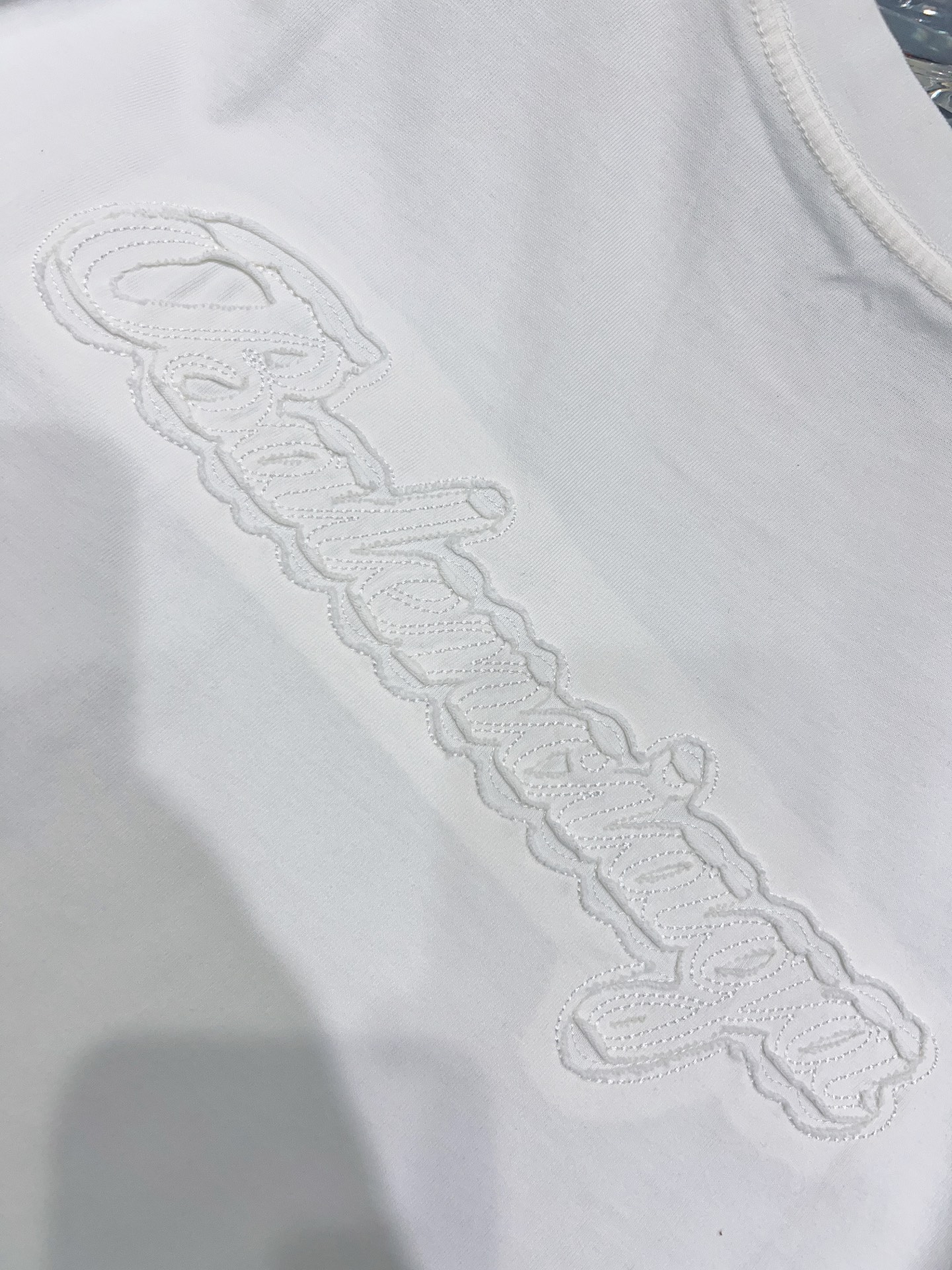 발렌시아가만의 독보적인 실루엣이 돋보이는 오버사이즈 반팔 티셔츠입니다. 전면과 후면에 적용된 톤온톤(Tone-on-Tone) 입체 자수 공법이 특징으로, 브랜드 고유의 필기체 로고를 정교하게 새겨 넣었습니다.