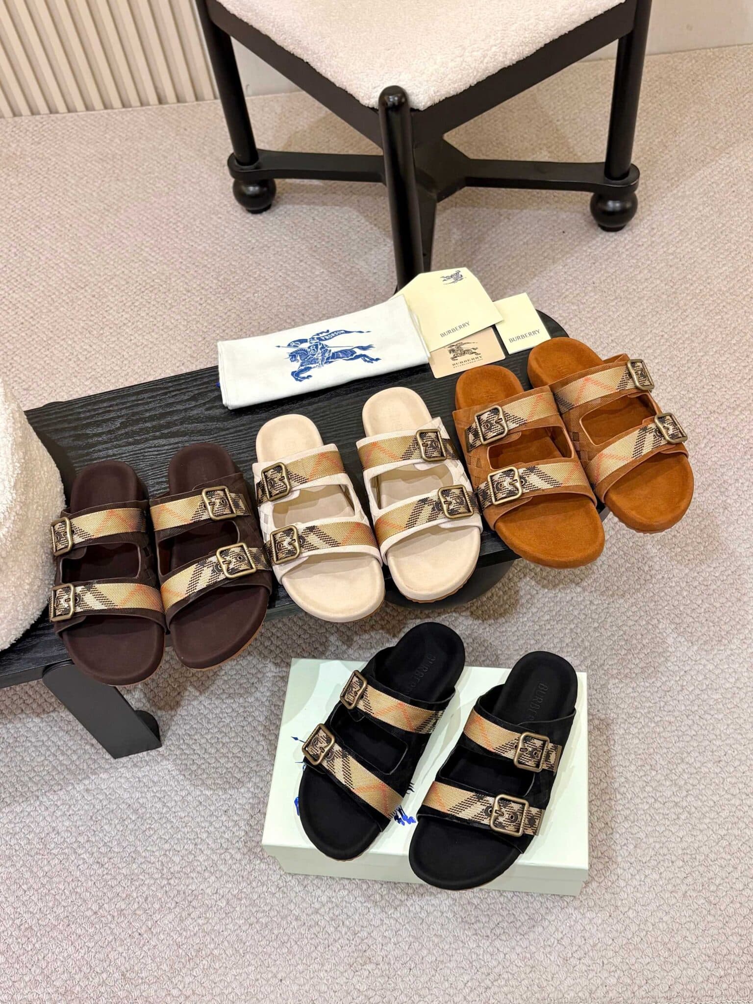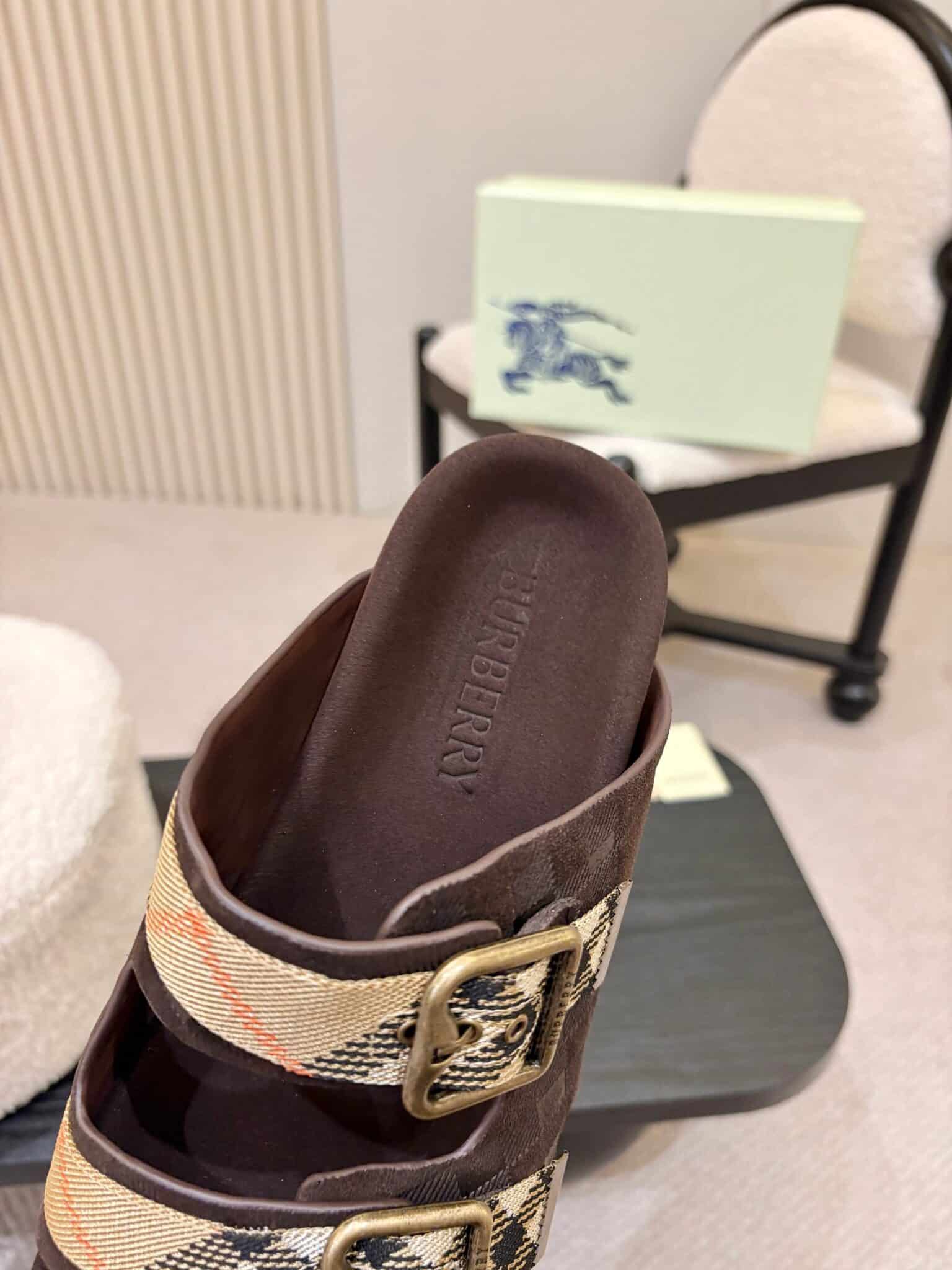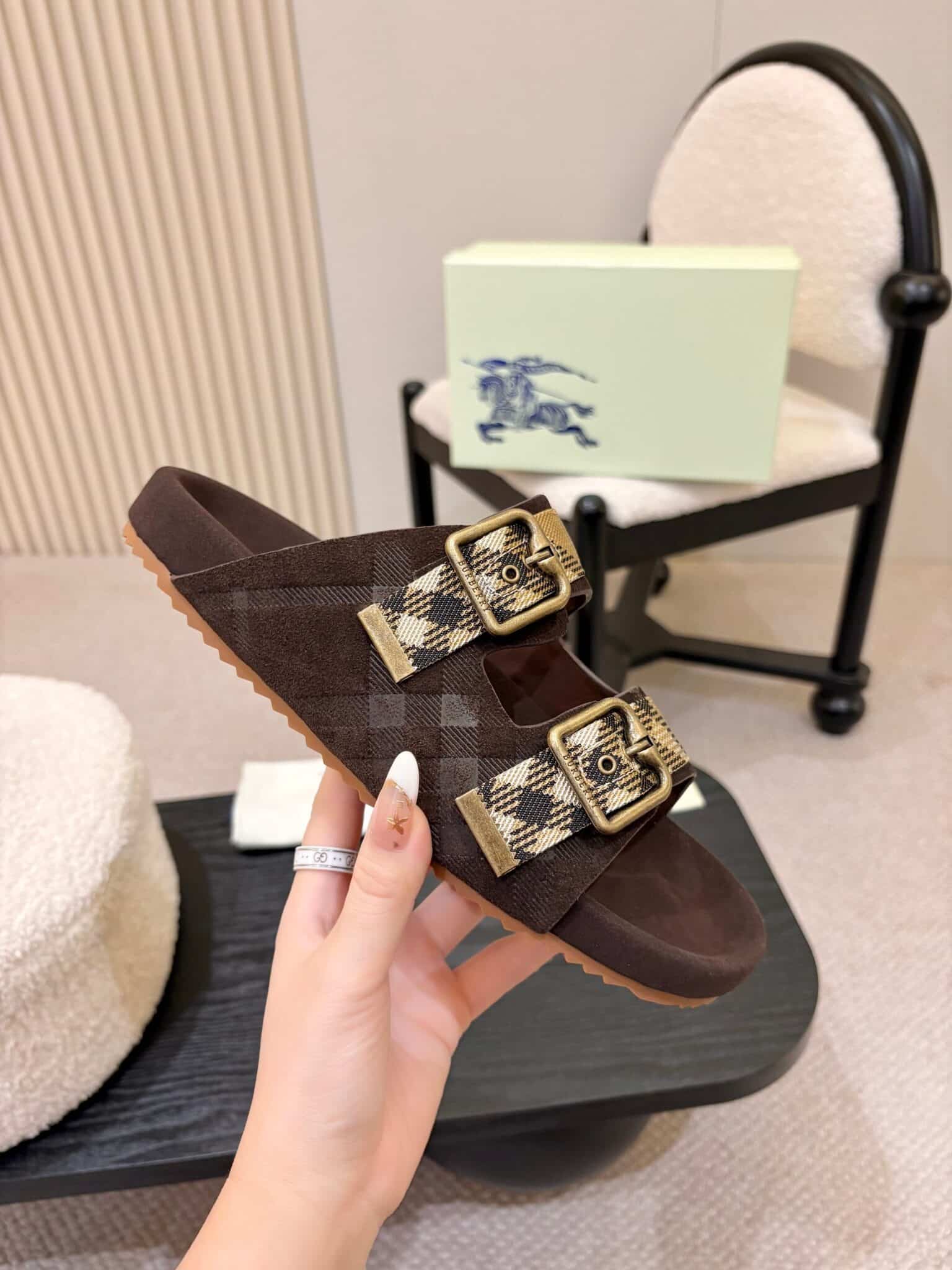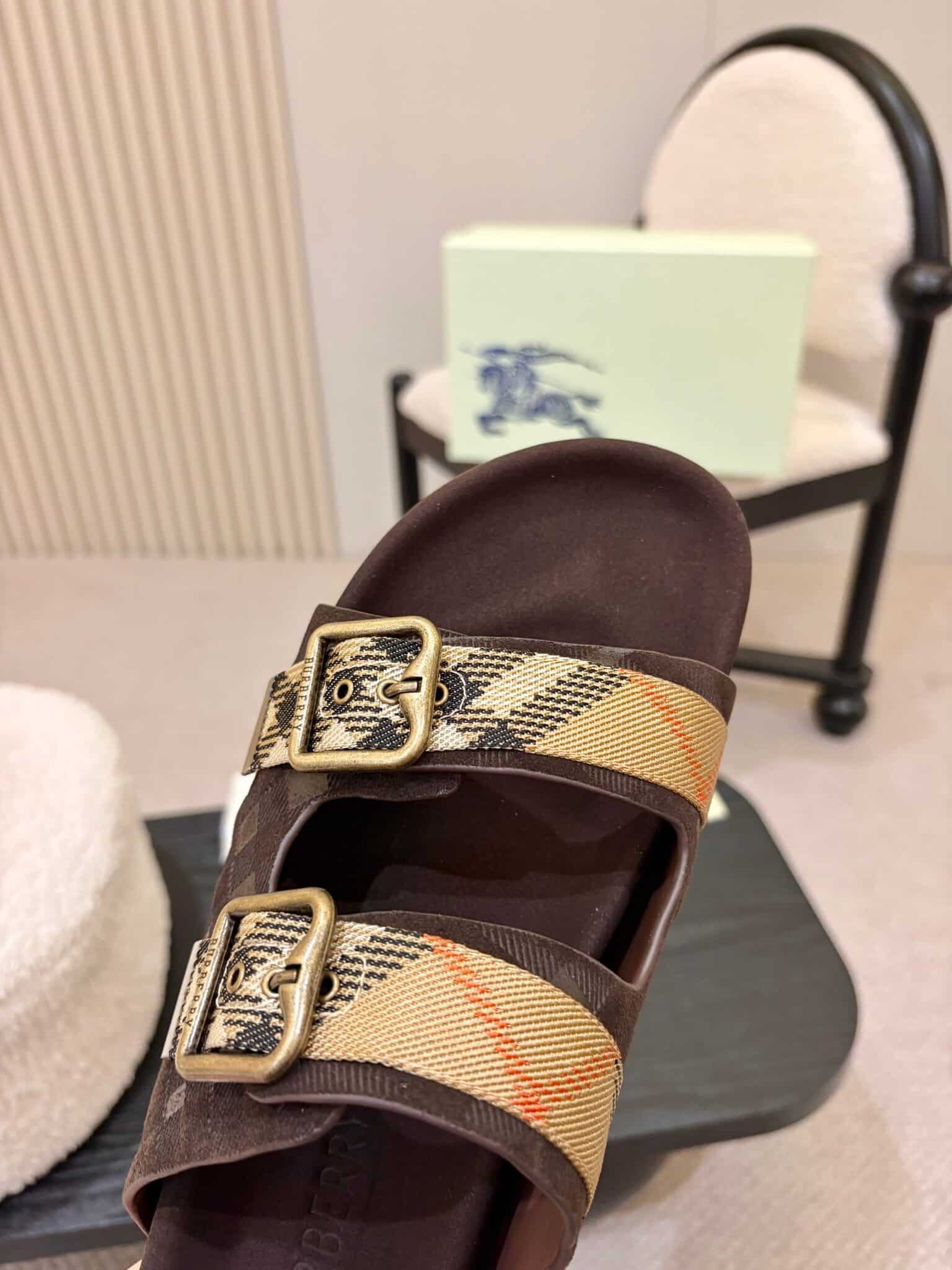 디자인: 체크 자카드 더블 스트랩 슬라이드 (B 로고 버클 디테일, 스웨이드 바디에 체크 엠보싱과 자카드 스트랩이 조화로운 럭셔리 캐주얼 스타일)
