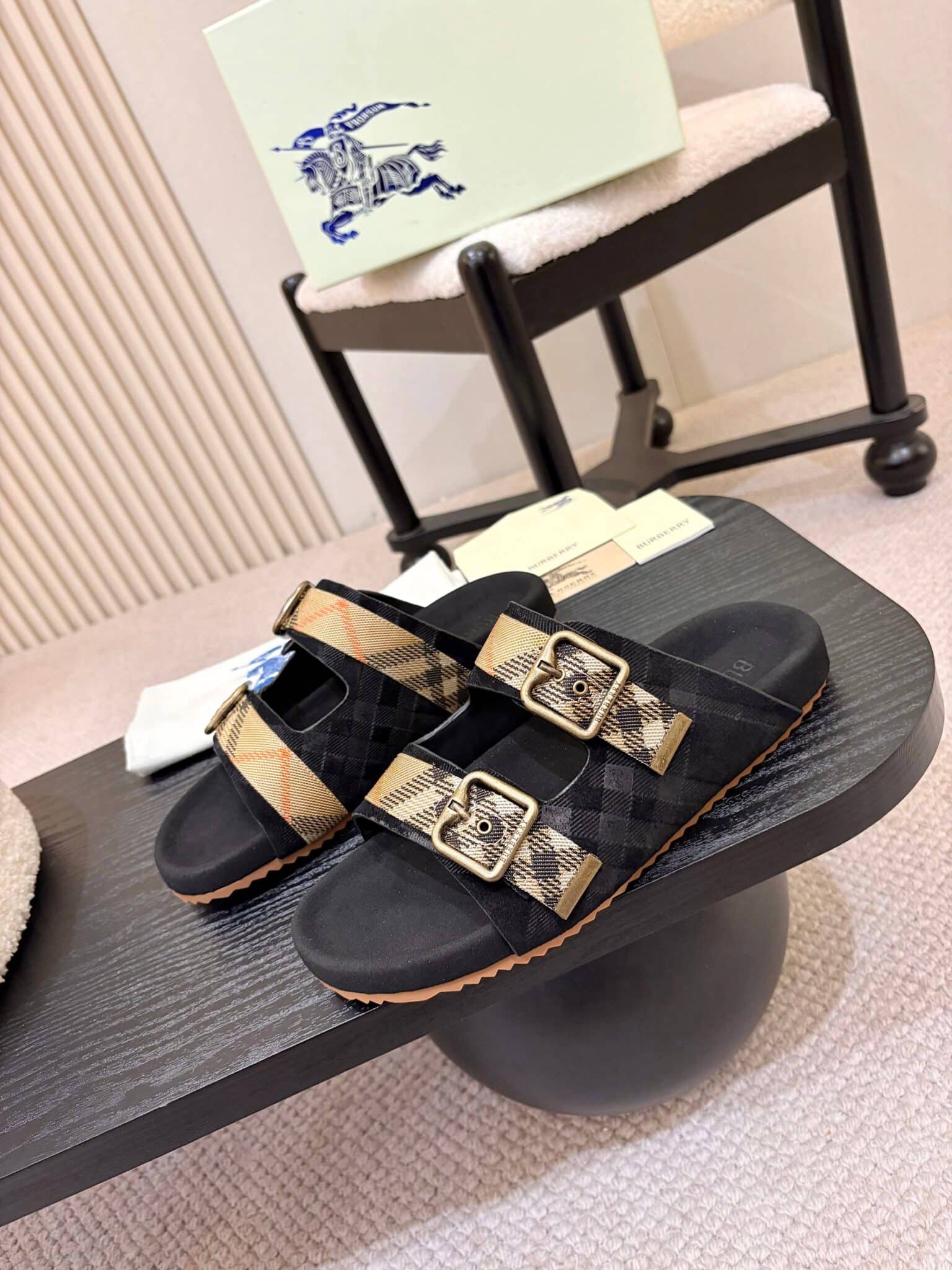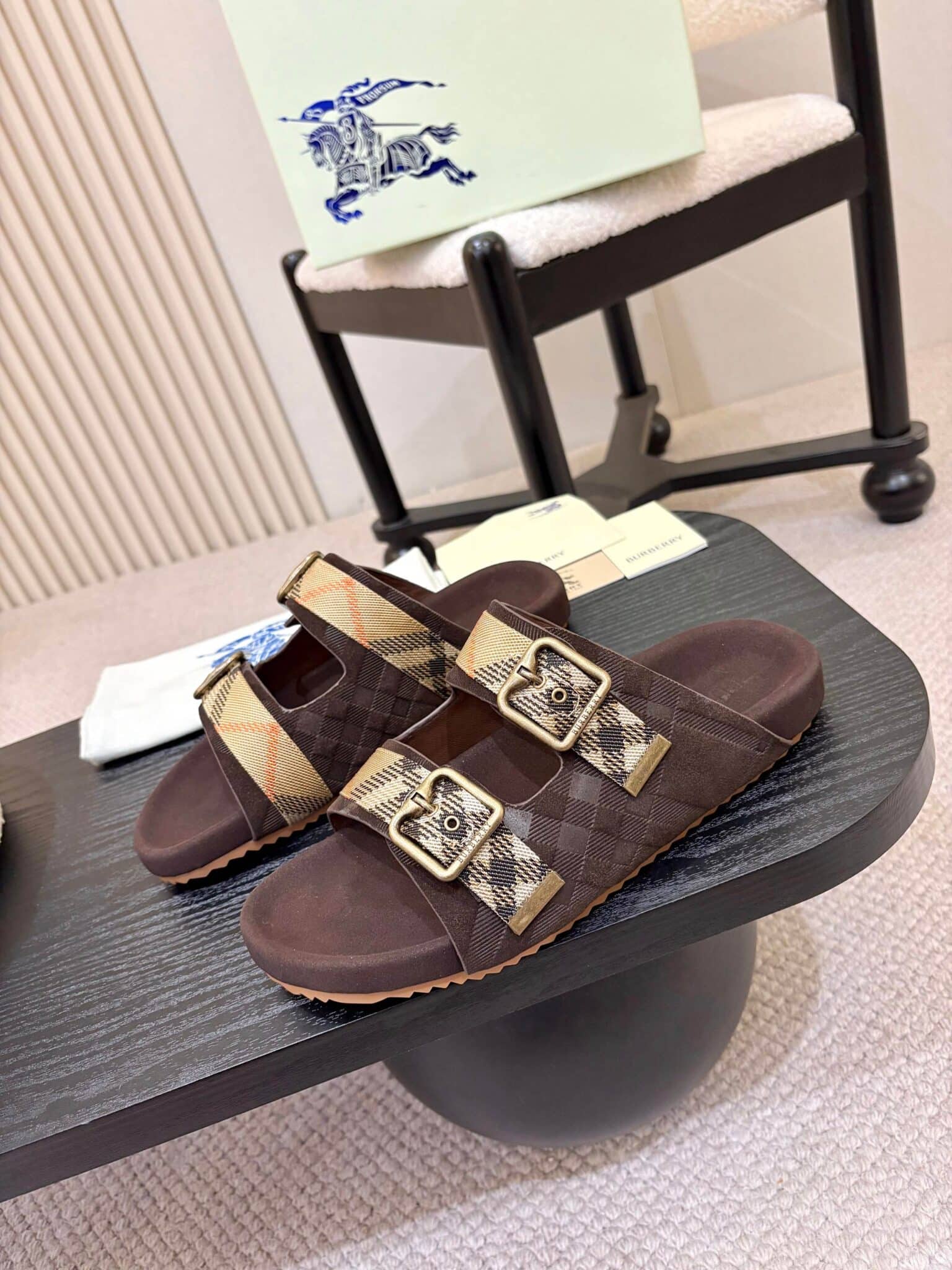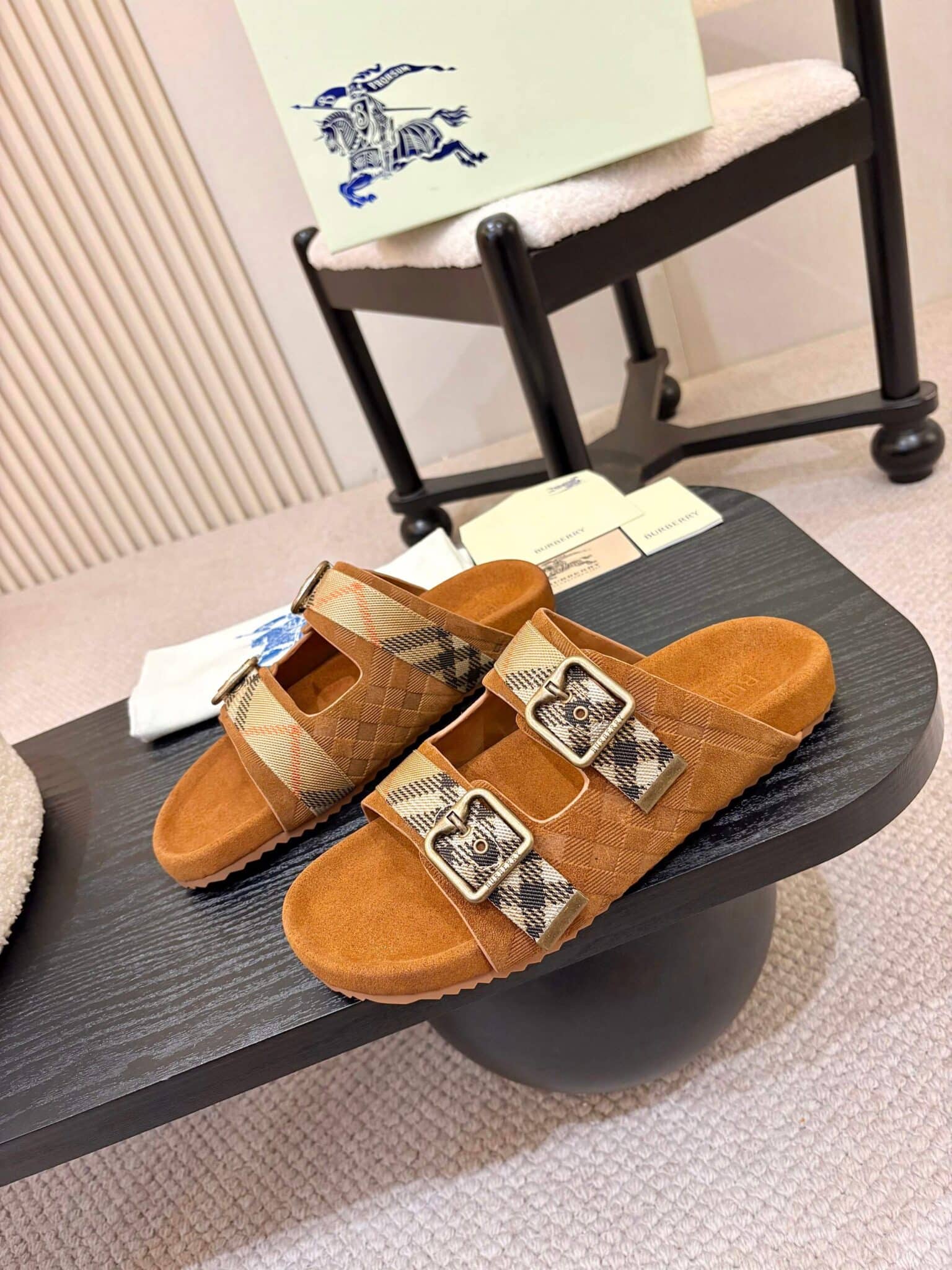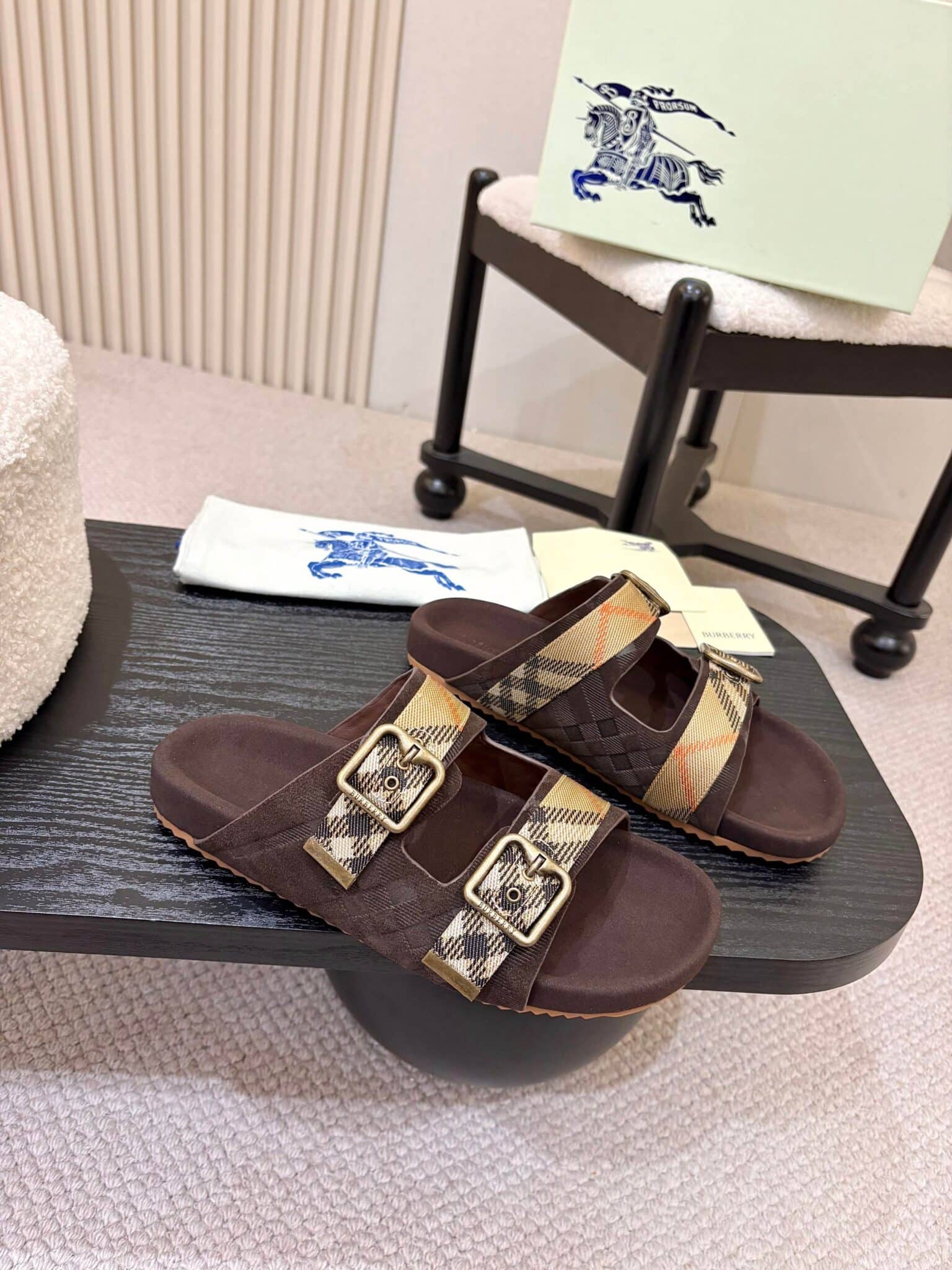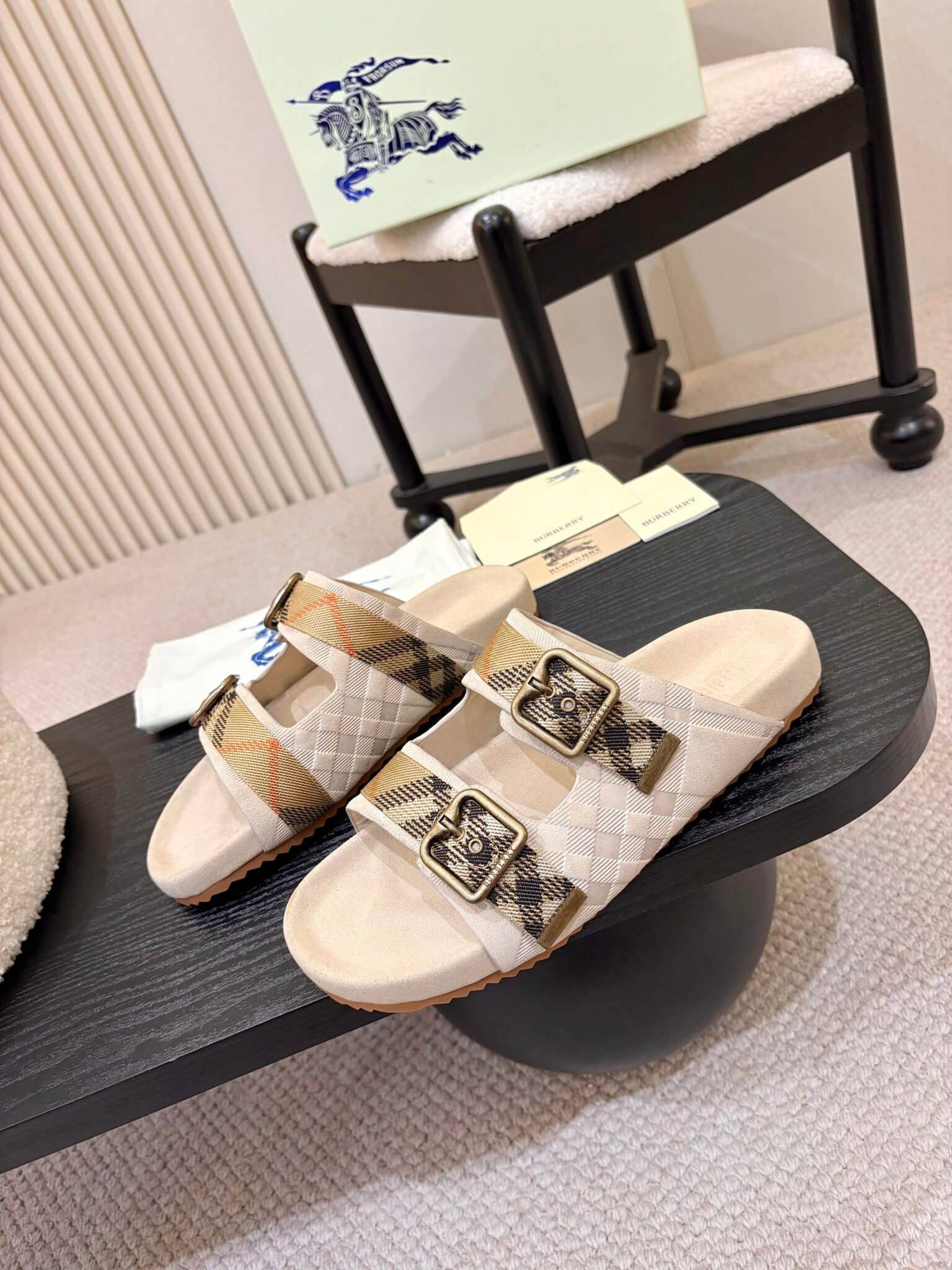 디자인: 체크 자카드 더블 스트랩 슬라이드 (B 로고 버클 디테일, 스웨이드 바디에 체크 엠보싱과 자카드 스트랩이 조화로운 럭셔리 캐주얼 스타일)