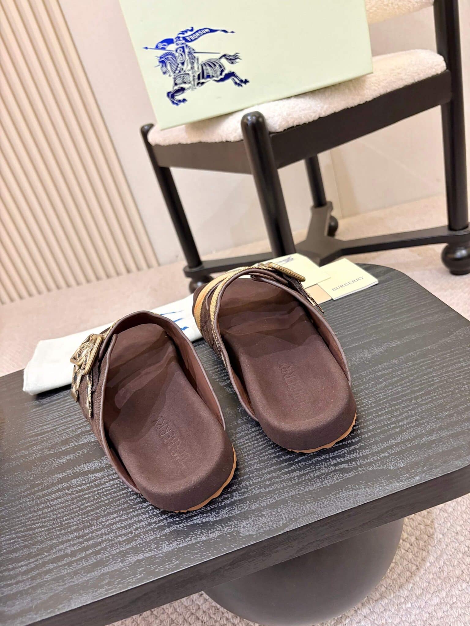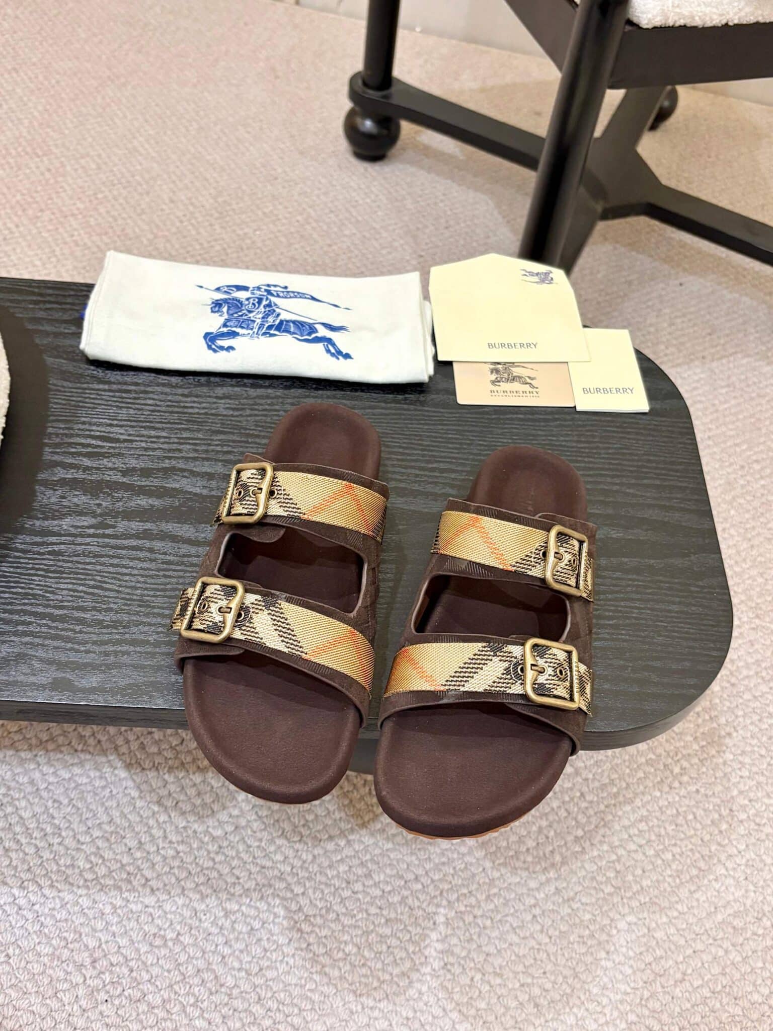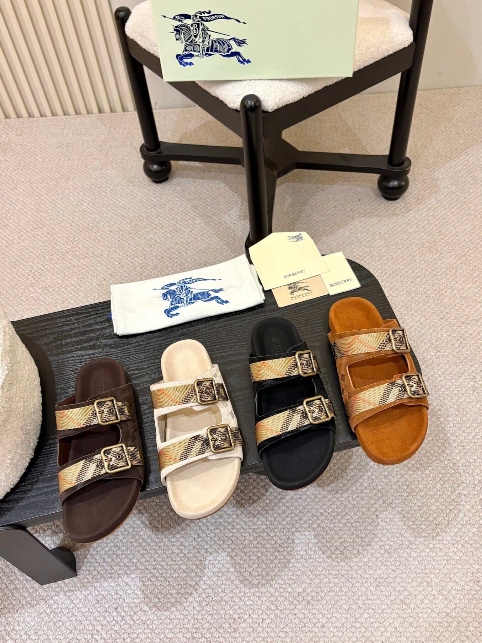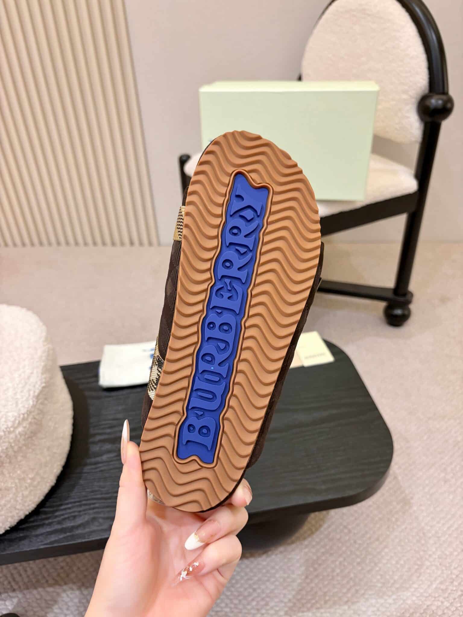 디자인: 체크 자카드 더블 스트랩 슬라이드 (B 로고 버클 디테일, 스웨이드 바디에 체크 엠보싱과 자카드 스트랩이 조화로운 럭셔리 캐주얼 스타일)