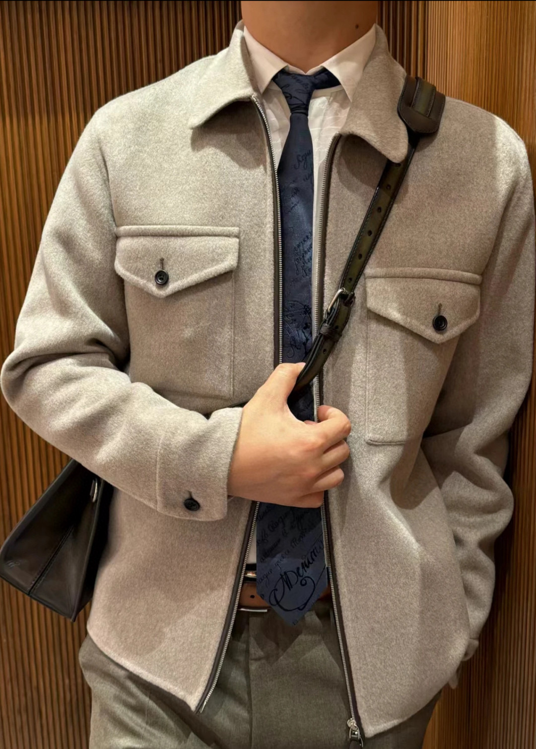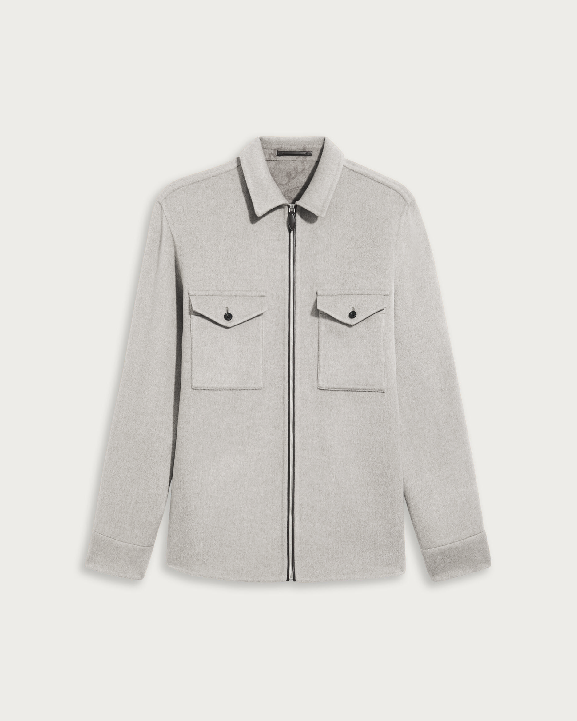 Berluti 2025 가을·겨울 시즌 신작으로, 도시적인 여유와 감각을 동시에 담아낸 울·캐시미어 혼방 셔츠 자켓. 부드럽고 유연한 질감이 돋보이며, 깔끔한 실루엣으로 다양한 스타일에 매치하기 좋은 아이템이다.