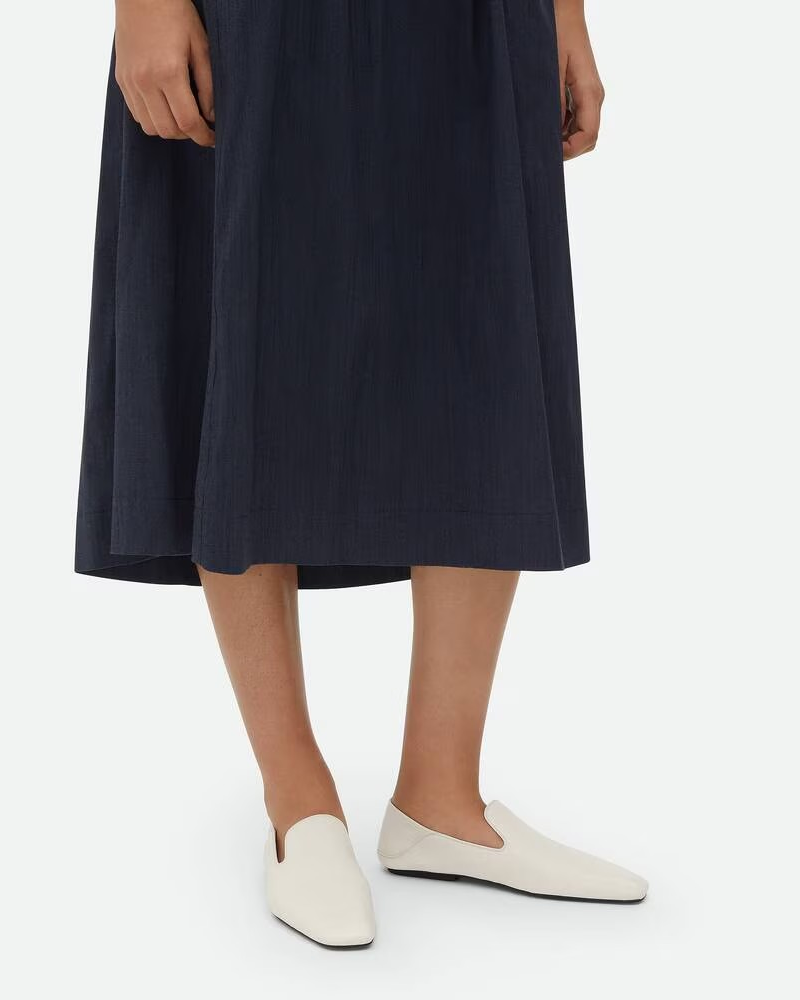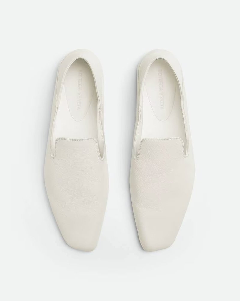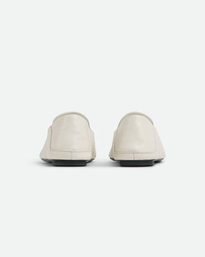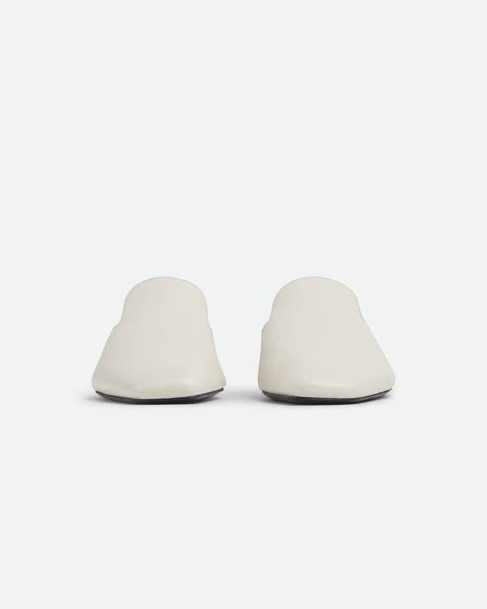 뒷면을 접을 수 있는 디자인이 돋보이는 염소가죽 소재의 유연한 슬리퍼.
