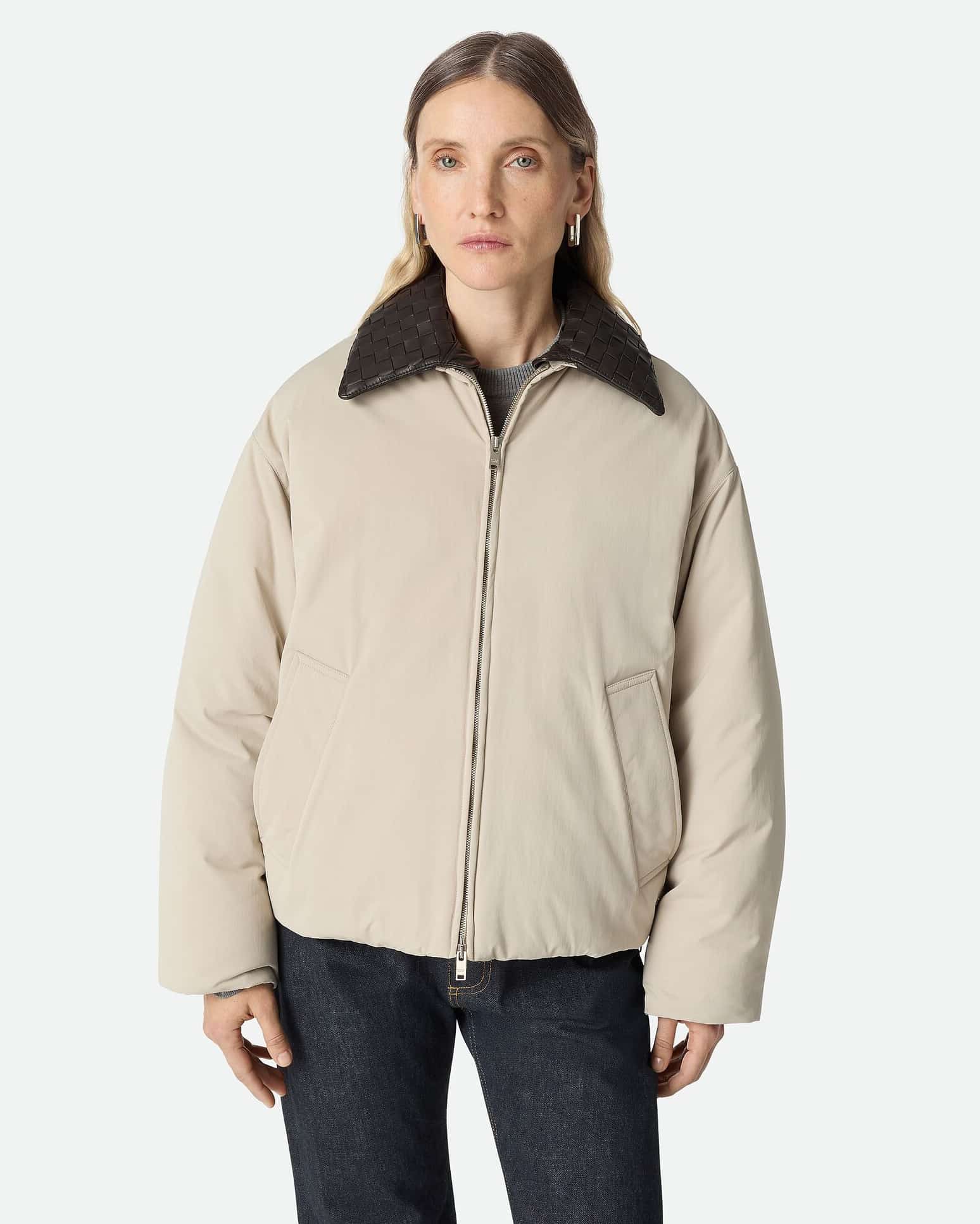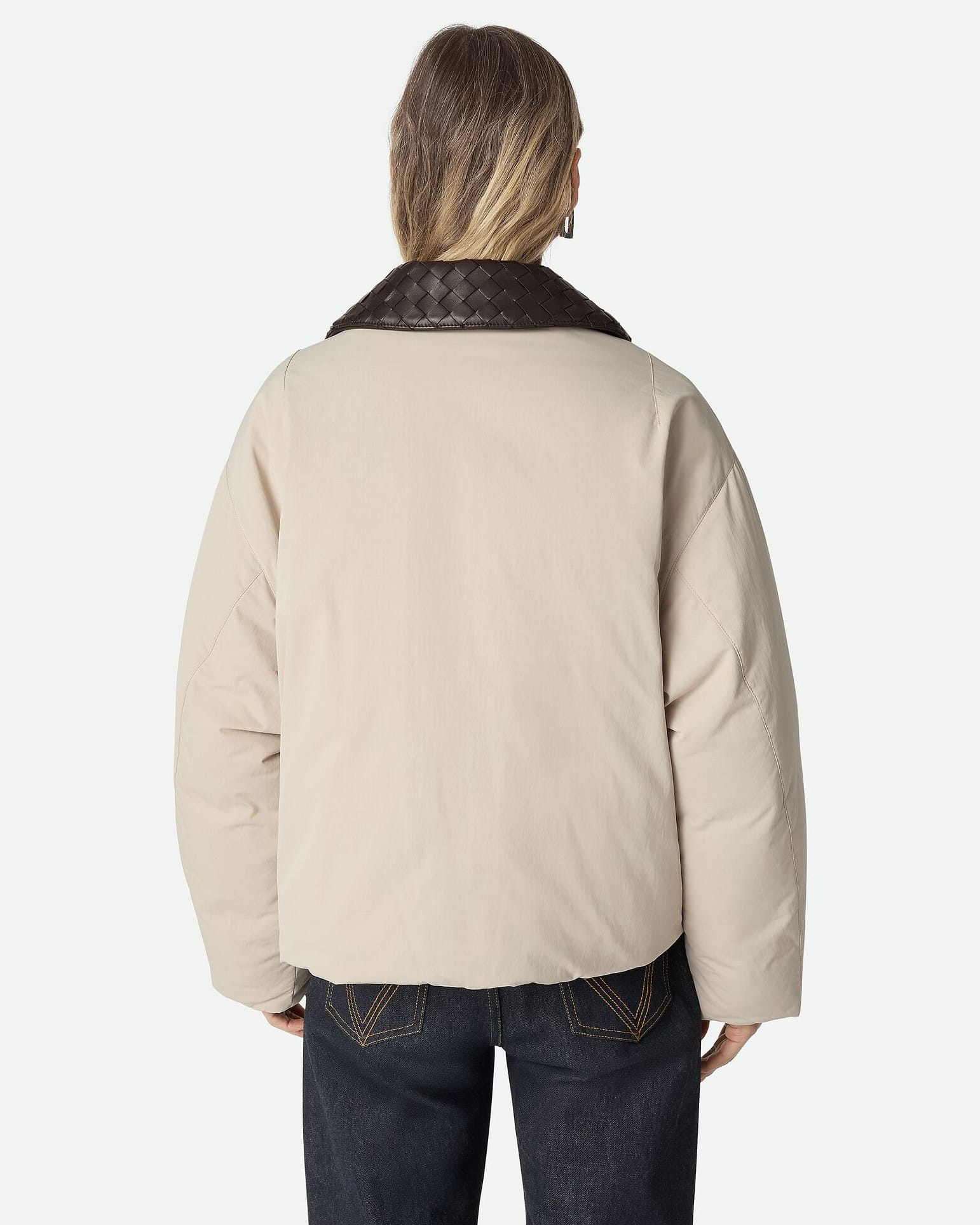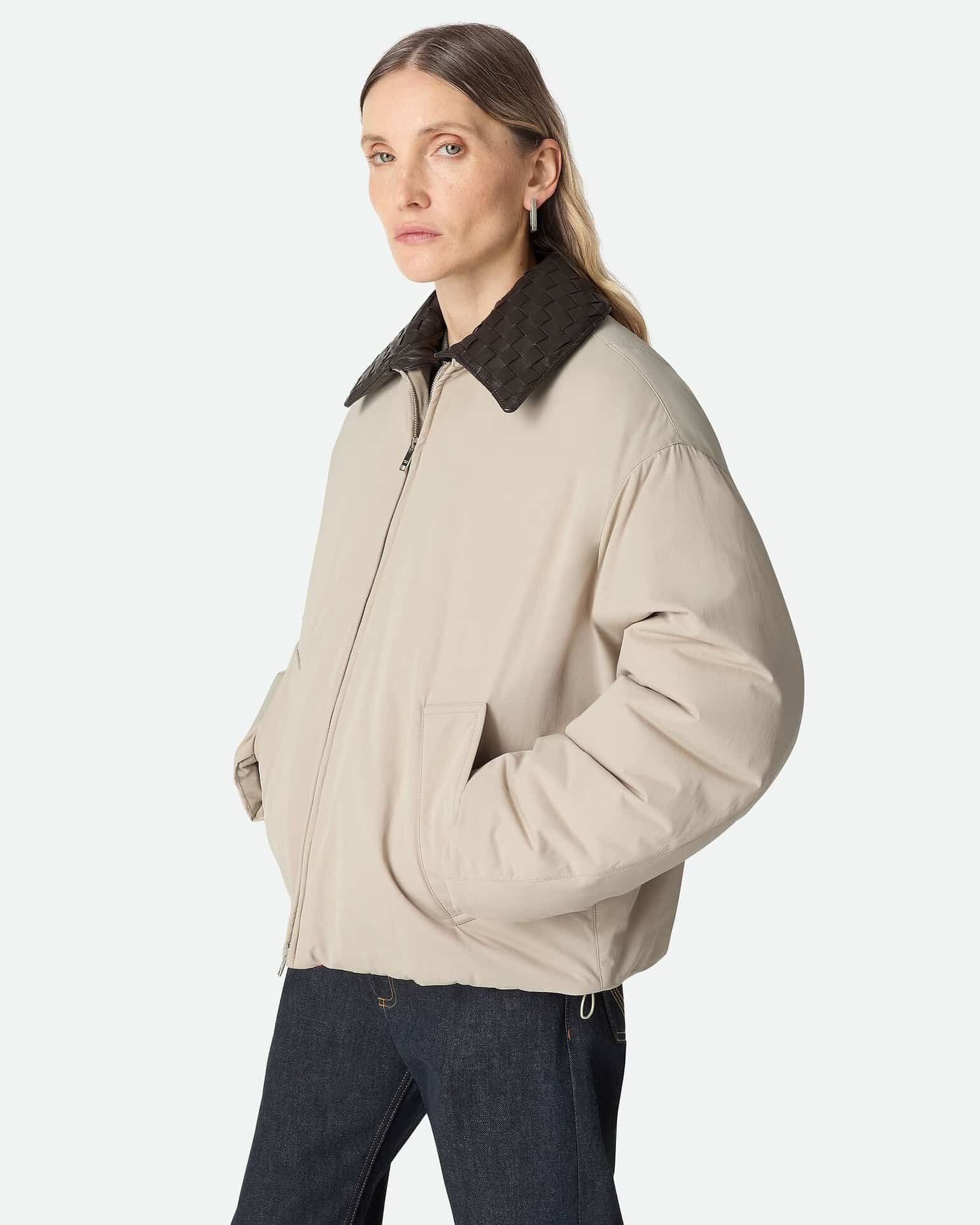 카라에는 보테가 베네타의 상징적인 인트레치아토 기법을 적용한 양가죽 디테일을 더해, 다운 특유의 볼륨감과 장인적 정교함이 조화를 이룬다. 패브릭의 부드러움과 가죽 위빙의 섬세한 질감 대비는 촉각과 시각 모두에서 고급스러움을 전하며, “따뜻함은 부피가 아니라 디테일에 있다”는 브랜드 철학을 은근하게 드러낸다. 일상적인 겨울 착장부터 포멀한 도심 스타일링까지 자연스럽게 어우러지는, 미니멀 럭셔리의 정수를 담은 아이템이다.