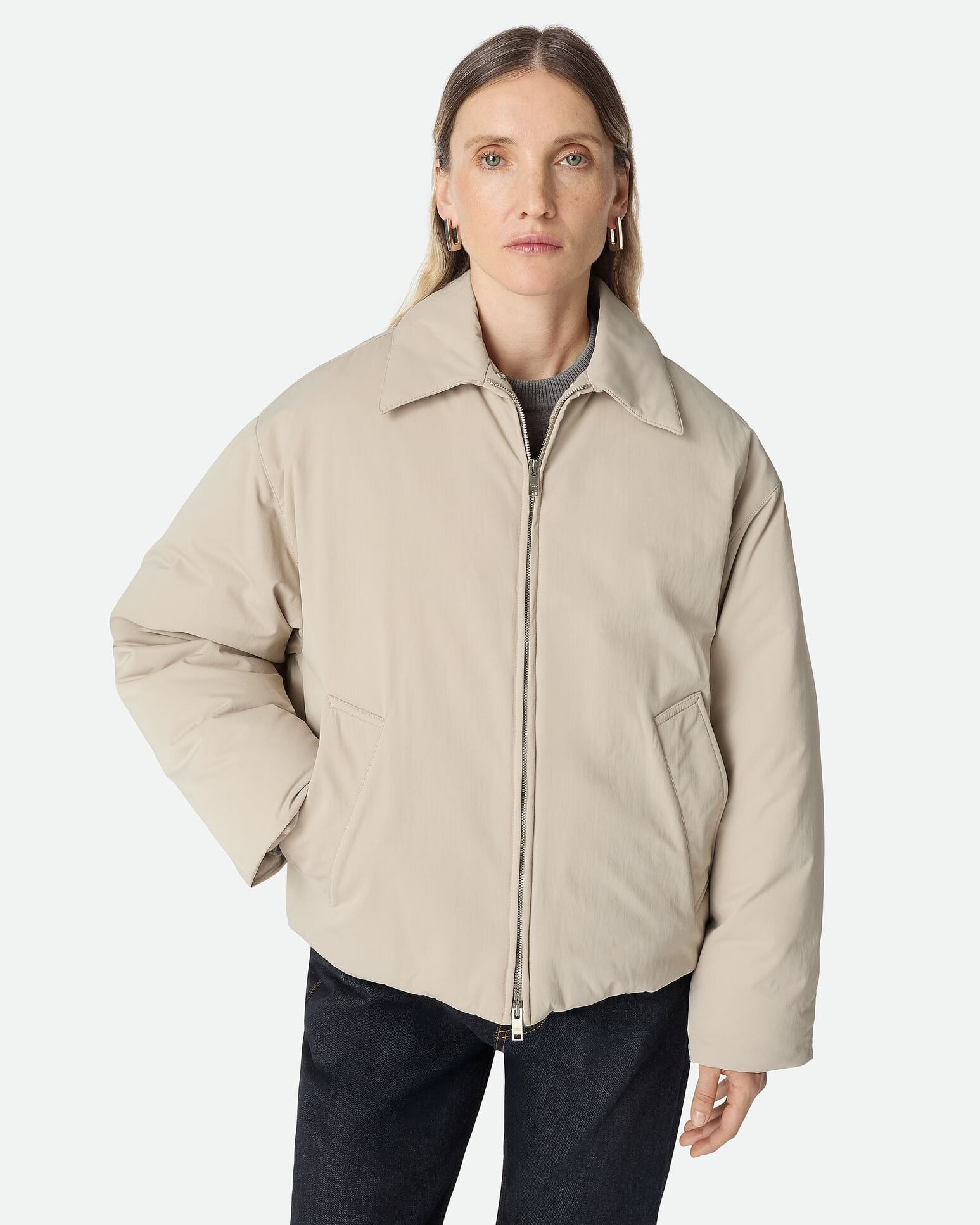 BOTTEGA VENETA 남성 다운 재킷은 절제된 미학 속에 소재와 공예의 힘을 응축한 윈터 컬렉션 피스다. 은은한 아이보리 화이트 컬러의 고급 원단 위에 화이트 구스다운을 충전해 가볍고 효율적인 보온성을 구현했으며, 군더더기 없는 실루엣으로 겨울 스타일링에 세련된 균형감을 더한다. 과장 없는 라인과 정제된 비율이 어우러져, 단정하면서도 깊이 있는 젠틀 무드를 완성한다.