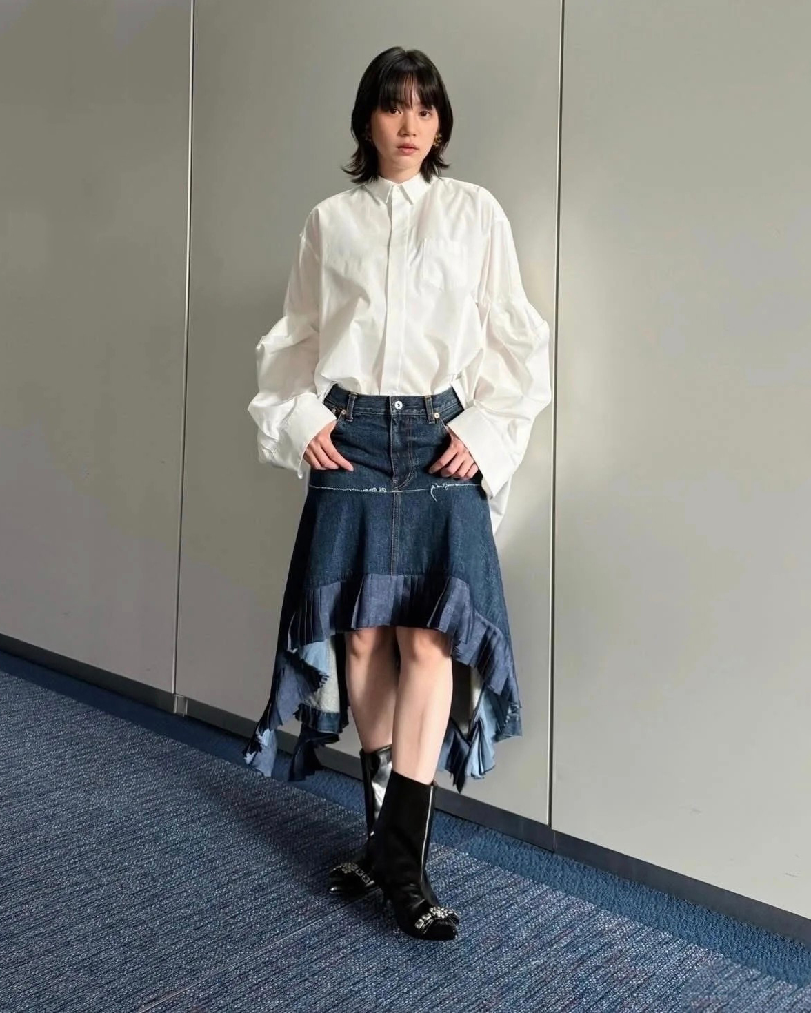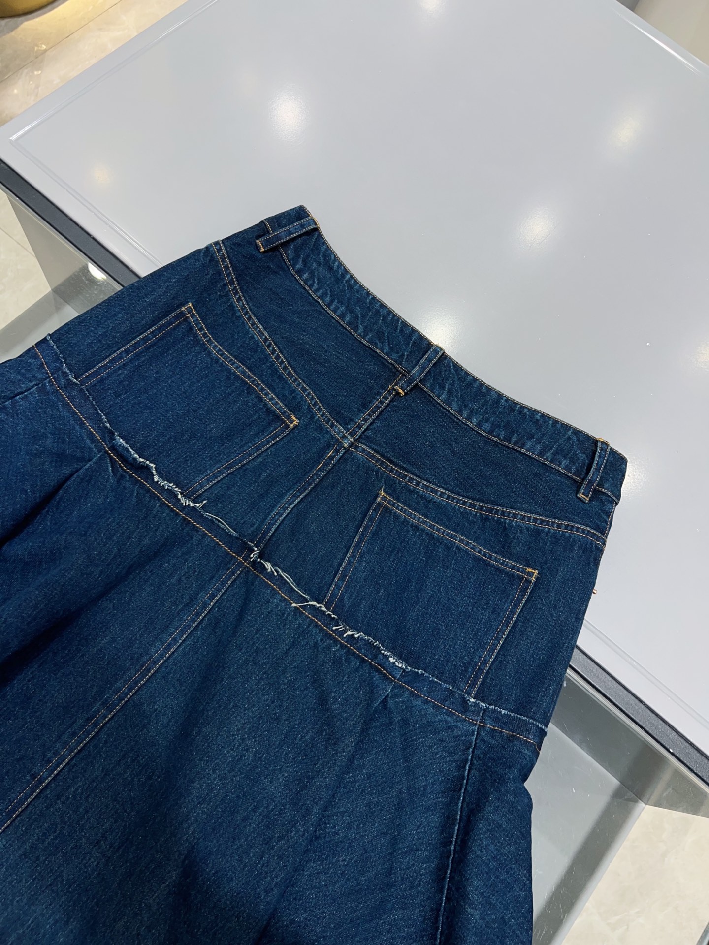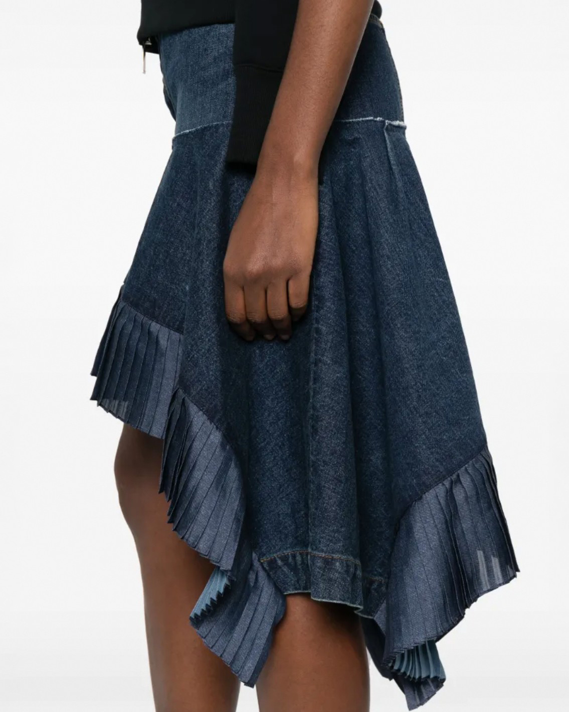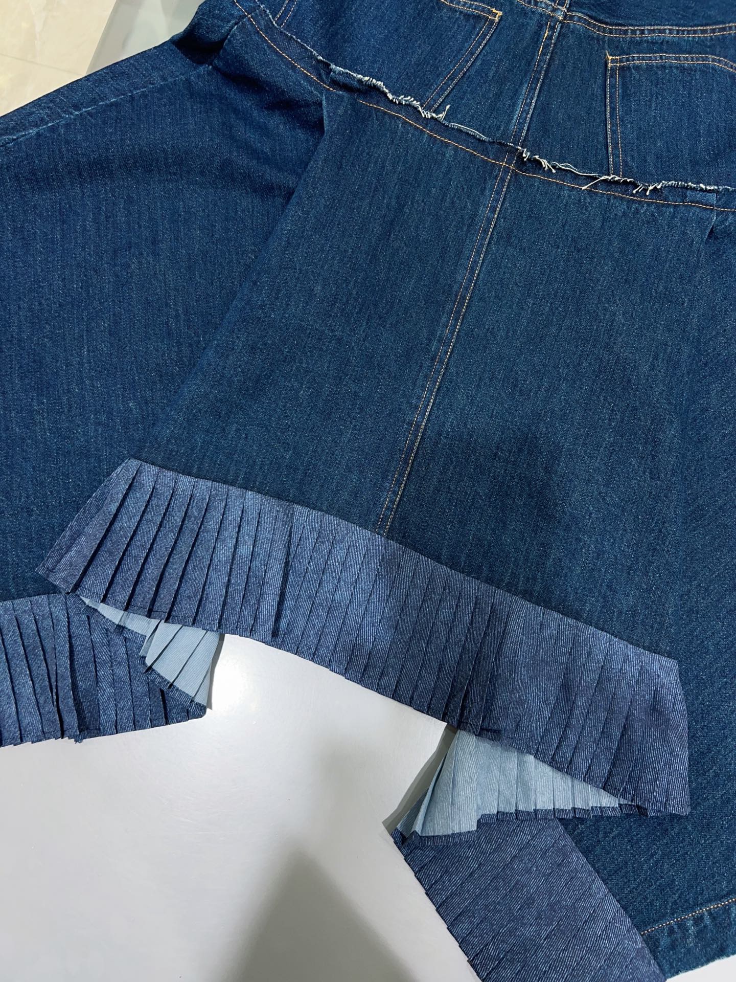 디자인: 언밸런스한 매력이 돋보이는 하이웨이스트 데님 스커트입니다. 전면은 짧고 후면은 긴 비정형적인 피쉬테일 헴라인이 걸음마다 역동적이고 우아한 실루엣을 연출합니다. 컷오프 디테일의 러프한 마감과 섬세한 플리츠 레이어드가 조화를 이루어 아방가르드하면서도 세련된 무드를 완성합니다.