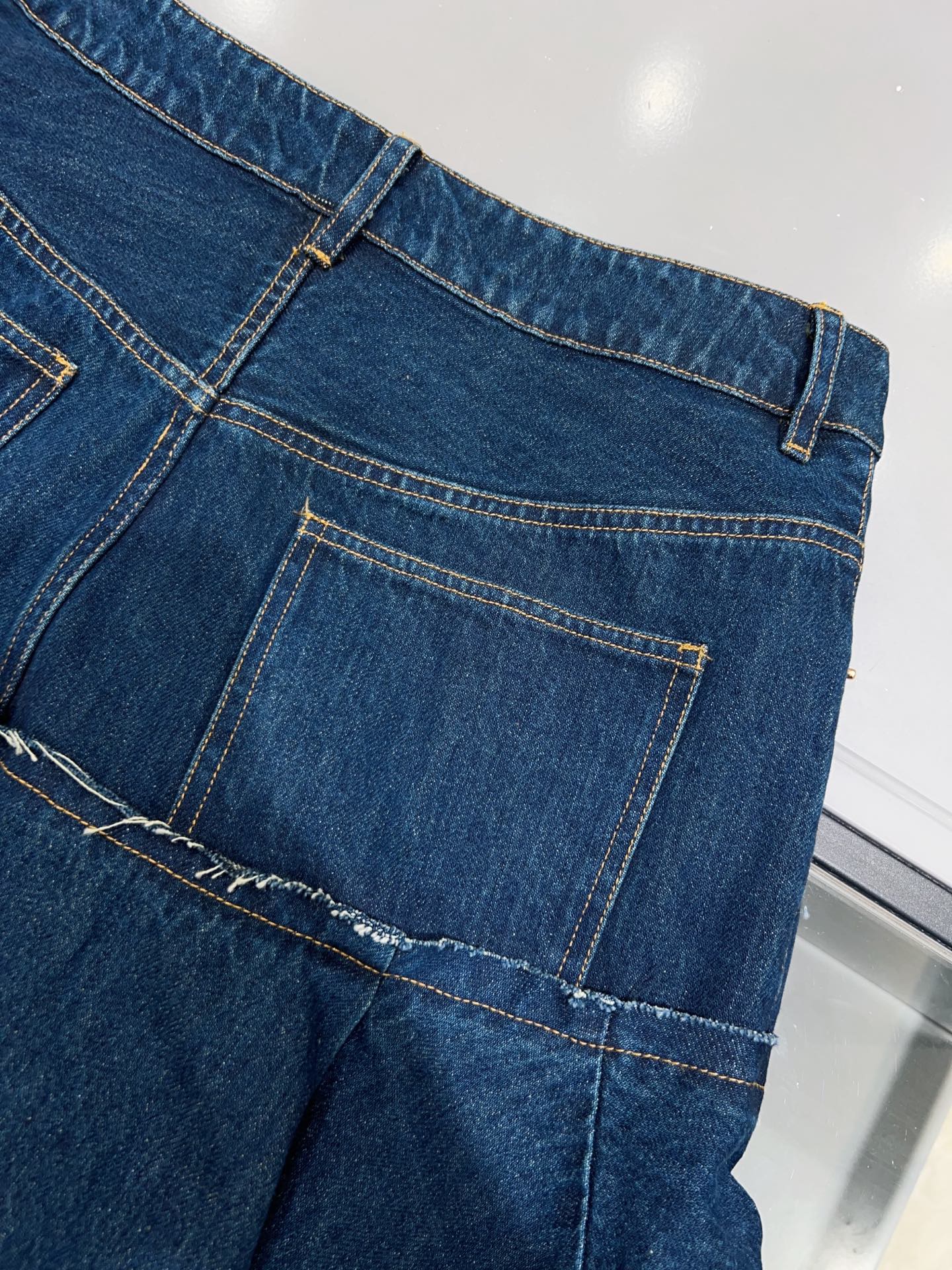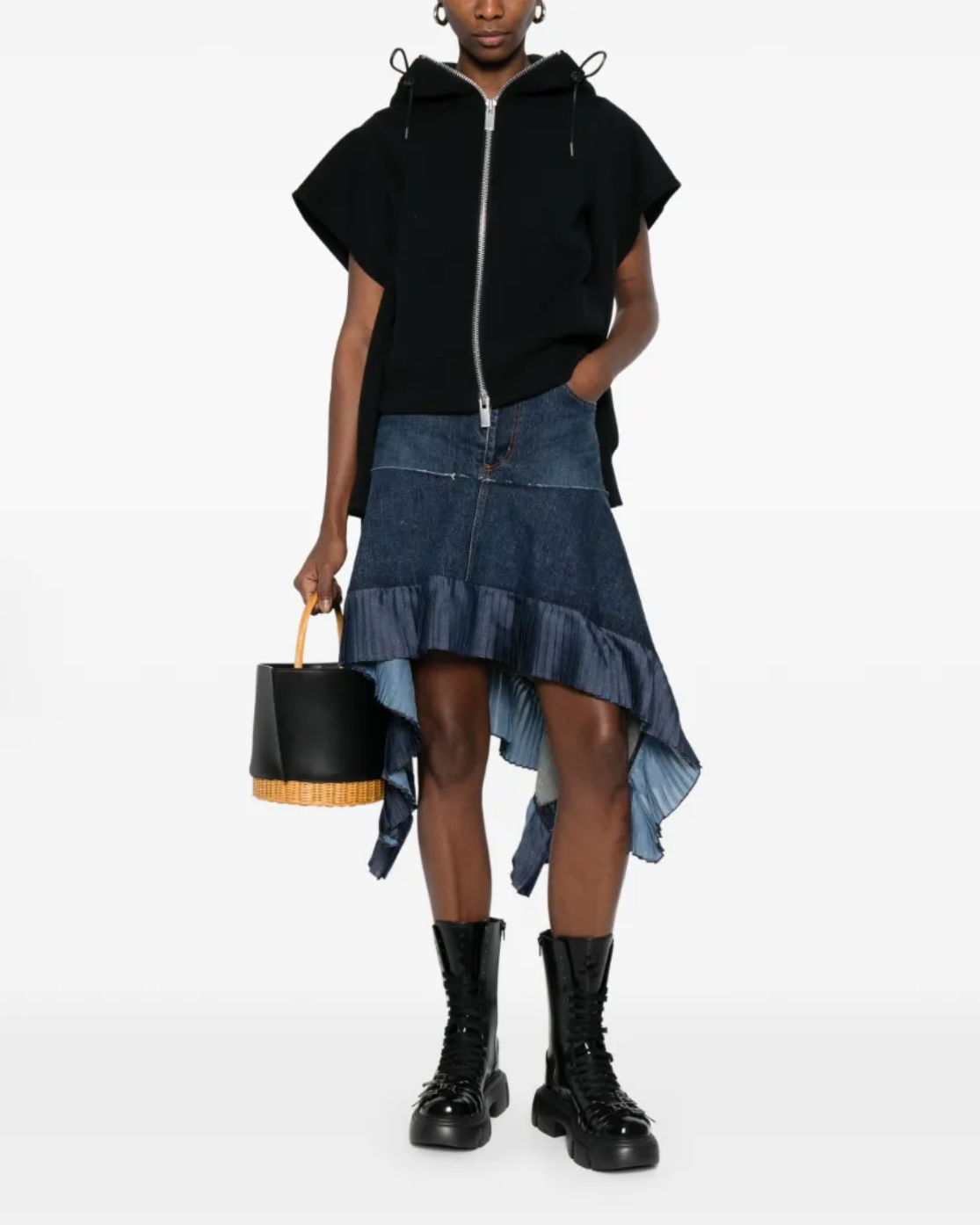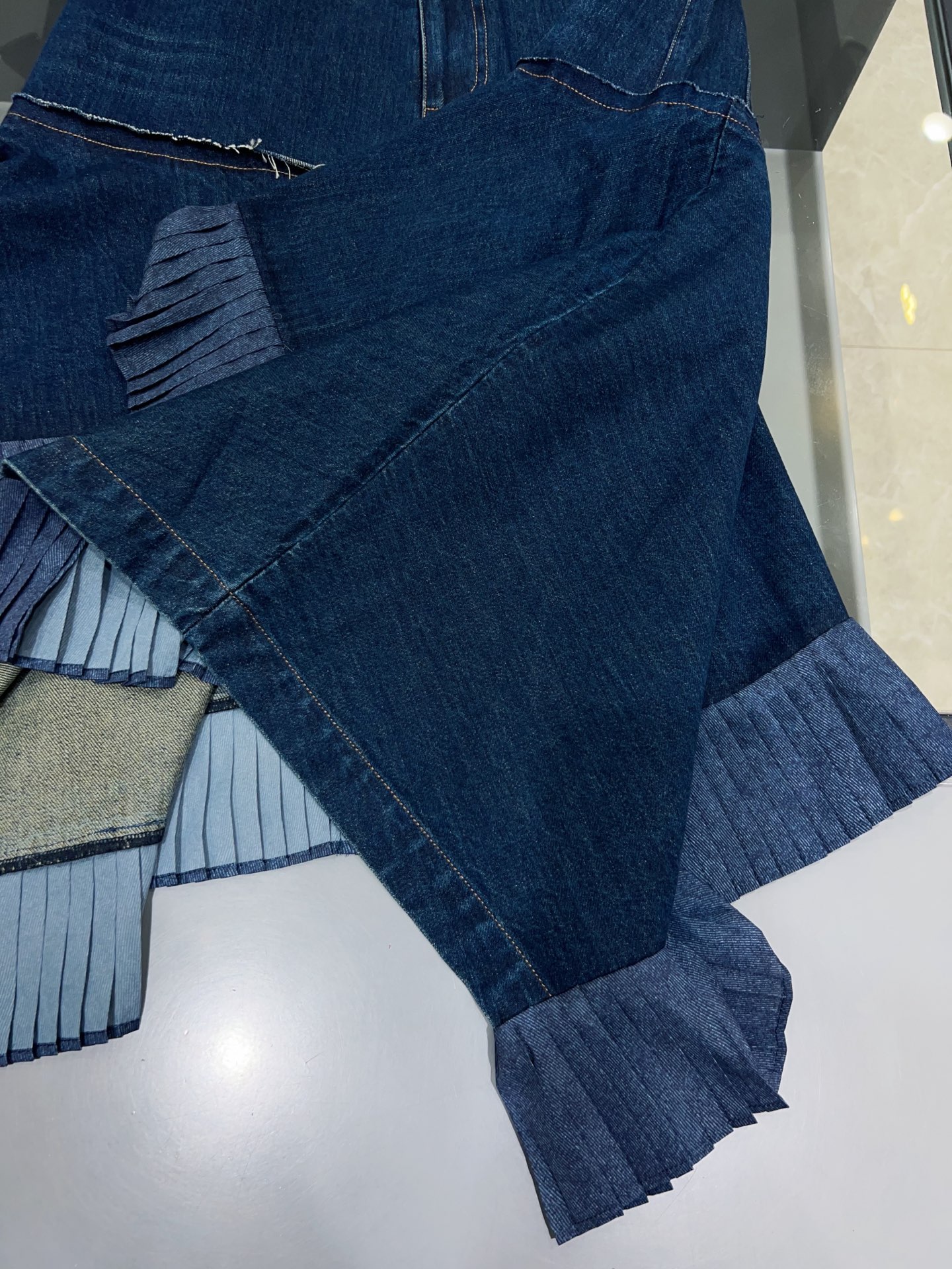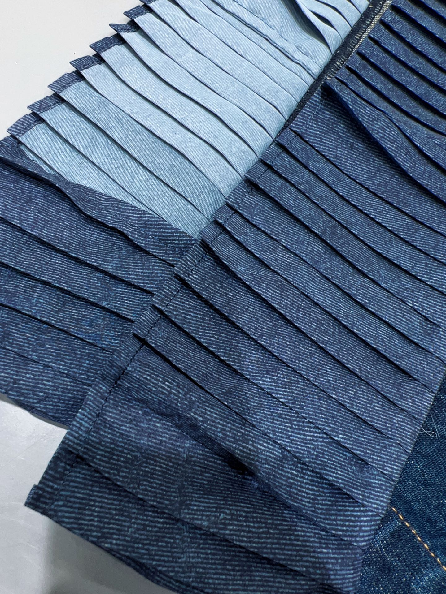 디자인: 언밸런스한 매력이 돋보이는 하이웨이스트 데님 스커트입니다. 전면은 짧고 후면은 긴 비정형적인 피쉬테일 헴라인이 걸음마다 역동적이고 우아한 실루엣을 연출합니다. 컷오프 디테일의 러프한 마감과 섬세한 플리츠 레이어드가 조화를 이루어 아방가르드하면서도 세련된 무드를 완성합니다.