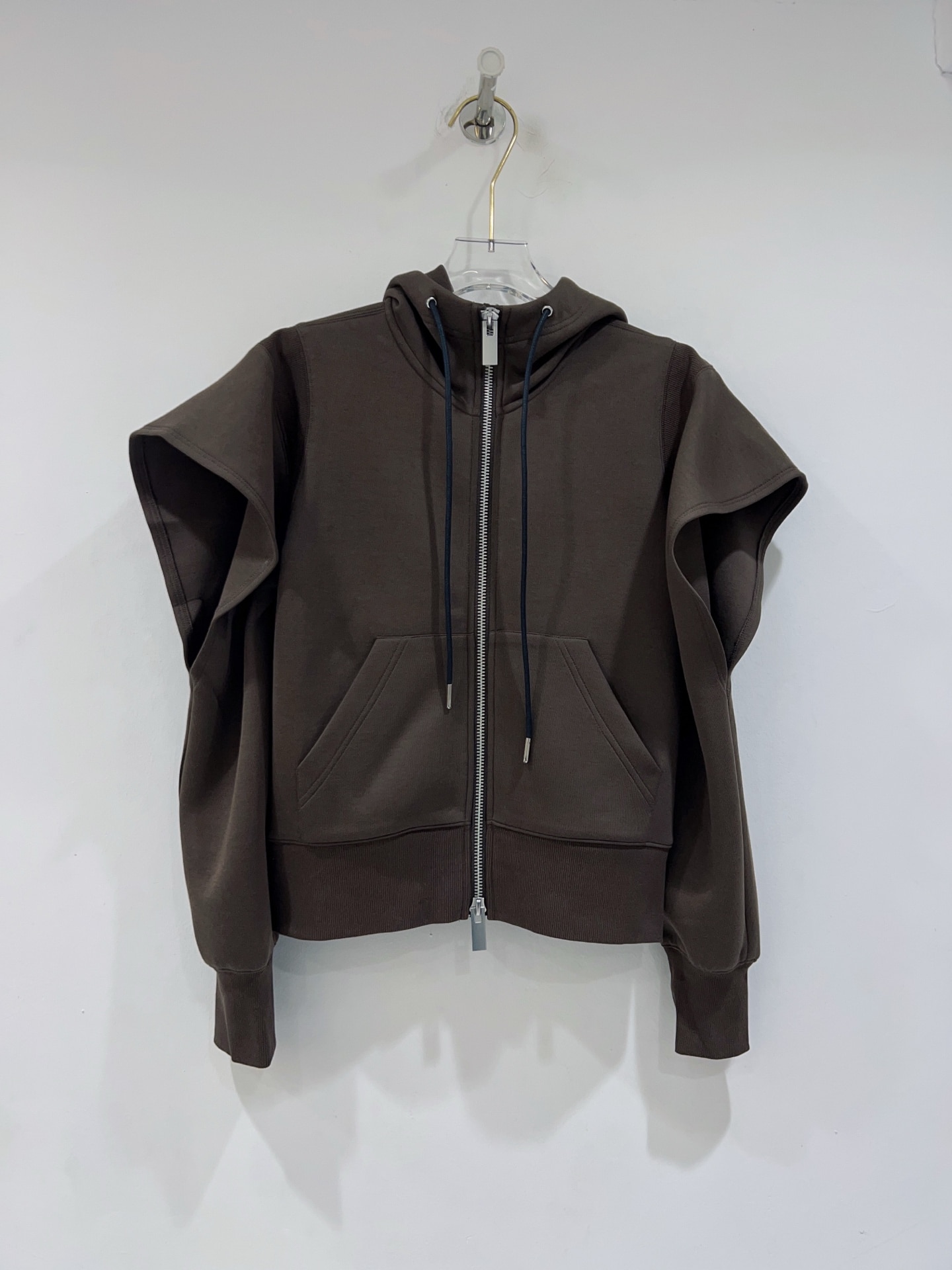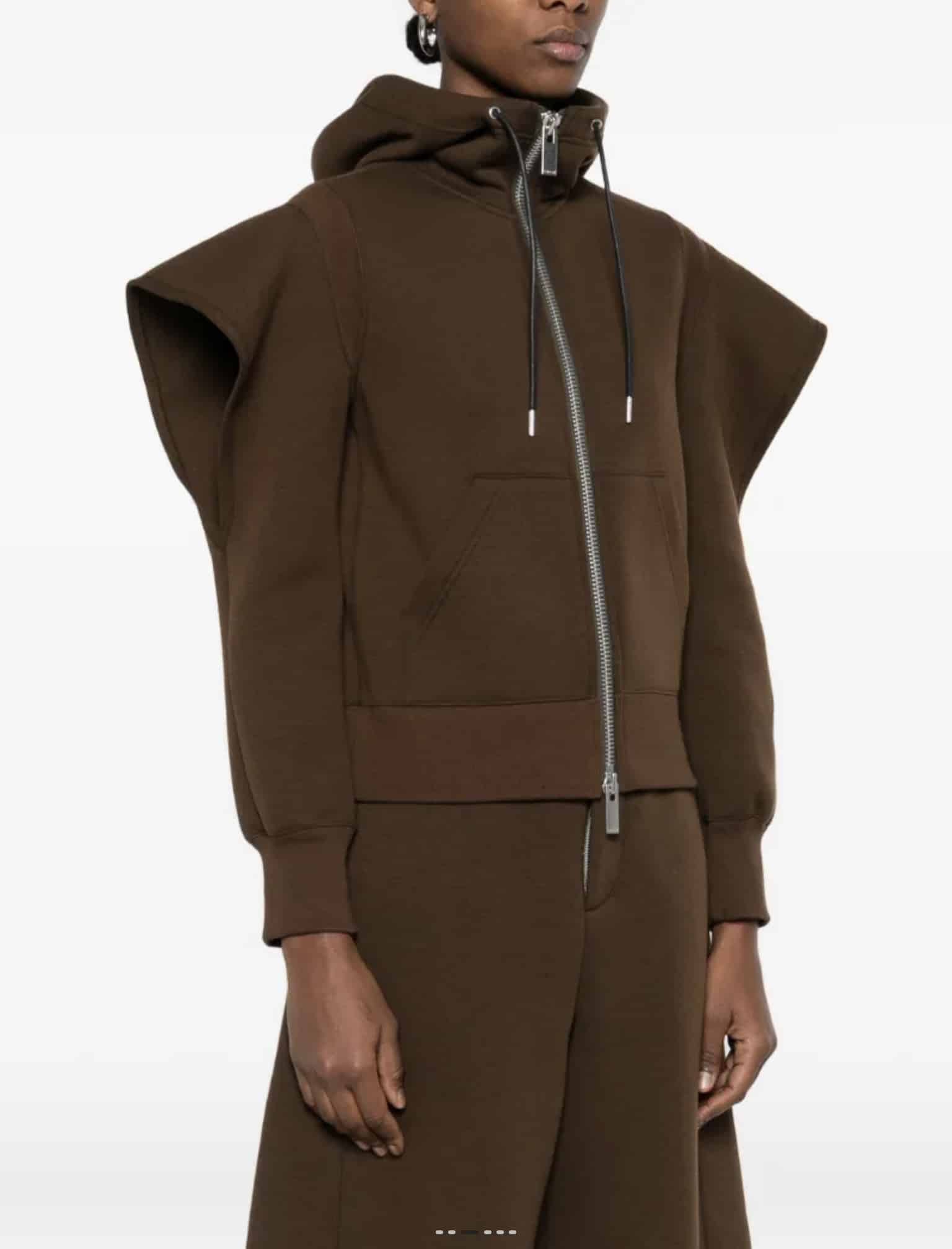 사카이 특유의 대담하고 혁신적인 디자인이 돋보이는 후드 집업 자켓입니다. 일반적인 후디의 틀을 깨고 어깨 라인부터 소매까지 이어지는 입체적인 컷아웃(Cut-out) 디테일과 볼륨감 있는 실루엣을 통해 독창적인 스타일을 완성했습니다.
