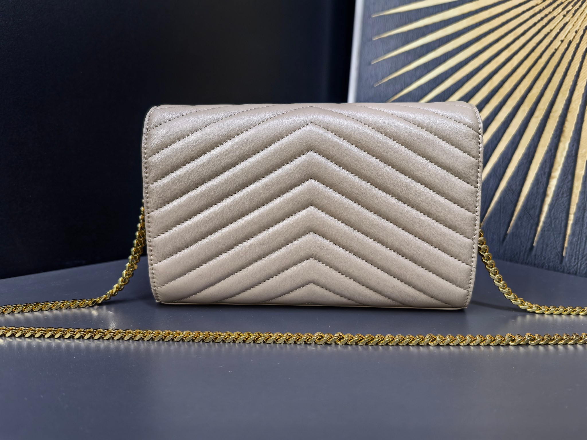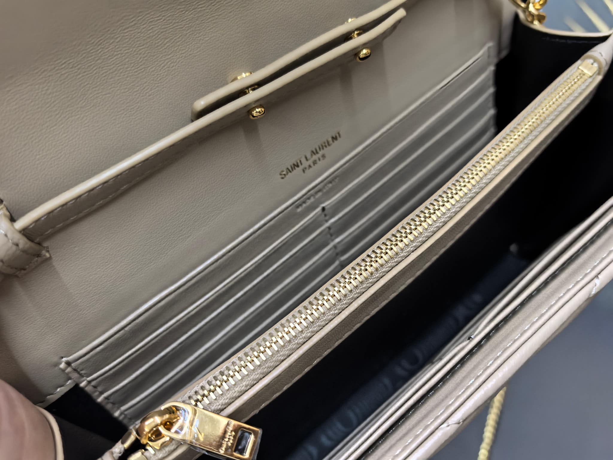특징: 카산드르 로고와 퀼팅 스티치가 돋보이는 클래식한 디자인입니다. 내부에 지퍼 포켓, 지폐 수납함, 다수의 카드 슬롯이 있어 수납력이 매우 뛰어나며 체인 스트랩은 탈부착이 가능합니다.