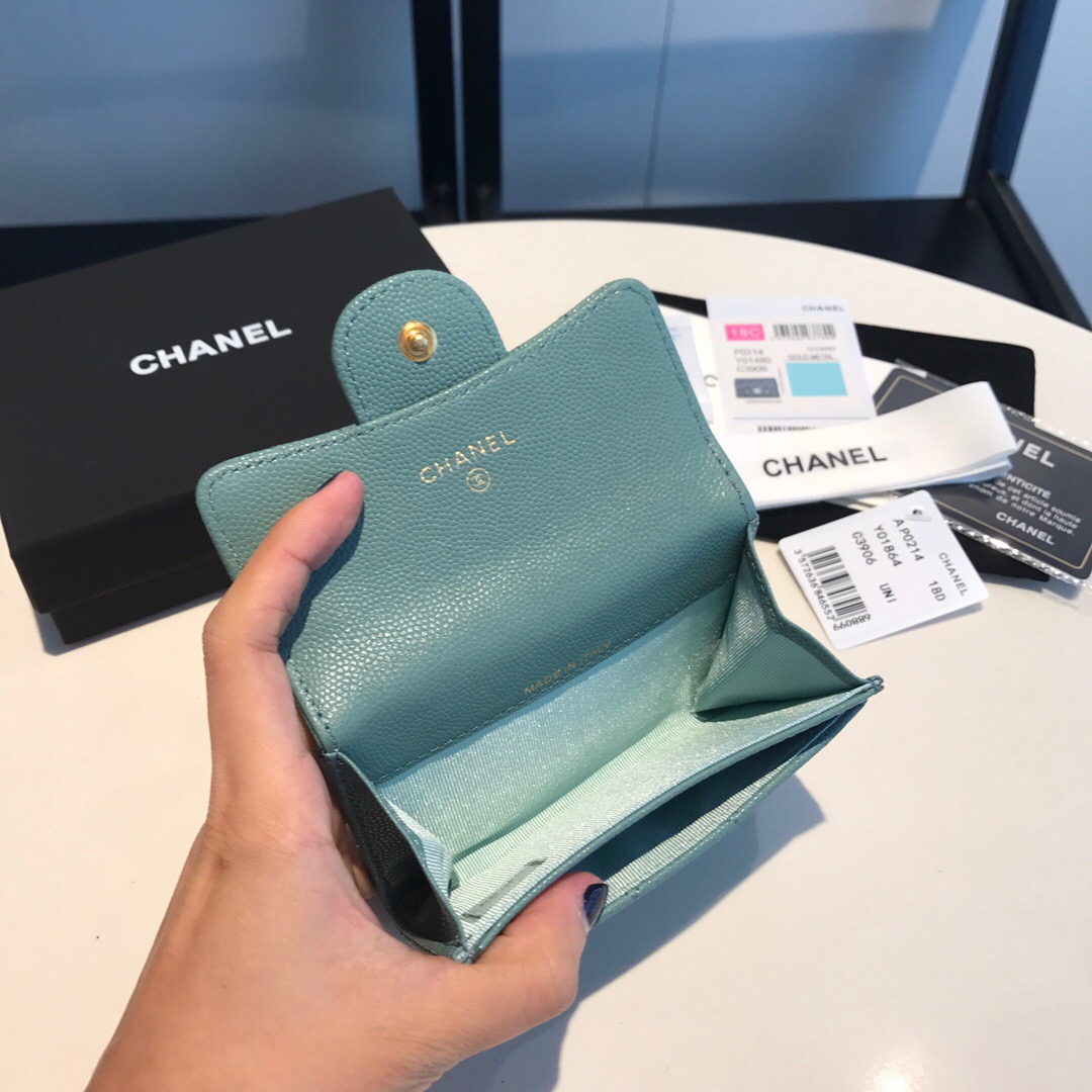 [샤넬] 클래식 똑딱이 플랩 카드 지갑 캐비어 민트 AP0214