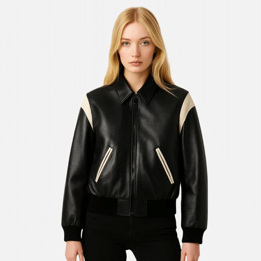 클래식한 테디(바시티) 재킷 실루엣을 기반으로 한 디자인으로, 셔츠 칼라와 전면 지퍼 클로징이 더해져 세련되고 현대적인 무드를 완성한다. 어깨와 암홀 부분에는 대비되는 컬러의 레더 패널을 적용해 디자인에 입체감을 더했으며, 스포티한 감성과 함께 아이코닉한 스타일을 연출한다.