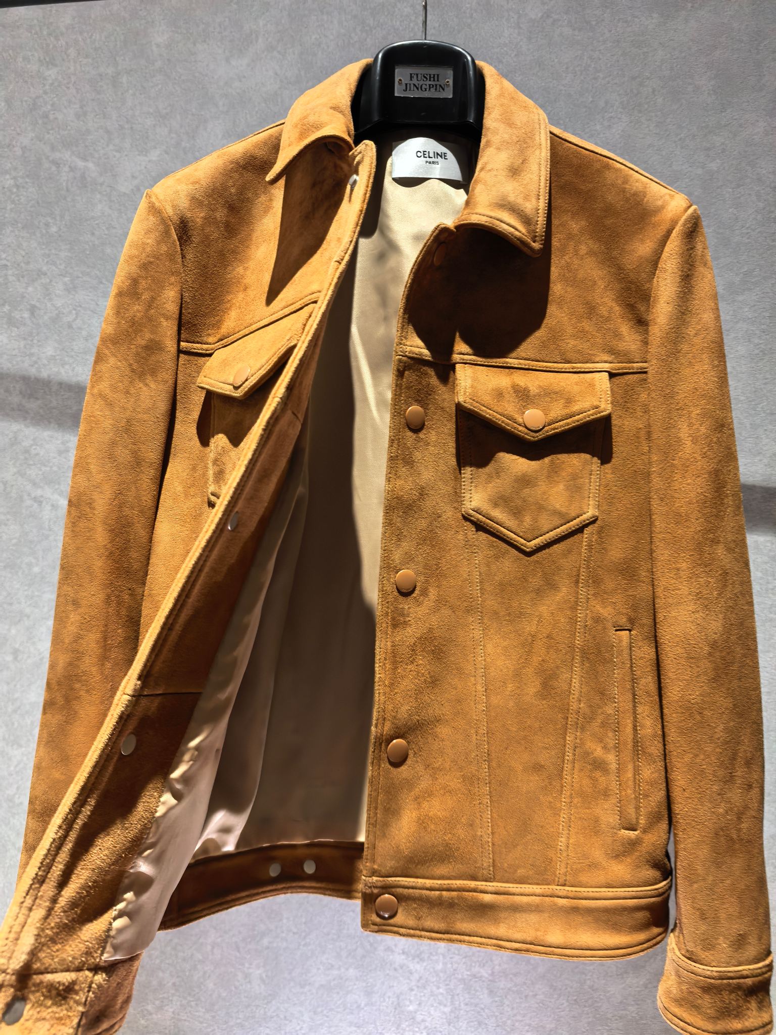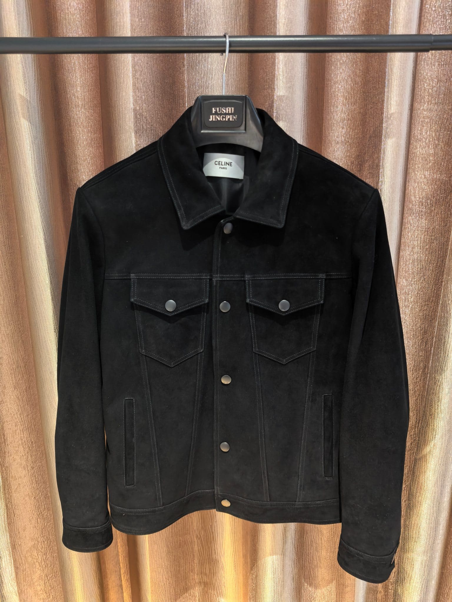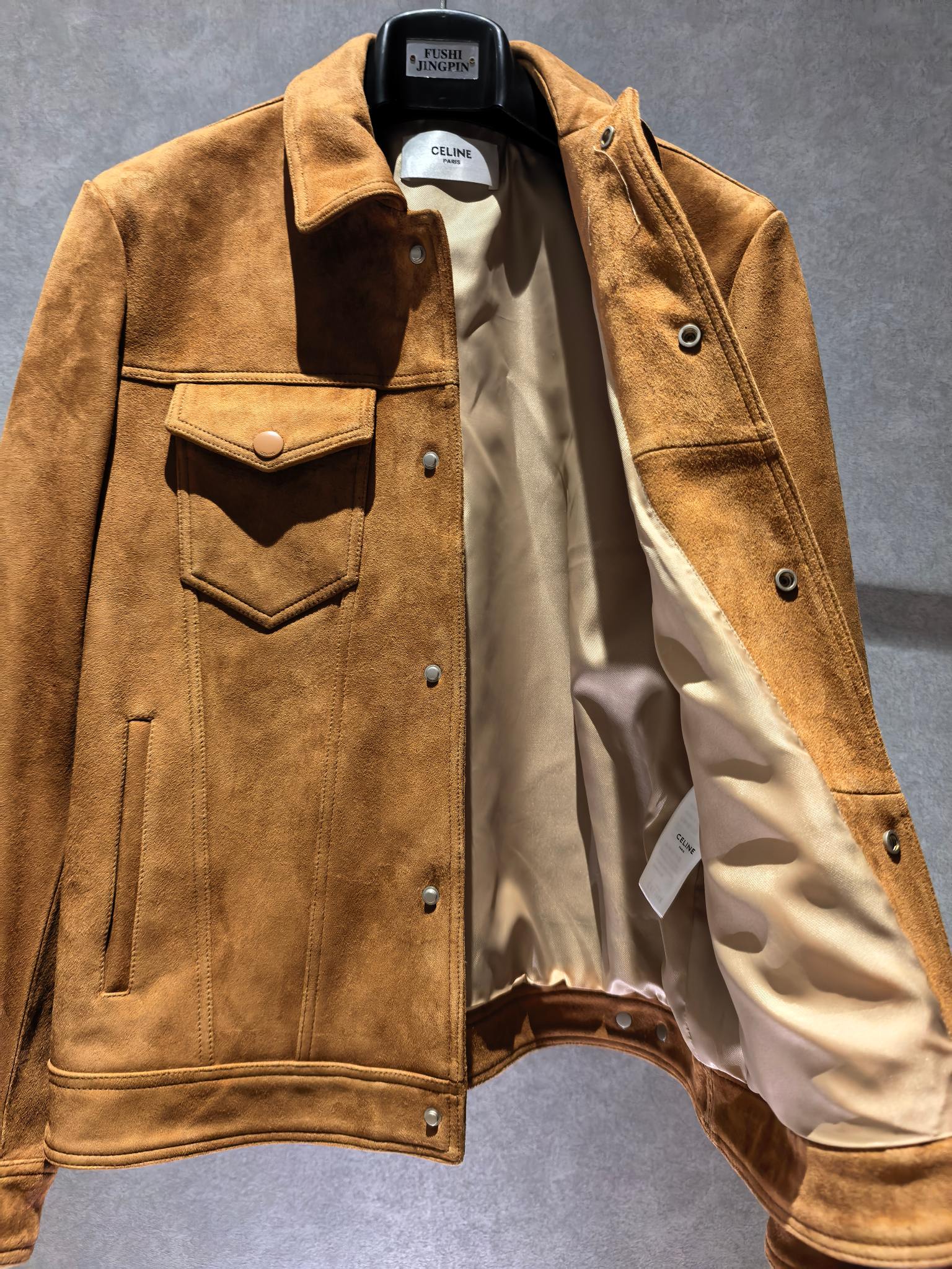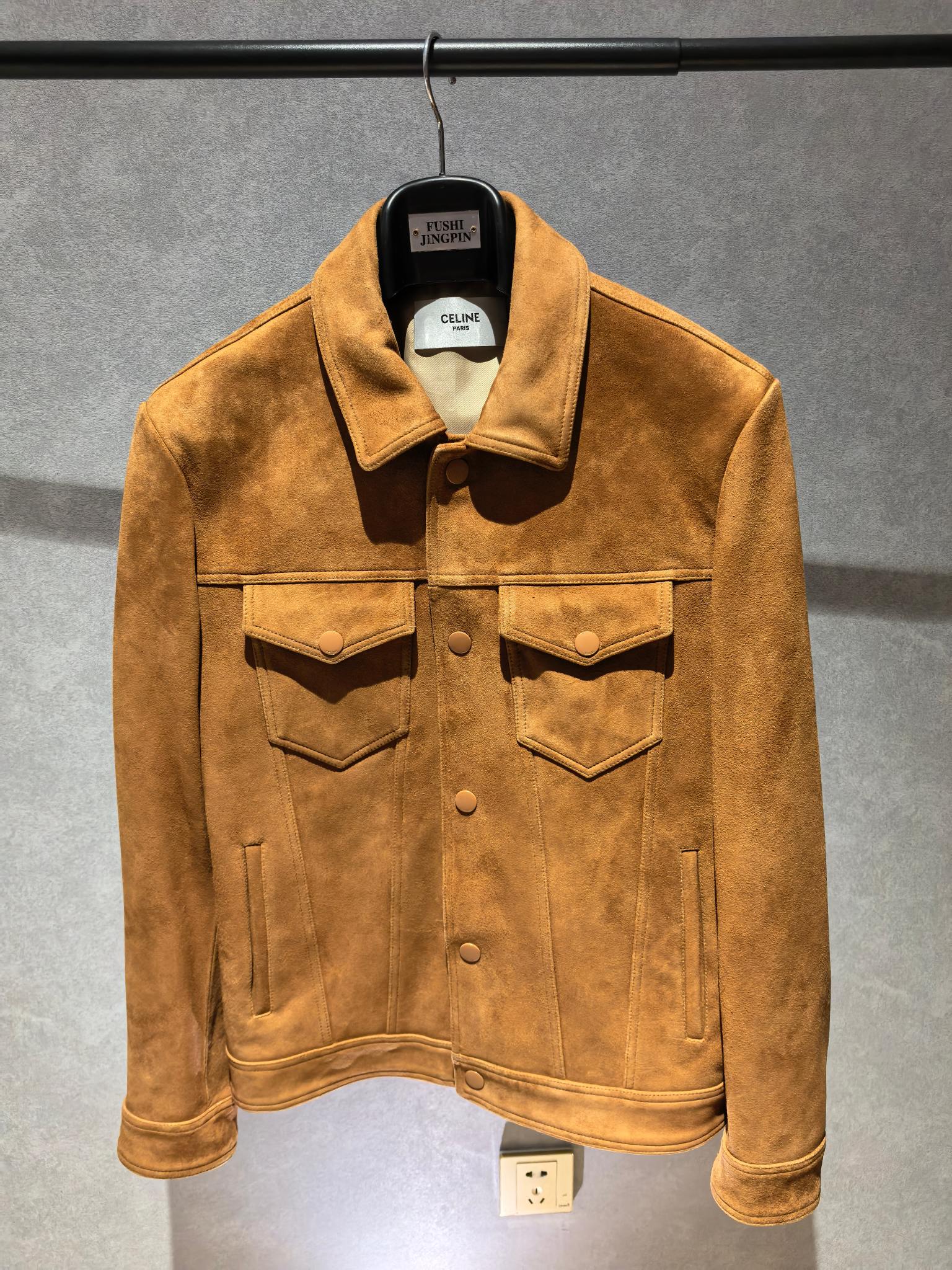 CELINE 25SS 컬렉션의 감각적인 스웨이드 레더 재킷으로, 클래식한 트러커 재킷 디자인을 기반으로 한 세련된 남성 아우터 아이템이다. 부드러운 터치감과 깊이 있는 질감이 돋보이는 프리미엄 스웨이드 가죽을 사용해 고급스럽고 자연스러운 분위기를 연출한다.