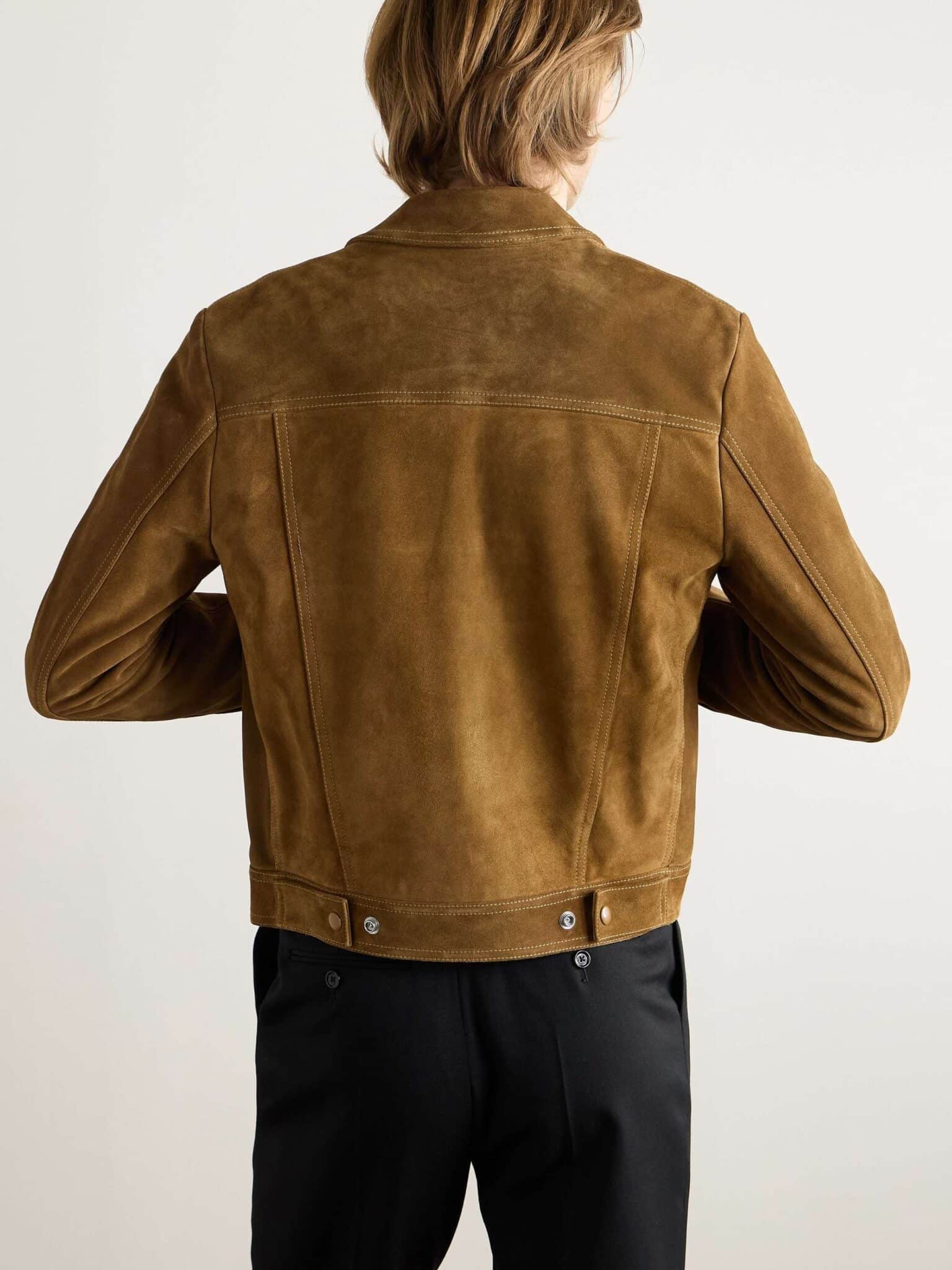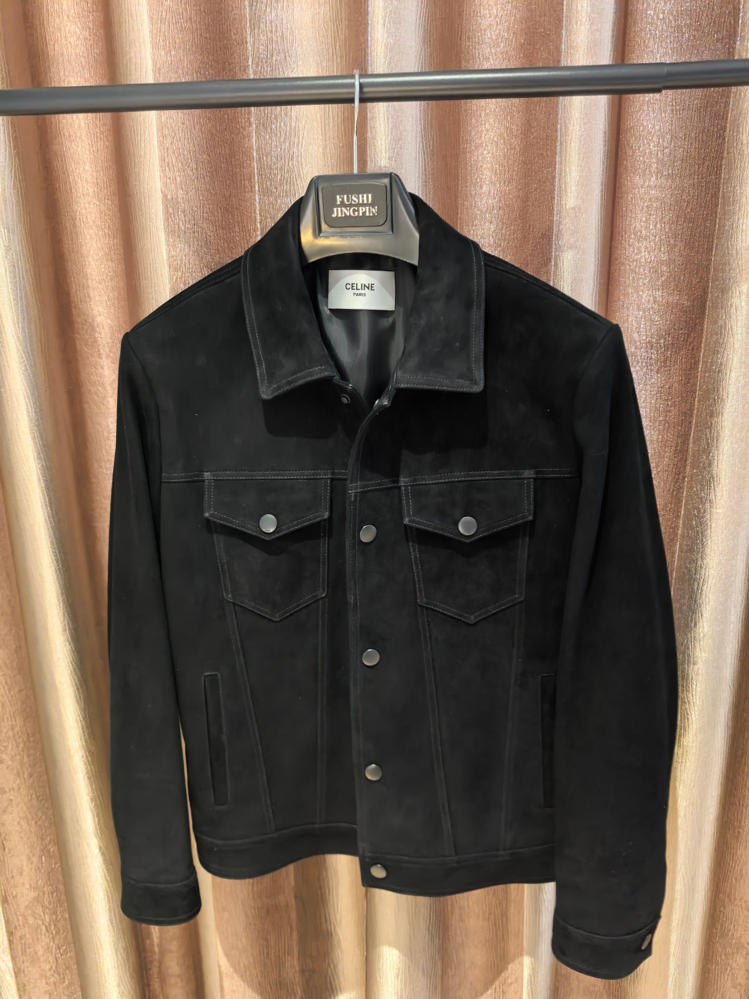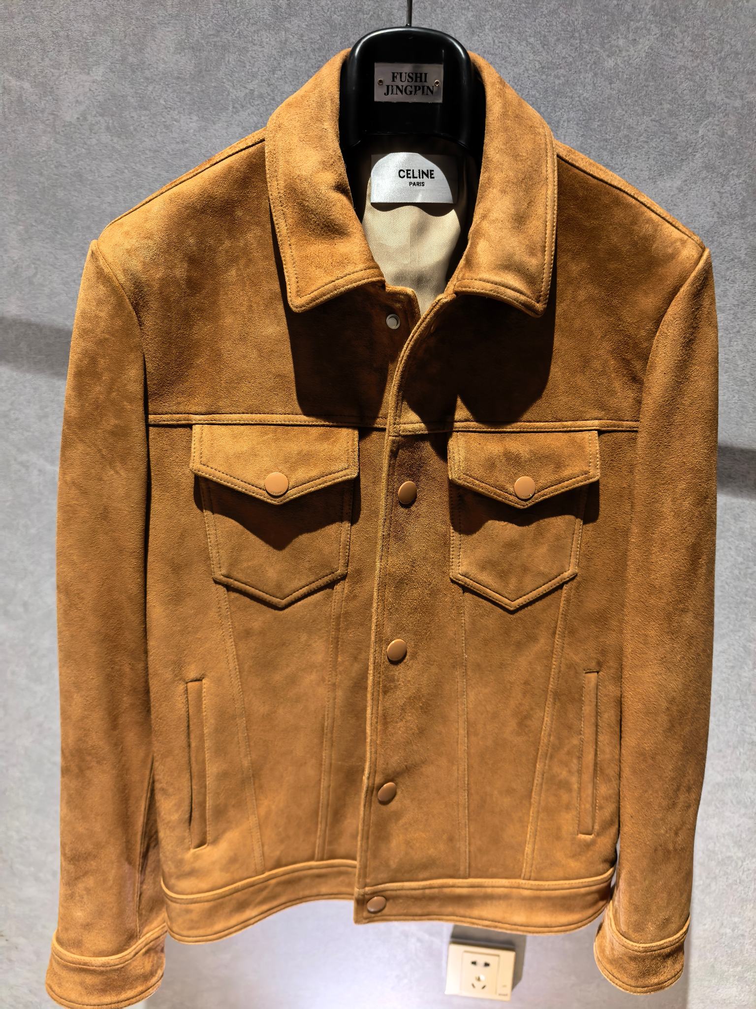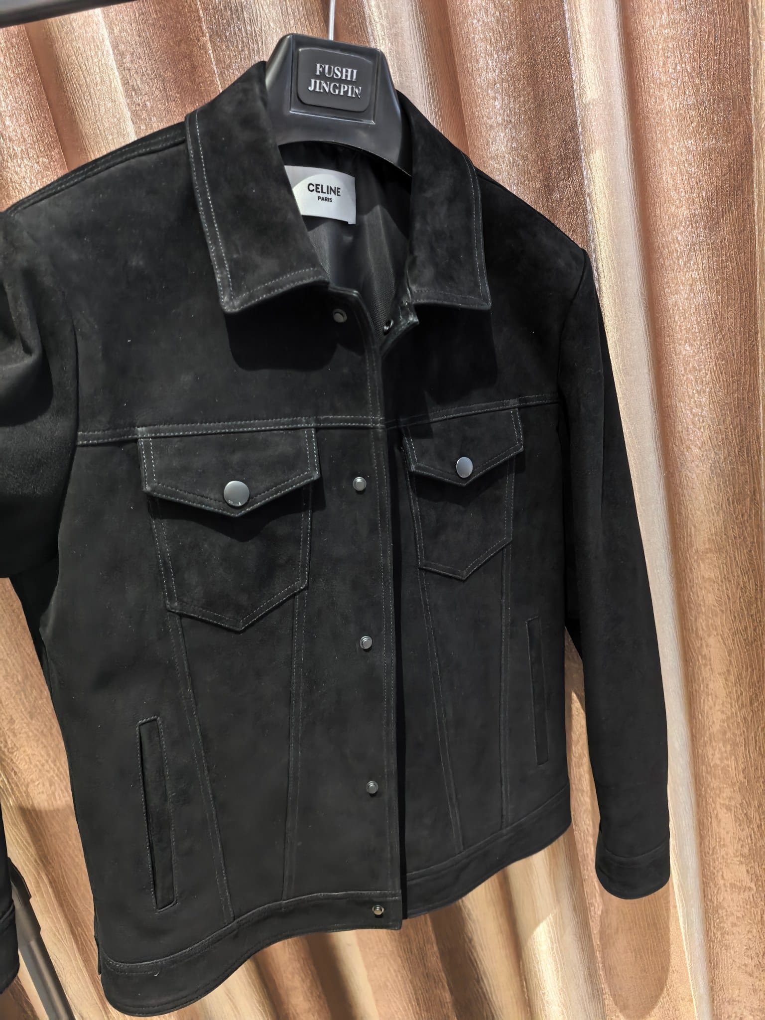 CELINE 25SS 컬렉션의 감각적인 스웨이드 레더 재킷으로, 클래식한 트러커 재킷 디자인을 기반으로 한 세련된 남성 아우터 아이템이다. 부드러운 터치감과 깊이 있는 질감이 돋보이는 프리미엄 스웨이드 가죽을 사용해 고급스럽고 자연스러운 분위기를 연출한다.
